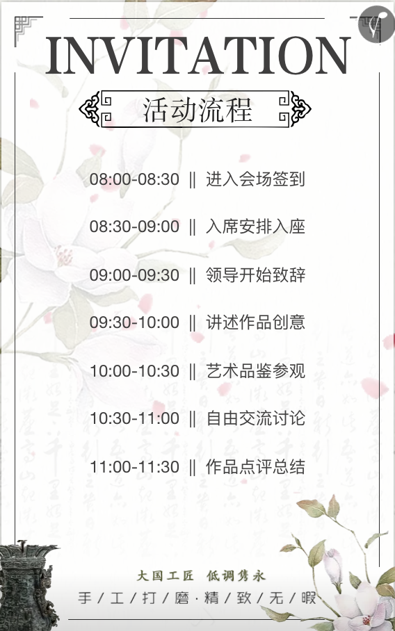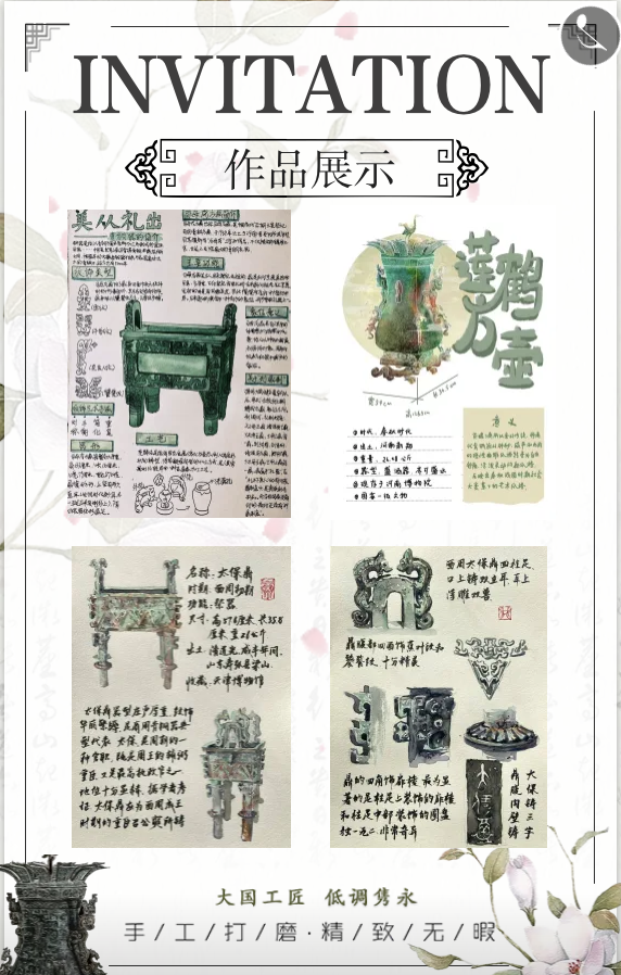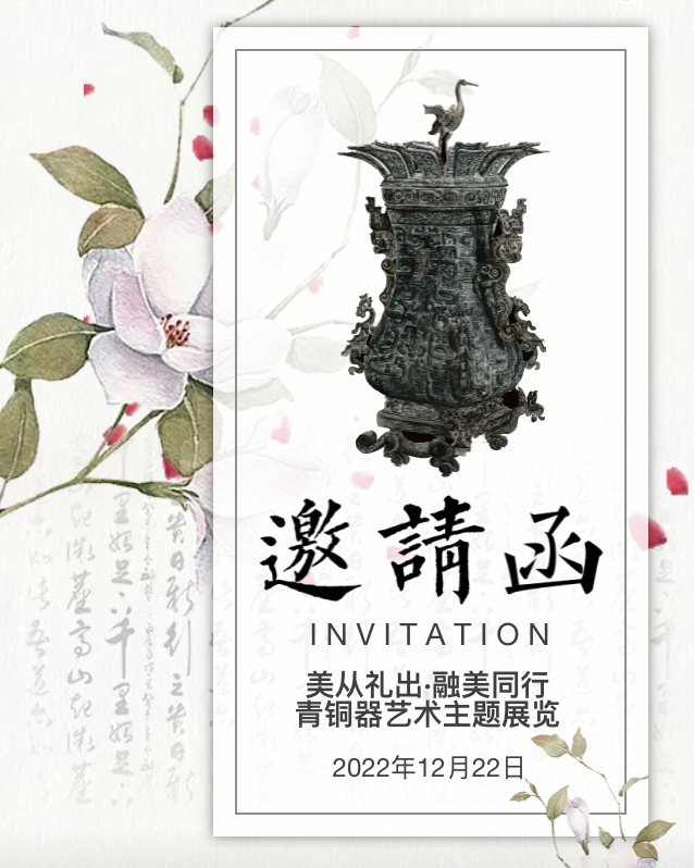 尊敬的嘉宾: 美从礼出·融美同行--青铜器文创艺术作品展将于2022年12月22日上午9:00在天津市第二耀华中学展厅隆重举行,届时又会是一场激活文物,让它说话,让历史发生,让文化传递,让它“活”起来,让它“火”起来的盛会。 时间:2022年12月22日|AM: 09:00 地址:天津市东丽区登州南路98号 大国工匠 低调隽永 手/工/打/磨·精/致/无/暇   点击查看更多精美电子邀请函模板 https://store.eqxiu.com/?utm_id=10649&keywordid={keywordid}&utm_source=wps