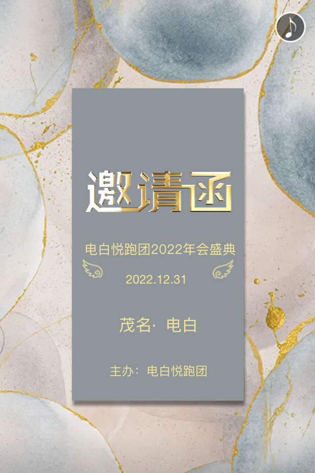 -诚挚邀请- 尊敬的各位先生、女士: 电白悦跑团全体成员诚挚的邀请您参加我们2022年会盛典!您的光临是对我们跑团最好的鼓励和支持! 电白悦跑团 仰首是春、俯首成秋,又到了电白悦跑跑团年会盛典的时刻,我们深知在团队建设的道路上离不开您的合作与支持,天下跑者一家亲,我们期待与您一起分享对新年的期盼。在此诚挚邀请您参加电白悦跑团举办的年度总结会,与您共庆!  点击查看更多精美电子邀请函模板 https://store.eqxiu.com/?utm_id=10649&keywordid={keywordid}&utm_source=wps