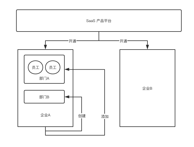 平台下的企业由平台根据业务场景开通,企业员工账号可以由企业自行添加,也可以由平台自动同步; 平台管理员拥有平台下企业全局视角,各企业之间的数据相互隔离;