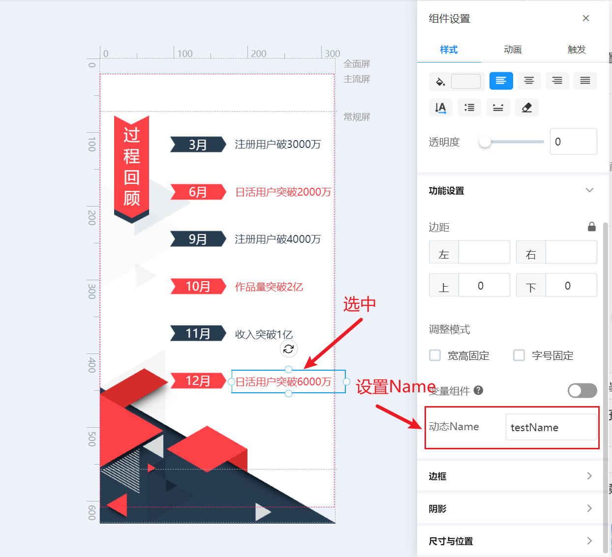 > 根据元素Name动态替换作品数据。目前支持对文本、图片以及二维码元素的内容替换。 # 使用步骤 1. 使用H5编辑器设计一个模板作品; 2. 给需要动态替换的元素设置Name属性; 3. 调用“动态参数配置”接口进行配置; 4. 访问作品详情页的URL携带参数dataId; # 配置说明 - name属性设置: 进入H5作品编辑 -> 选中对应元素 -> 高级 -> Name赋值 - 操作演示截图如下:  # 接口说明 ## 动态参数配置 - 接口地址:/api/v1/editor/creation/dyn/data/save?token=ACCESS_TOKEN - 方法类型:POST - 请求方式:multipart/form-data - 请求参数 | 参数名 | 是否必须 | 参数类型 | 参数说明 | | --- | --- | --- | --- | | creationId | 必须 | Integer | 作品Id | | dataId | 必须 | String | 动态参数id,长度在32位以内。同一个作品可以有多个dataId。在访问作品详情页时携带。 | | 元素name(如上图中的introduce) | 否 | String | 至少有一个。key为在编辑器中配置的Name名,value为改元素要替换的值。 | - 补充说明 1. 若需要替换多个元素,直接在请求参数传入相关name值即可: 以下为将作品ID为1000,元素Name为wxNickName的值替换为zhangsan,wxImg替换为https://asset.eqh5.com/FtGM-RuFdGH9p0gtskYmME31DiBy 的请求参数示例: ```json creationId=1000&dataId=00744fb2be924f5691c4b0dea02263a3&wxNickName=zhangsan&wxImg=https://asset.eqh5.com/FtGM-RuFdGH9p0gtskYmME31DiBy ``` 作品预览链接为:https://asset.eqh5.com/FtGM-RuFdGH9p0gtskYmME31DiBy?dataId=00744fb2be924f5691c4b0dea02263a3 2. 传入的元素值请自行注意类型匹配。目前支持三种类型的元素替换。 (1)图片,要替换的内容为图片的url。需能在公网正常访问且支持跨域。 (2)文本,要替换的内容为文本内容。 (3)二维码。在编辑器配置二维码的编辑方式有两种,自动生成和手动上传。自动生成时传二维码的文本内容,手动上传时传二维码的图片地址。 - 正确时返回: ```json { "success": true, "code": 200, "msg": "操作成功" } ``` ● 错误时返回: ```json { "success": false, "code": "B000005", "msg": "数据不存在" } ``` ## 动态参数查询 - 接口地址:/api/v1/editor/creation/dyn/data/list?token=ACCESS_TOKEN - 方法类型:GET - 请求参数 | 参数名 | 是否必须 | 参数类型 | 参数说明 | | --- | --- | --- | --- | | creationId | 必须 | Integer | 作品Id | - 正确时返回: ```json { "success": true, "code": 200, "msg": "操作成功", "list": [ { "creationId": 1000, "dataId": "00744fb2be924f5691c4b0dea02263a3", "createTime": "2021-12-13 00:00:00", "updateTime": "2021-12-13 00:00:00", "dataInfo": "{\"wxNickName\":\"zhangsan\",\"wxImg\":\"https://asset.eqh5.com/FtGM-RuFdGH9p0gtskYmME31DiBy?imageView2/0/w/999/h/999\"}" } ] } ``` - 错误时返回: ```json { "success": false, "code": "B000005", "msg": "数据不存在" } ``` ## 动态参数删除 - 接口地址:/api/v1/editor/creation/dyn/data/delete?token=ACCESS_TOKEN - 方法类型:GET - 请求参数 | 参数名 | 是否必须 | 参数类型 | 参数说明 | | --- | --- | --- | --- | | creationId | 必须 | Integer | 作品Id | | dataId | 必须 | String | 动态参数id,长度在32位以内。同一个作品可以有多个dataId。在访问作品详情页时携带。 | - 正确时返回: ```json { "success": true, "code": 200, "msg": "操作成功" } ``` - 错误时返回: ```json { "success": false, "code": "B000005", "msg": "数据不存在" } ```