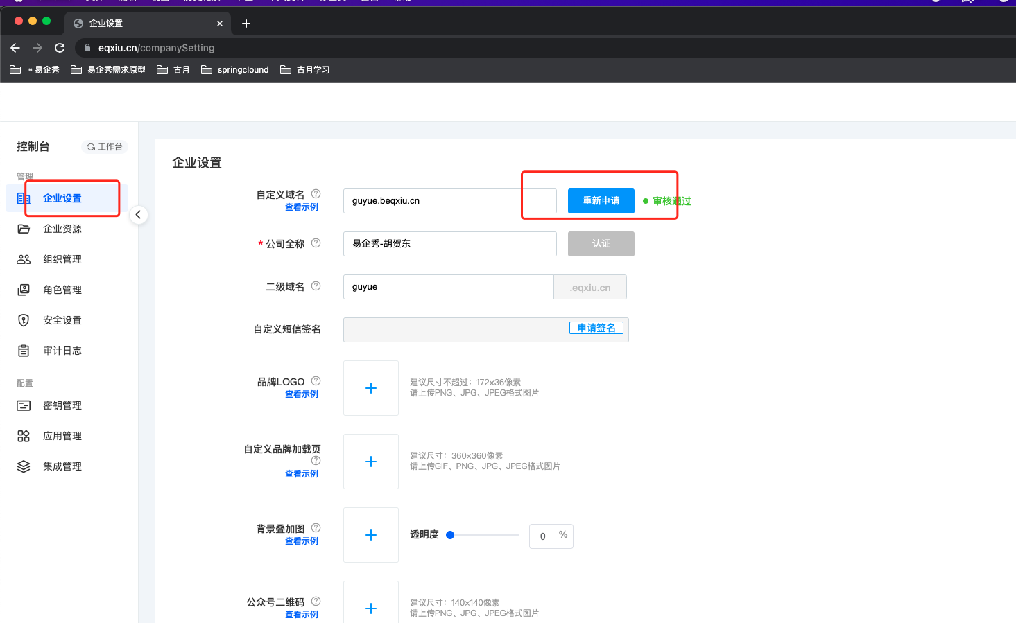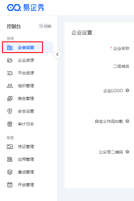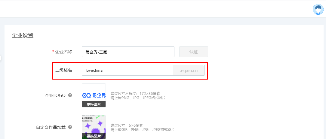 ## 自定义二级域名配置 > 客户可以根据自己的品牌名称、代码、代号等信息设置在内容中台的二级域名,二级域名可用于作品访问、接口调用等。 - 设置二级域名的方法如下: 1. 在控制台中选择“企业设置”模块  2. 在右侧面板找到“二级域名”选项,在输入框中输入二级域名前缀后,点击最下面的“保存”按钮即可完成二级域名的设置,注意二级域名仅支持英文小写字母  ## 自定域名配置 **企业想使用自己自定义域名来进行作品传播转发,可以通过如下配置设置自定义域名** - 设置自定义域名的方法如下: 1. 以企业名义,申请企业【自定义域名】,申请完成后,联系技术李老师进行配置检查 - 【客户】配置该域名的CDN 策略。回源IP为易企秀负载IP【私下告知】 - 【客户】没有CDN 配置域名解析IP为易企秀负载IP - 【易企秀】配置对应域名解析转发,以及https证书 - 【易企秀】在腾讯云对象存储添加该域名限制 2. 在控制台中选择“企业设置”模块  3. 在右侧面板找到“自定义域名”选项,在输入框中输入自定义域名,点击右侧按钮进行提交设置,联系易企秀运营对该自定义域名进行检查审核,通过后即可使用该域名进行传播转发