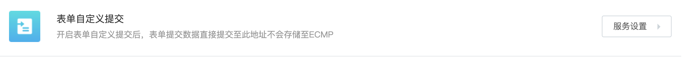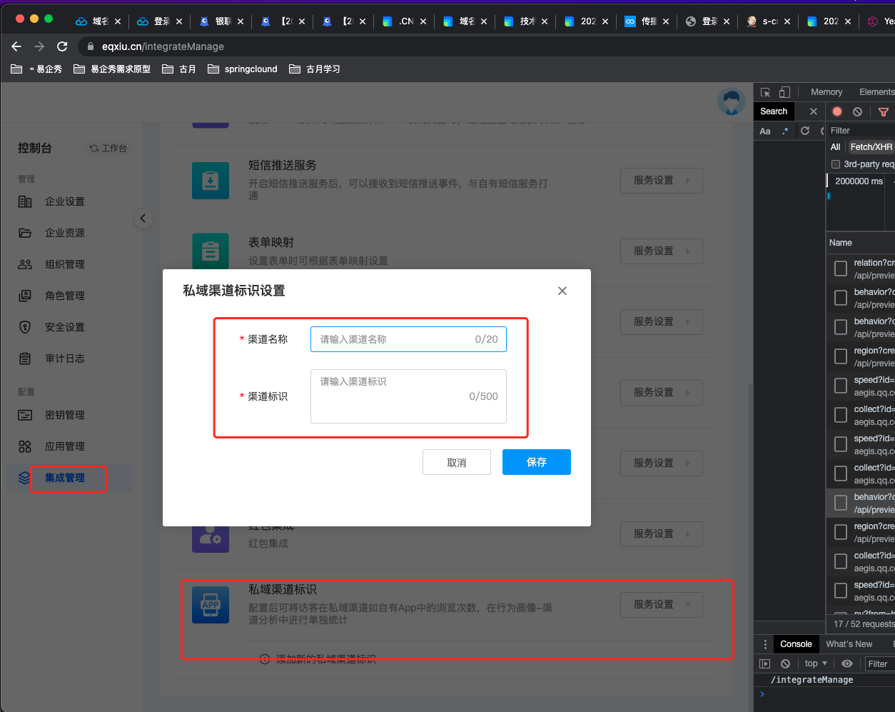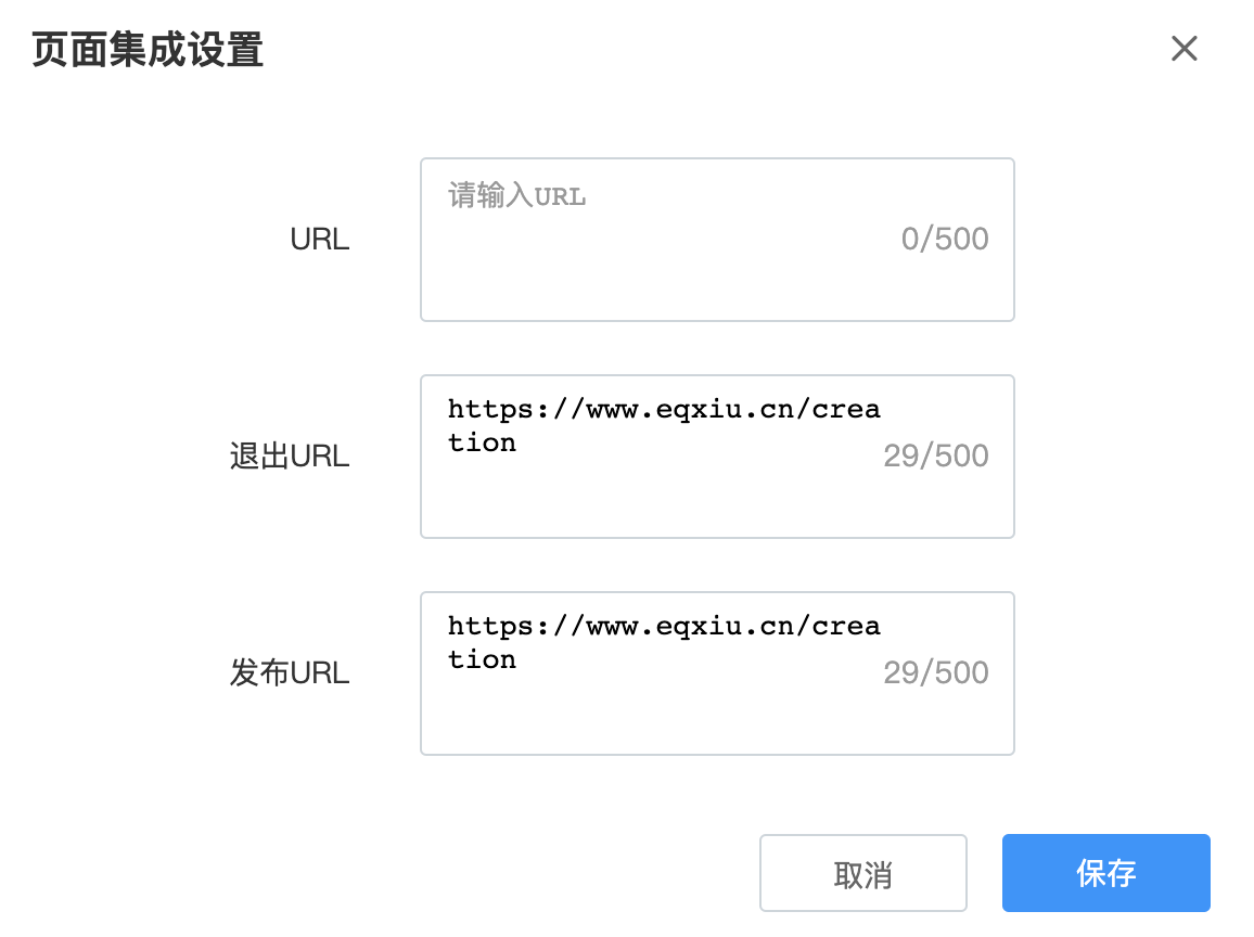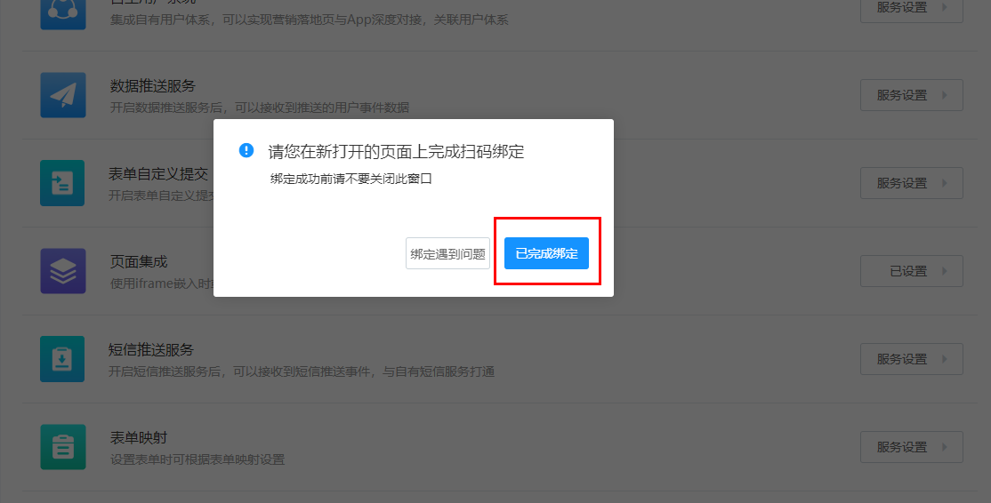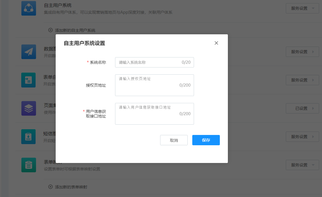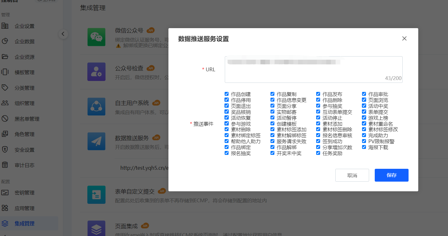 > 集成管理功能使用说明 - 企业配置入口:控制台-> 集成管理 - 平台配置入口:控制台-> 开放管理-> 配置 -> 集成配置 ## 微信公众号绑定配置 > 通过绑定微信公众号,可以实现一键发布作品,并可以在微信中传播作品时获取访客信息。 1. 找到配置项后点击面板中的“微信公众号”的“添加”按钮或点击“服务设置”下的“添加新的微信公众号”,随即打开微信公众号绑定页面”的设置、查看按钮,即可进入模态框  2. 打开腾讯微信公众号授权页面,进行扫码授权  3. 授权成功后,返回内容中台页面,点击“已完成绑定”按钮.如遇到问题可点击“绑定遇到问题”查看详细步骤  ## 自主用户系统 > 在内容中台设置访客登录授权地址和访客信息获取接口后,可以在互动作品进行访客授权登录验证,并可实现与用户系统的业务进行关联。 1. 找到配置项点击面板中的“自主用户系统”的“添加”按钮或点击“服务设置”下的“添加新的自主用户系统”  2. 在弹出的对话框中输入相关信息,点击“保存”按钮即可完成设置  3. 打开互动编辑器(新建一个互动作品或选择一个互动作品进入编辑) ## 数据推送配置 > 在内容中台设置数据推送数据,以便在相应的[事件](https://hc.eqxiu.cn/doc/16/)触发时,向该地址推送业务数据。  ## 表单自定义提交 > 该功能可以实现表单数据不经过易企秀直接提交到企业自有系统,进一步保障业务数据安全 1. 找到配置项后,点击添加按钮  2. 在弹出的对话框中当入表单接收URL  3. 表单数据接收参见接口规范; ## 页面集成配置 > 设置页面集成后的退出地址,如:登录过期、作品保存和作品发布时。 1. 找到配置项后点击“页面集成”的设置、查看按钮,即可进入模态框  2. 配置对应URL地址 三个文本框分别代表: - 登录过期时的跳转页面,无默认值; - 退出编辑器的跳转页面,有默认值; - 发布作品时的跳转页面,有默认值;  输入相应的地址后,点击“保存”按钮即可。 ## 短信服务集成配置 > 该功能目前可以实现验证码短信发送使用客户自有短信通道。支持验证码由客户生成。 1. 找到信配置项,点击添加;  2. 在弹出对话框中录入短信发送url、短验验证码校验url  3. 接口规范参见短[信集成接口](https://hc.eqxiu.cn/doc/31/ "信集成接口")。 ## 表单映射配置 > 该功能用于实现自定义表单能够和已有数据模型对应起来,方便二次加工 1. 找到配置项后点击添加按钮,可以添加多个  2. 在弹出对话框中如果是选项类型可以点击设置/修改选项进行操作  3. 在制作表单作品时可以在此选择表单映射配置,注意若此处没有表单映射配置,请查看应用管理-表单编辑器-编辑器内设置项是否展示的配置;  ## 自定义JS脚本配置 > 客户可以根据业务需要给作品嵌入js代码,实现功能的扩展。典型使用场景就是嵌入js埋点,用户可以将开发好的js脚本插入到作品中,并设置全局埋点参数和触发事件,即可上报数据。js代码嵌入方法如下: 1. 找到“自定义脚本(JS)”选项,点击右侧的“添加”按钮或“服务设置”下的“添加新的自定义脚本(JS)”  2. 在弹出的对话框中输入脚本名称、文件地址,根据需要选择是否默认加载,点击“保存”按钮  3. 默认加载如果选择了“是”,则所有的作品都会默认生效,如果选择了“否”,需要在使用该脚本的作品中进行手动添加。 ## 私域渠道标识 > 作品的传播分为在公域渠道【例如微信】,私域渠道【例如企业自己的app】两种。一般的行为画像渠道统计只会统计公域之间的占比,例如微信占比,浏览器占比,通过此功能,可以统计自己app或者其他私域渠道的一个渠道访问占比, **注意事项:** - 数据增加私域渠道配置,默认是两个小时后生效,配置后需要立即生效,需要联系群里技术李老师 - 默认行为画像数据为按日分析展示,管理端出数据展示,一般为第二天才可以看到今日的数据 配置如图  参数解释 | 配置名称 | 配置内容说明 | 备注 | | --- | --- | --- | | 渠道名称 | 用于在【行为画像】--【渠道统计】中展示的内容 | 中文,例如:XXXapp | | 渠道标识 | 用于区分的关键词 | 必须连续匹配,例如app的包名:com.eqxiu 为易企秀app | 数据统计如下图: 其中东莞 即为测试配置app渠道名称