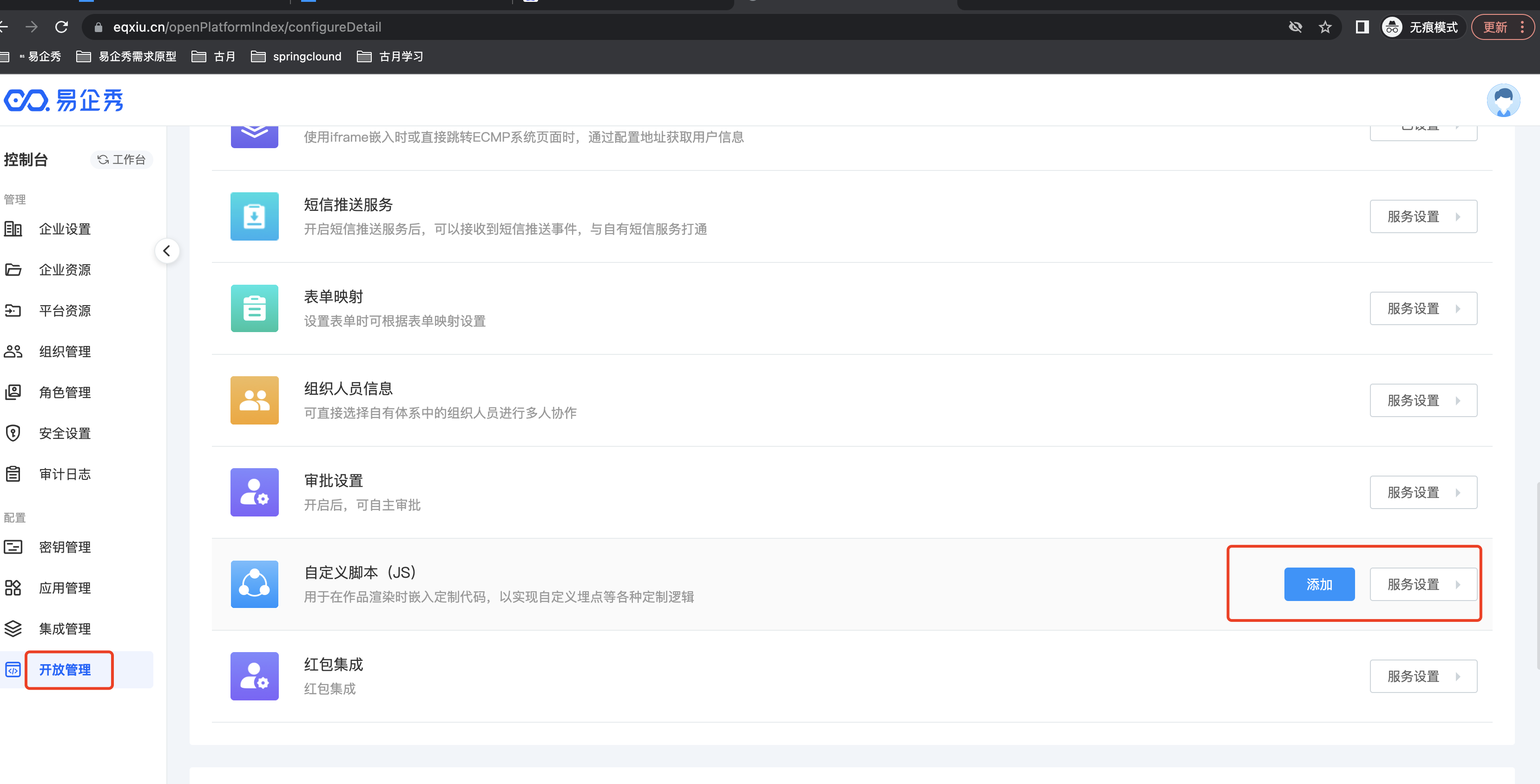 > 1. 支持全局的脚本集成.如针对所有作品的页面埋点,嵌入合作方或者自有埋点统计 2. 支持对单个作品的脚本集成,如针对单个或者部分作品加载指定脚本,实现一定的逻辑处理 # 配置说明 ## 企业配置入口 【集成管理】---【自定义脚本】  ## 平台配置入口 【开放管理】--【选择对应平台】--【配置】--【集成配置】--【自定义js】  ## 配置项 自定义脚本配置如下  ## 配置项说明 | 配置项 | 配置说明 | | --- | --- | | 脚本名称 |自定义,用于制作者自我区别不同脚本 | |js类型 | js文件:企业自有在线js,注意跨域。 js:脚本,直贴上具体的js脚本内容 | |js文件地址|具体的js脚本路径或者接本内容,根据上述选择,分别填入内容| |是否默认加载|是:针对所有作品生效,作品浏览时加载。否:默认不加载,出现在编辑器选择列表中,编辑器选中,单个作品浏览时加载| # 编辑器应用 ## 互动 在编辑器【自定义设置】--【组件类型:自定义组件】--【选择自定义加载为否的对应js】,该作品在客户浏览时会加载对应的js,可以添加多个  ## H5 【进入编辑器】---【添加对应页面】--【选择:组件】--【自定义组件】该作品在客户浏览时会加载对应的js,可以添加多个  # 示例脚本 ```javascript var script = document.createElement('script'), head = document.getElementsByTagName('head')[0]; script.type = 'text/javascript'; script.charset = 'UTF-8'; script.src = 'https://cdn-go.cn/aegis/aegis-sdk/latest/aegis.min.js'; if (script.addEventListener) { script.addEventListener('load', function () { const aegis = new Aegis({ id: 'XXXXXXxxx', // 上报 id uin: 'xxx', // 用户唯一 ID(可选) reportApiSpeed: true, // 接口测速 reportAssetSpeed: true, // 静态资源测速 spa: true // spa 应用页面跳转的时候开启 pv 计算 }); }, false); } else if (script.attachEvent) { script.attachEvent('onreadystatechange', function () { var target = window.event.srcElement; if (target.readyState == 'loaded') { const aegis = new Aegis({ id: 'XXXXXXxxx', // 上报 id uin: 'xxx', // 用户唯一 ID(可选) reportApiSpeed: true, // 接口测速 reportAssetSpeed: true, // 静态资源测速 spa: true // spa 应用页面跳转的时候开启 pv 计算 }); } }); } head.appendChild(script); ```