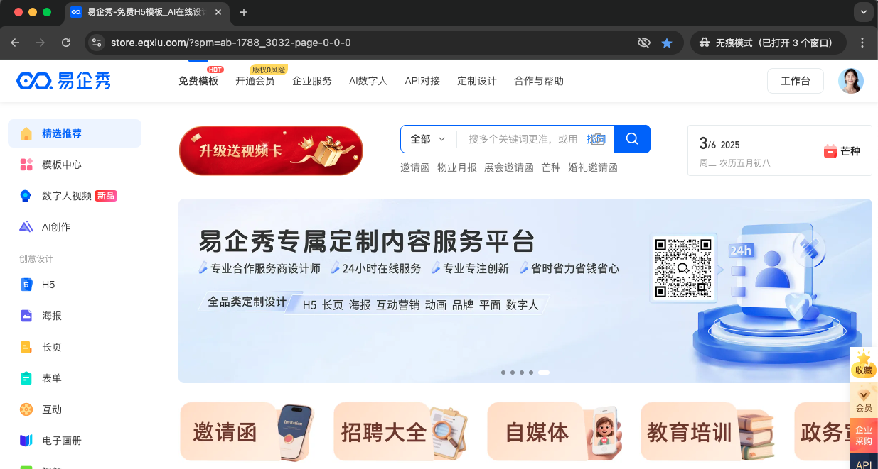 使用无痕浏览器进行易企秀账号登陆,然后进行制作、上传图片等操作。谷歌无痕浏览器默认为黑色边框。