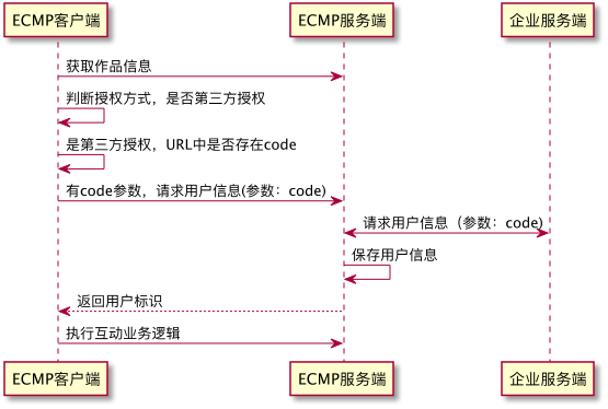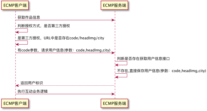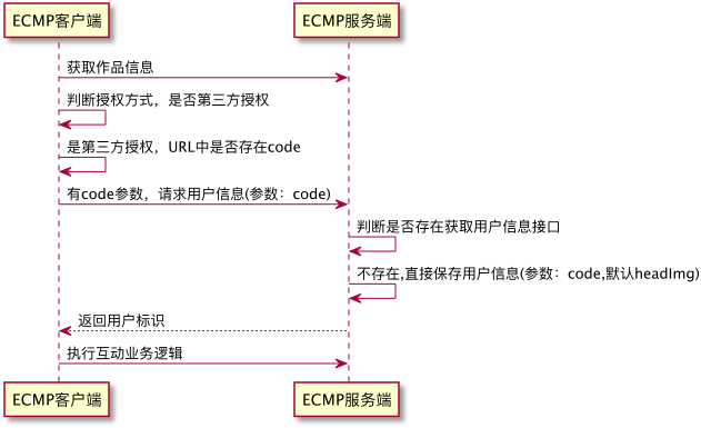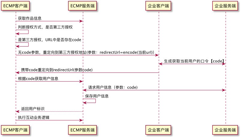 >1. 实现营销访客与企业自有用户关联 >1. 营销落地页可以使用企业用户数据 # 使用说明 1. 根据规范开发自定义授权页、以及获取用户信息接口 1. 登录控制台,服务集成模块,添加自有App集成配置,参见[自主用户系统配置](https://hc.eqxiu.cn/doc/206/ "自主用户系统配置") # 对接方式 一共有4中方式:授权页方式、code接口方式、参数方式、仅code方式。 ## 1. 授权页方式【推荐】 ### 交互流程图  ### 自定义授权页开发规范 - 页面业务逻辑: 1. 检测当前环境是否为自定义App,如果不是检测本地是否已安装App,唤起App或引导下载 1. 页面访问企业自有服务端,服务端生成临时code【一次使用有效】,code与当前登陆用户信息绑定,返回code。 1. 页面获取code 后发起重定向,重定向地址为redirectUrl&code=服务端生成的code,redirectUrl 为授权页的入参,即原作品链接地址。 - 注意: 重定向至第三方授权页请求**示例**: [https://muc.eqxiu.com/usercenter/login?corpOpenId=null&creationId=28280&creationType=hd&redirectUri=https%3A%2F%2Feqs.eqxiu.cn%2Fv%2F28280%3Fcc%3DTZ1bBRtX](https://muc.eqxiu.com/usercenter/login?corpOpenId=null&creationId=28280&creationType=hd&redirectUri=https%3A%2F%2Feqs.eqxiu.cn%2Fv%2F28280%3Fcc%3DTZ1bBRtX "https://muc.eqxiu.com/usercenter/login?corpOpenId=null&creationId=28280&creationType=hd&redirectUri=https%3A%2F%2Feqs.eqxiu.cn%2Fv%2F28280%3Fcc%3DTZ1bBRtX") 返回易企秀作品链接**示例**: [https://eqs.eqxiu.cn/v/28280?cc=TZ1bBRtX&code=xxxxxxx](https://eqs.eqxiu.cn/v/28280?cc=TZ1bBRtX&code=xxxxxxx) - 携带参数: | 参数名 | 是否必须 | 参数类型 | 参数说明 | | --- | --- | --- | --- | | corpOpenId | 否 | string | 平台型企业会携带,作品所属企业 | | creationId | 是 | Number | 作品id | | creationType | 是 | string | 作品类型,hd:互动,lc:长页,design:海报,h5:h5,form:表单 | | redirectUri | 是 | string | 发起授权的作品链接,授权后需跳转此地址 | ### 获取用户信息接口规范 - 方法类型:GET - 入参 | 参数名 | 是否必须 | 参数类型 | 参数说明 | | --- | --- | --- | --- | | code | 必填 | string | 企业服务生成的临时code,注意code不要包含=、/、\、&等特殊字符 | | XXX |非必填 | string | 动态字段,地址栏参数集合,如果企业需要其他字段,可以通过这个实现,例如在作品访问地址上拼接:customArgs1=111,该参数会出现 | |creationType | 必填 | string | 作品类型 | - 返回值 | 参数名 | 是否必须 | 参数类型 | 参数说明 | | --- | --- | --- | --- | | success | 必填 | boolean | 请求状态 | | code | 必填 | int | 请求状态码,200成功, | | msg | 必填 | string | 错误消息,正确是返回“ok” | | obj:userId | 必填 | string | 用户唯一id,**最长支持64位** | | obj:channelKey | 否 | String | 渠道编码;微信认证方式返回值为wx;手机号授权方式返回值为mo ;小程序授权方式返回值:ori_wxmp;APP授权方式返回值:ori_app;PC授权方式返回值:ori_pc (请根据您的实际情况返回值) | obj:nickName | 否 | string | 姓名或呢称 | | obj:headImg | 否 | string | 头像 | | obj:sex | 否 | int | 性别,1男,2女 | | obj:openId | 否 | String | 微信或其他第三方渠道 openId | | obj:unionId | 否 | String | 微信或其他第三方渠道 unionId | | obj:mobile | 否 | String | 手机号明文 | | obj:mobileCipher | 否 | String | 手机号密文 | | obj:encryptionMethod | 否 | String | 加密方式:MD5、SHA1 | | obj:state | 否 | String | 扩展参数,返回后在访客明细可以查看和导出 | > 注意:当我们需要使用第三方风控服务时,必须要返回手机号或openId。 ```json { success:true, code:"200", msg:"ok", obj:{ userId:"32f909e22ba842fe09a192", // 最长支持64位 nickName:"李XX", headImg:"https://xxx.xx.xx/img/abcdef.jpg", sex:1, mobile:"13866668888", channelKey:"ori_custom" } } ``` ## 2. code接口方式【推荐】 ### 交互流程图  ### 获取用户信息接口规范 见“授权页方式” ## 3. 参数方式【不推荐】 ### 交互流程图  此方式无需接口,code为访客唯一标识,不能是临时的。==不安全== 。code最长支持==64位== ## 4. 仅code方式【不推荐】 ### 交互流程图  此方式与“参数方式基本一致”,仅参数区别,==不安全==。code最长支持==64位== ### 示例代码 github地址: