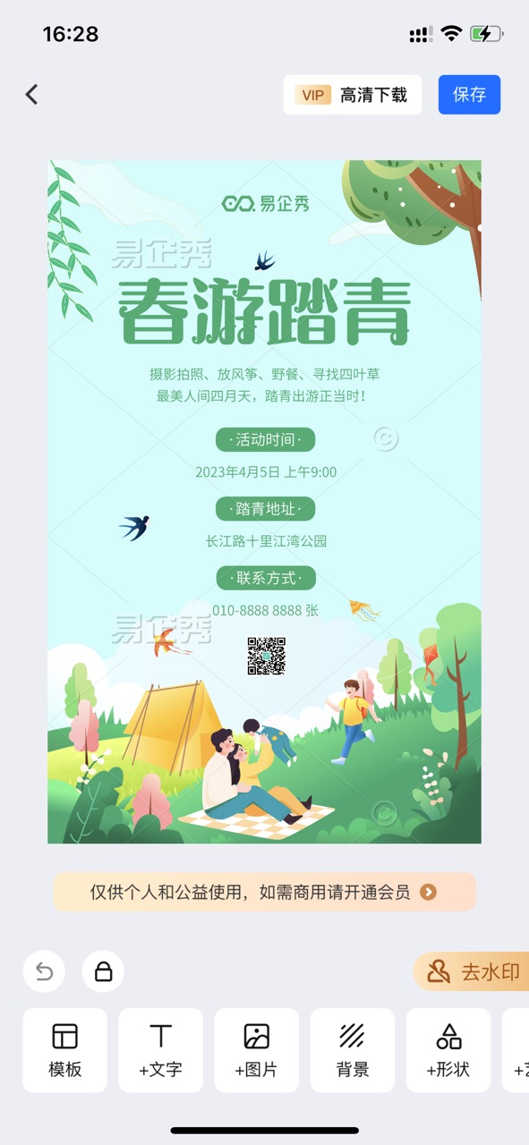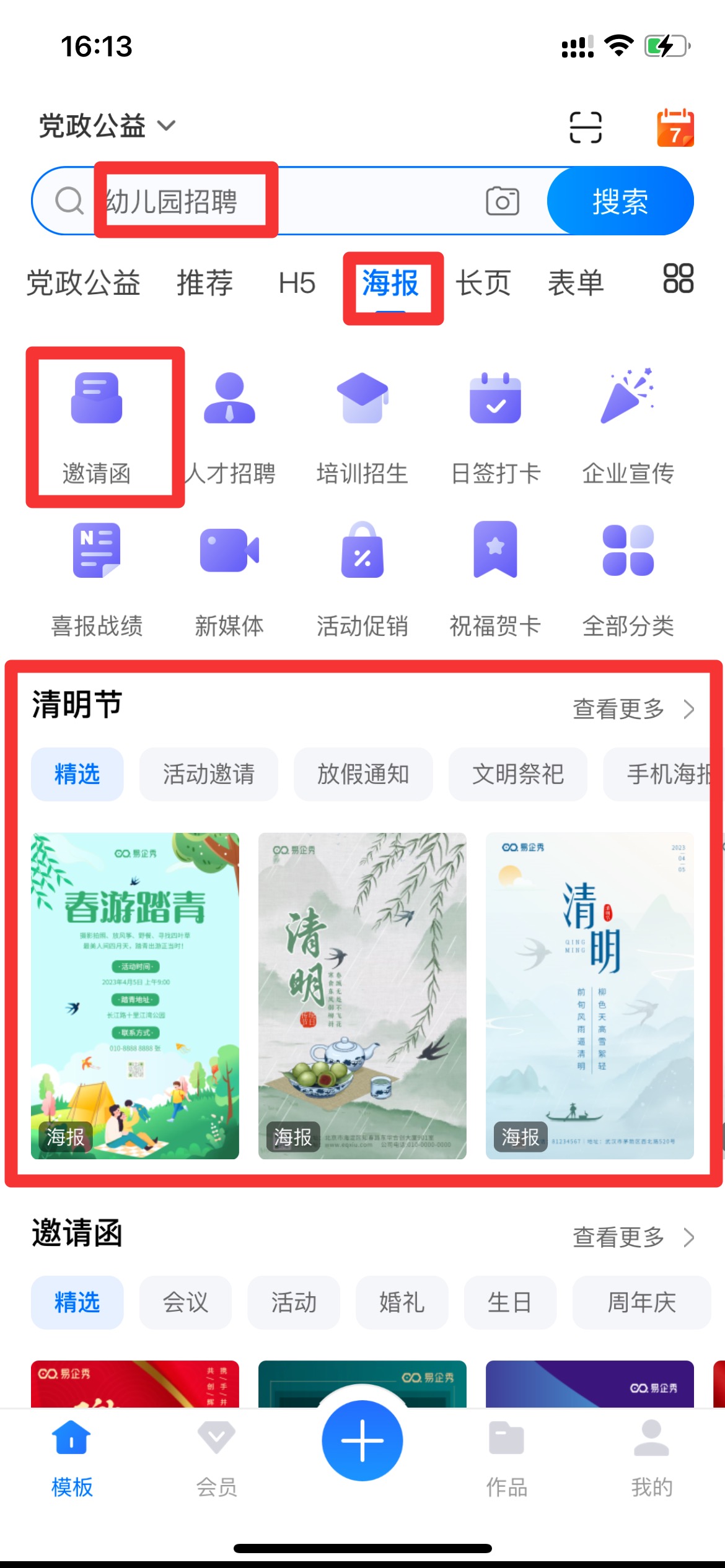 ### <span style="font-family:楷体">第一步: 进入海报子商城在搜索框输入关键词进行搜索,如“幼儿园招聘”;或者点击想要找的场景寻找模板,如“邀请函”;也可以在下方的模板展示楼层中挑选,如“清明节”</span>  ### <span style="font-family:楷体">第二步: 选中想要的模板后,点击“使用”,即可进入海报编辑器对海报进行编辑、修改</span>