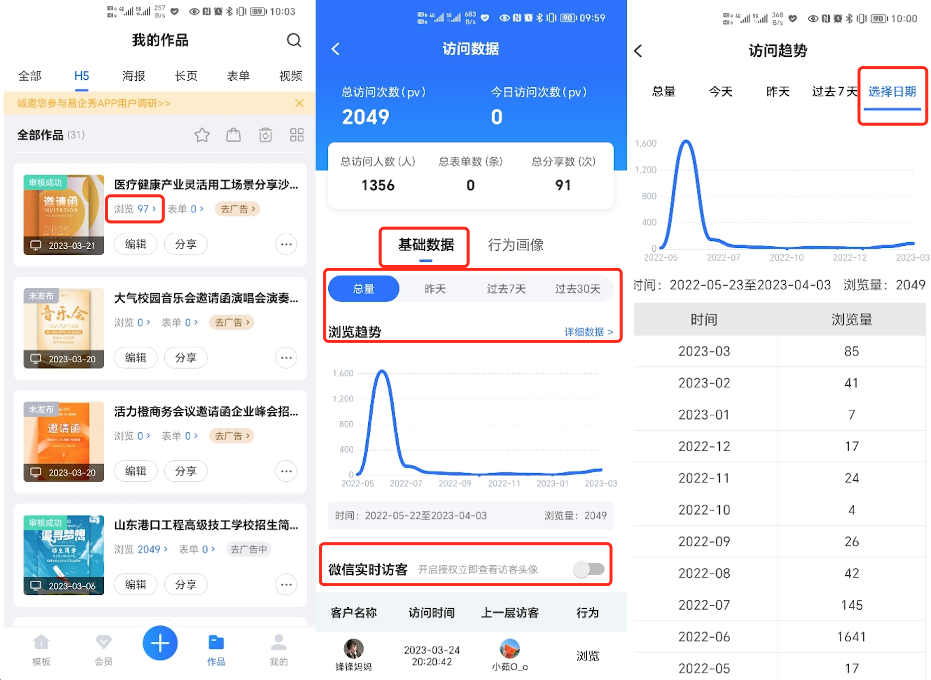 ### <span style="font-family:楷体">一、查看数据方式</span> <span style="font-family:楷体">作品发布之后,可以“作品”列表页查看作品数据;</span> ### <span style="font-family:楷体">二、传播数据</span> <span style="font-family:楷体">包含基础数据、行为画像、表单数据3大项 <span style="font-family:楷体">1、基础数据 包含数据查询、趋势图、微信实时访客</span>  <span style="font-family:楷体">==数据查询==:快速查询近30日数据,也可输入时间段进行数据查询 PV:浏览次数(一个人可能多次查看) UV:浏览人数</span> <span style="font-family:楷体"> ==趋势图==:展示PV趋势图,简单直观,哪天传播效果最好一目了然</span> <span style="font-family:楷体">==微信实时访客==:开启后可查看微信头像和昵称</span> <span style="font-family:楷体">2、行为画像</span> <span style="font-family:楷体">包括表单转化漏斗、设备分析、地域分布、微信阅读来源、微信分享去向、访问时长与退出率,访客行为数据全掌握!</span>  <span style="font-family:楷体">3、表单数据</span> <span style="font-family:楷体">表单数据包括:</span> <span style="font-family:楷体">表单汇总:添加报名表单后有人填写后有数据</span> <span style="font-family:楷体">留言汇总:仅在添加留言板和弹幕功能后有数据</span>