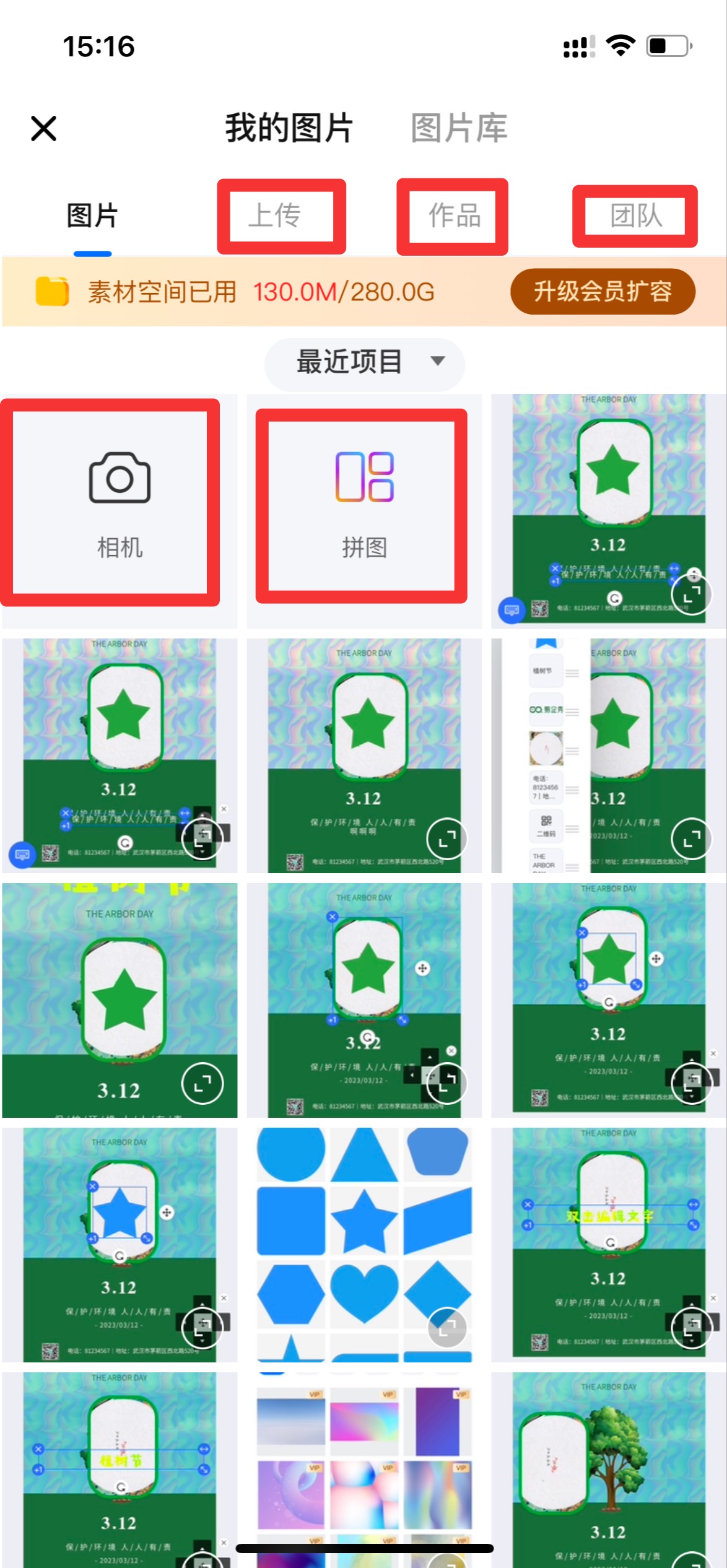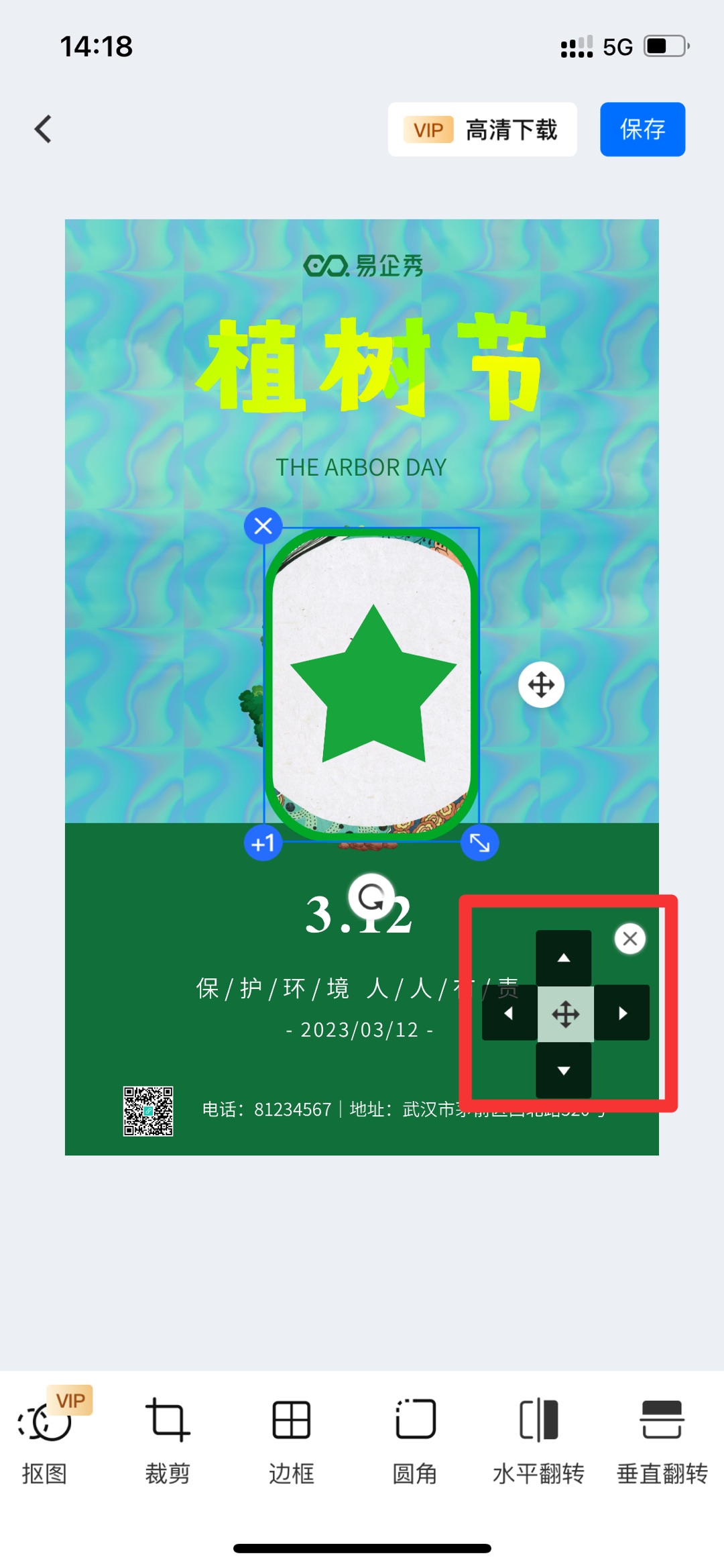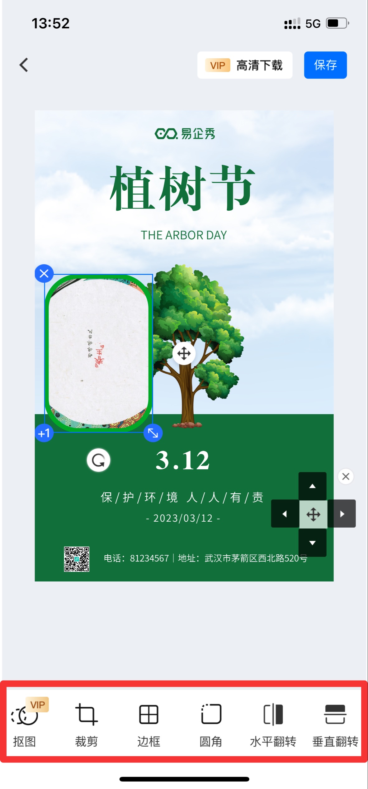 ### 添加图片: 点击编辑器内添加图片的按钮即可添加。点击“相机”可进行拍照添加,点击“拼图”可以对多张图片进行拼接,点击“上传”可以找到所有历史传过的图片,点击“作品”可以将其他海报作品插入此海报中,点击“团队”可以看到团队上传的图片素材。  ### 编辑图片: 添加好图片之后,可以进行换图、抠图、裁剪、边框、圆角、水平翻转、垂直翻转等操作对图片进行二次编辑。  ### 移动图片: 编辑好图片后,想要将图片移动到相应位置,可以使用微调罗盘,能够精确地对图片位置进行细微调整。点击上下左右箭头即可对选中图片进行移动。