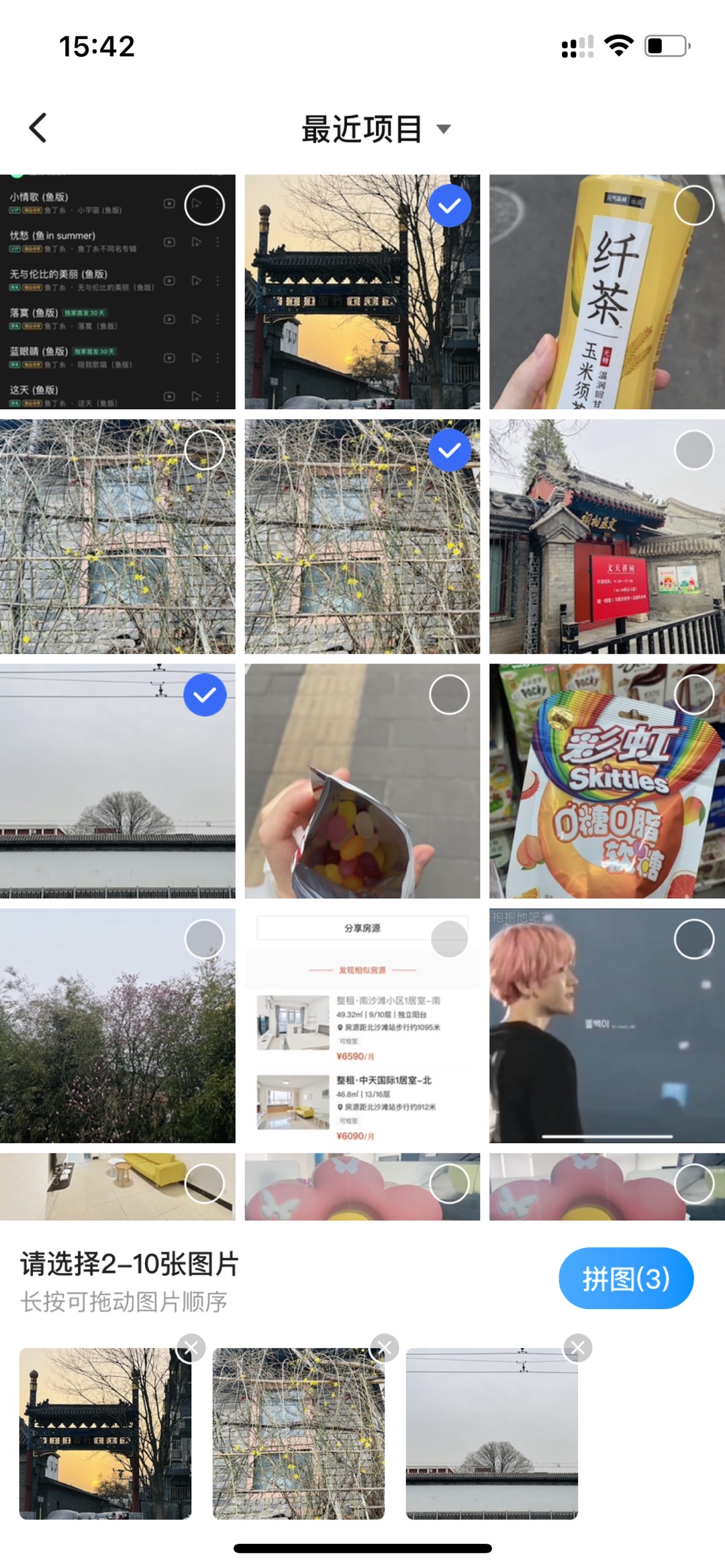 点击“+图片”进入图片库后,选择“拼图”,在图片库选中需要进行拼图的2-10张图片后点击“拼图”按钮,跳转至拼图模板选择,共有四种类型:海报类、纯模板、自由类和拼接类。选中后点击保存即可生成拼图。生成后的拼图依然可以和普通图片一样进行图片的相关操作。