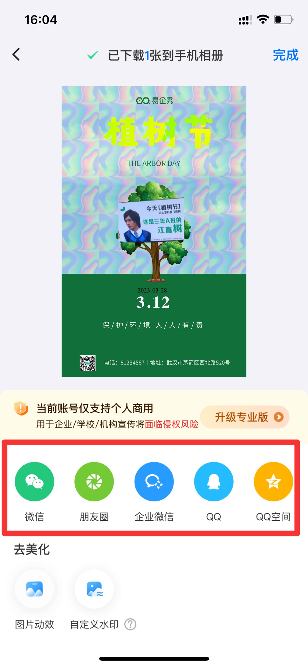编辑完成后,点击右上角“保存”和“高清下载”均可进行海报的下载,下载后会保存在手机相册中,并且也可以直接点击下方的按钮,通过微信、朋友圈、企业微信、QQ、QQ空间等方式便捷分享出去。