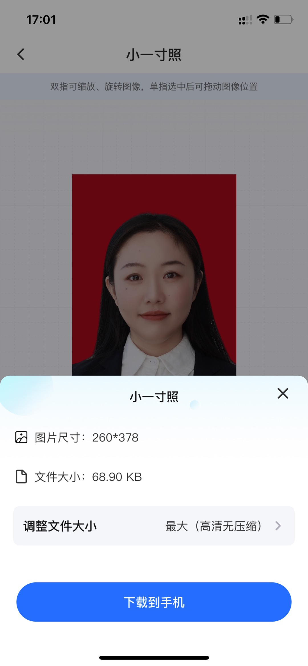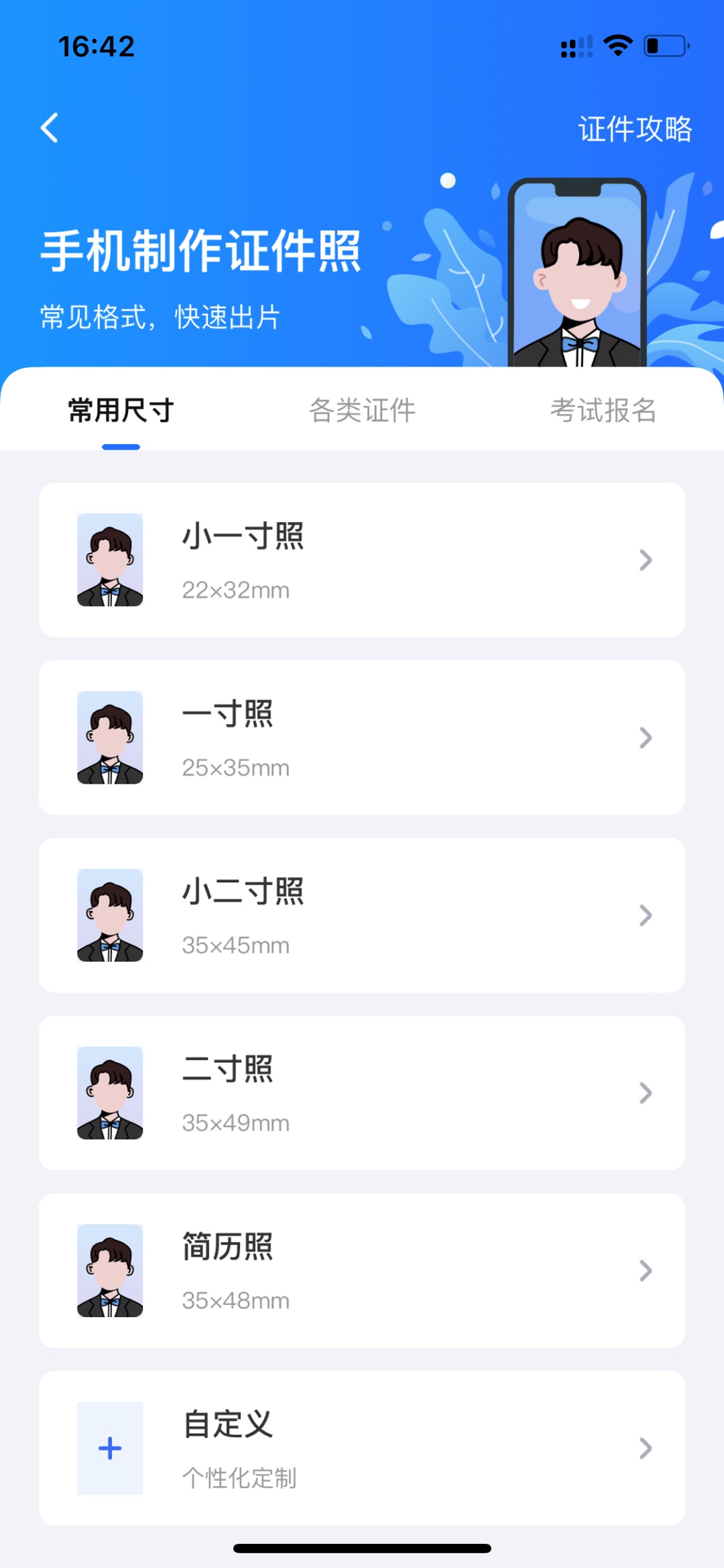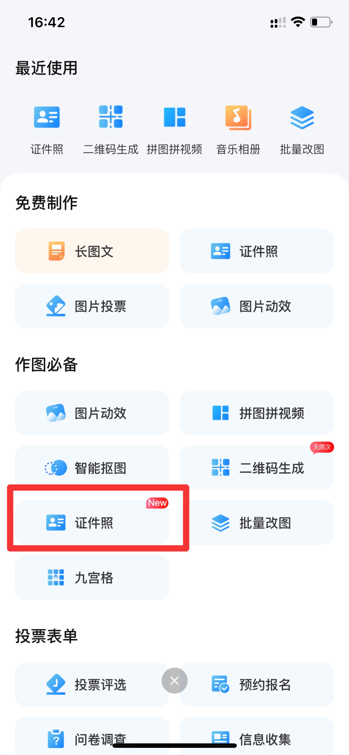 提前准备好证件照所需的照片,打开易企秀app中点击“+”号,选择“证件照”;  支持生成各种尺寸的证件照,也可以按照证件类型或者考试类型来选择尺寸;  然后导入自己的照片,按照虚线调整头身比例,根据需要调整背景颜色;  点击保存时可以调整下载文件的大小,调整好后点击下载到手机即可生成证件照。