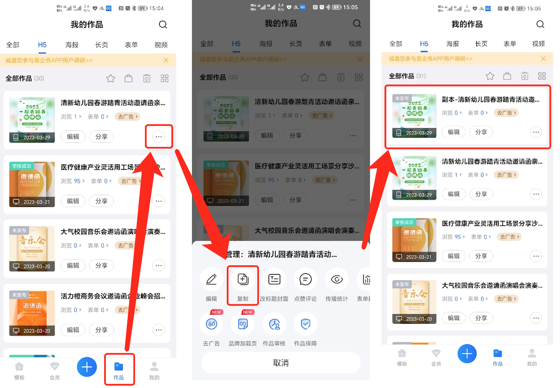 <span style="font-family:楷体">1、在底部菜单栏的“作品”列表中找到想要复制的作品; 2、点击“…”打开作品控制面板,点击“复制”按钮; 3、点击“确定”复制,即复制创建一个新的作品。</span>