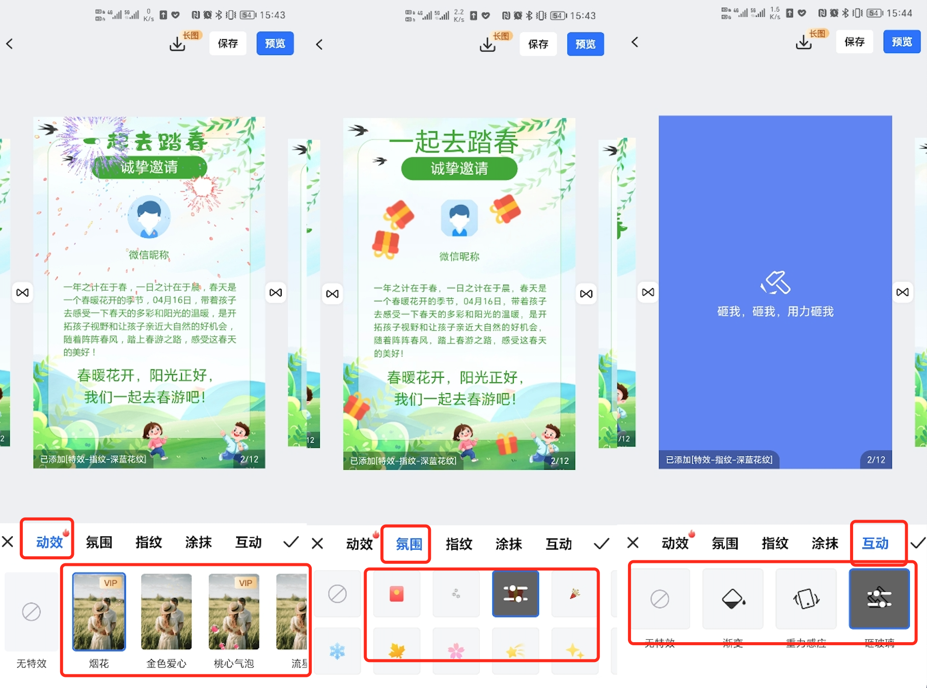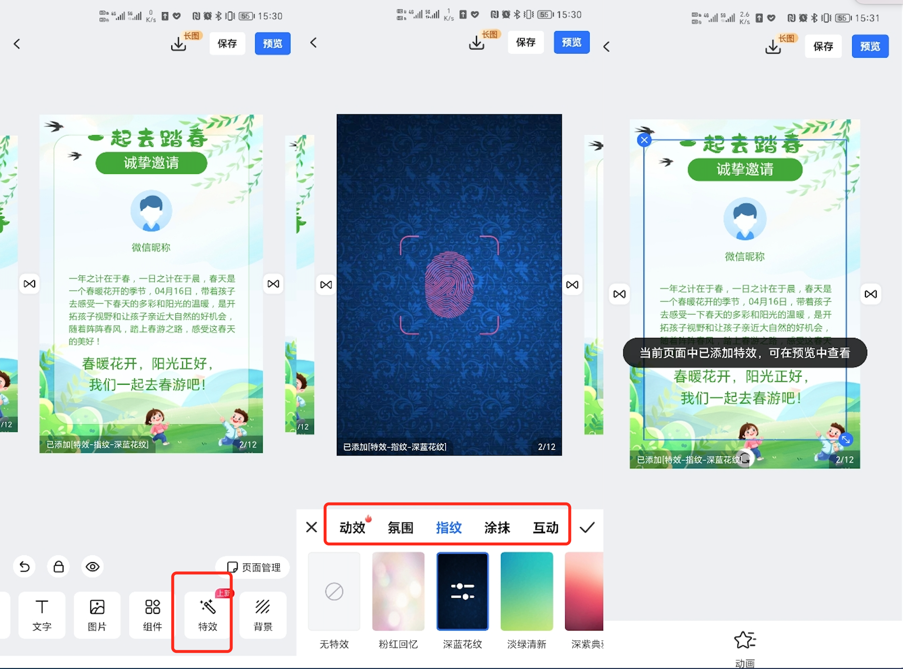 ### <span style="font-family:楷体">一、功能介绍</span> <span style="font-family:楷体">“特效”功能是在页面打开时增加动态效果,提高视觉体验。 </span> <span style="font-family:楷体">“特效”功能共分为动效、氛围、指纹、涂抹、互动特效场景。一个页面只能增加一个特效场景。</span>  ### <span style="font-family:楷体">二、功能使用</span> <span style="font-family:楷体">点击底部“特效”按钮,选择特效样式即可展示。</span>