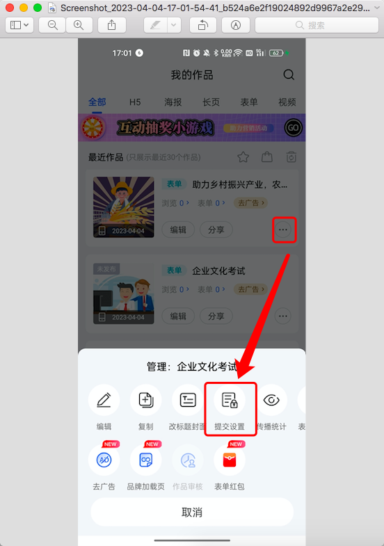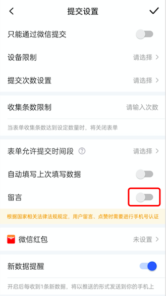 表单也有留言功能,它就像微信公众号文章下面的留言评论一样……  我们可以设置开启/关闭留言功能,当有用户进行留言评论后,我们可以在后台审核留言并设为精选 设为【精选】的留言即会展示在您的表单中被大家看见,在设为精选后您可以直接在后台回复留言,回复的内容也将被大家看见 具体操作如下: 进入表单作品“提交设置”  开启“留言”功能即可