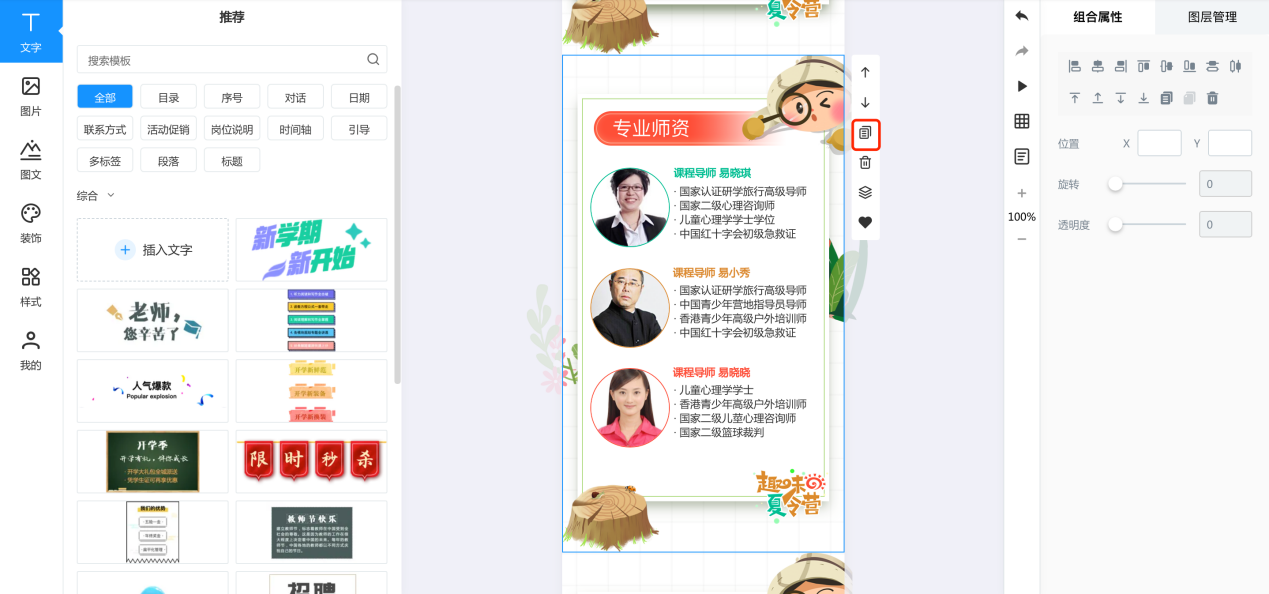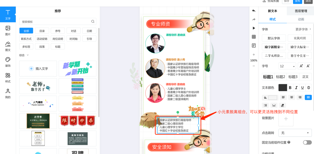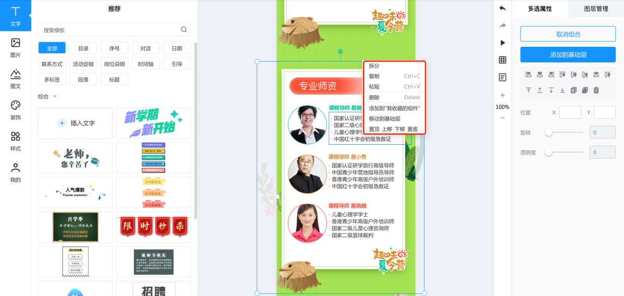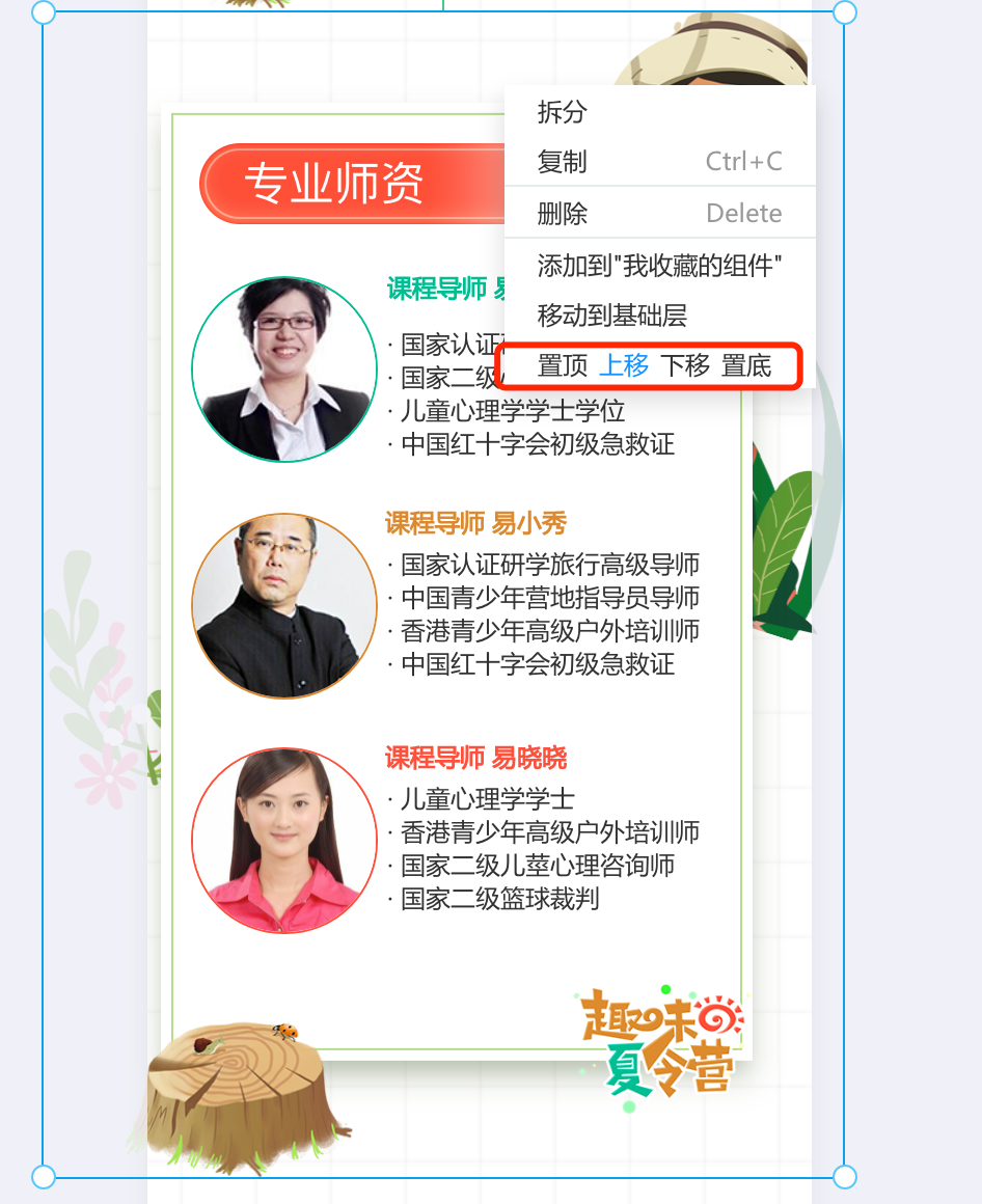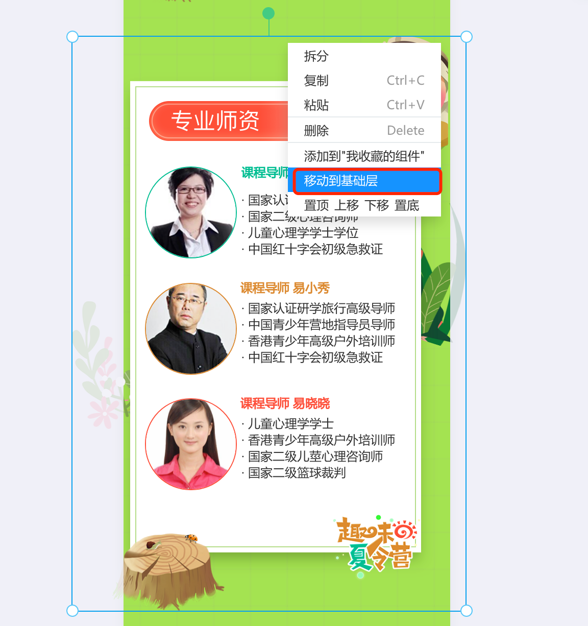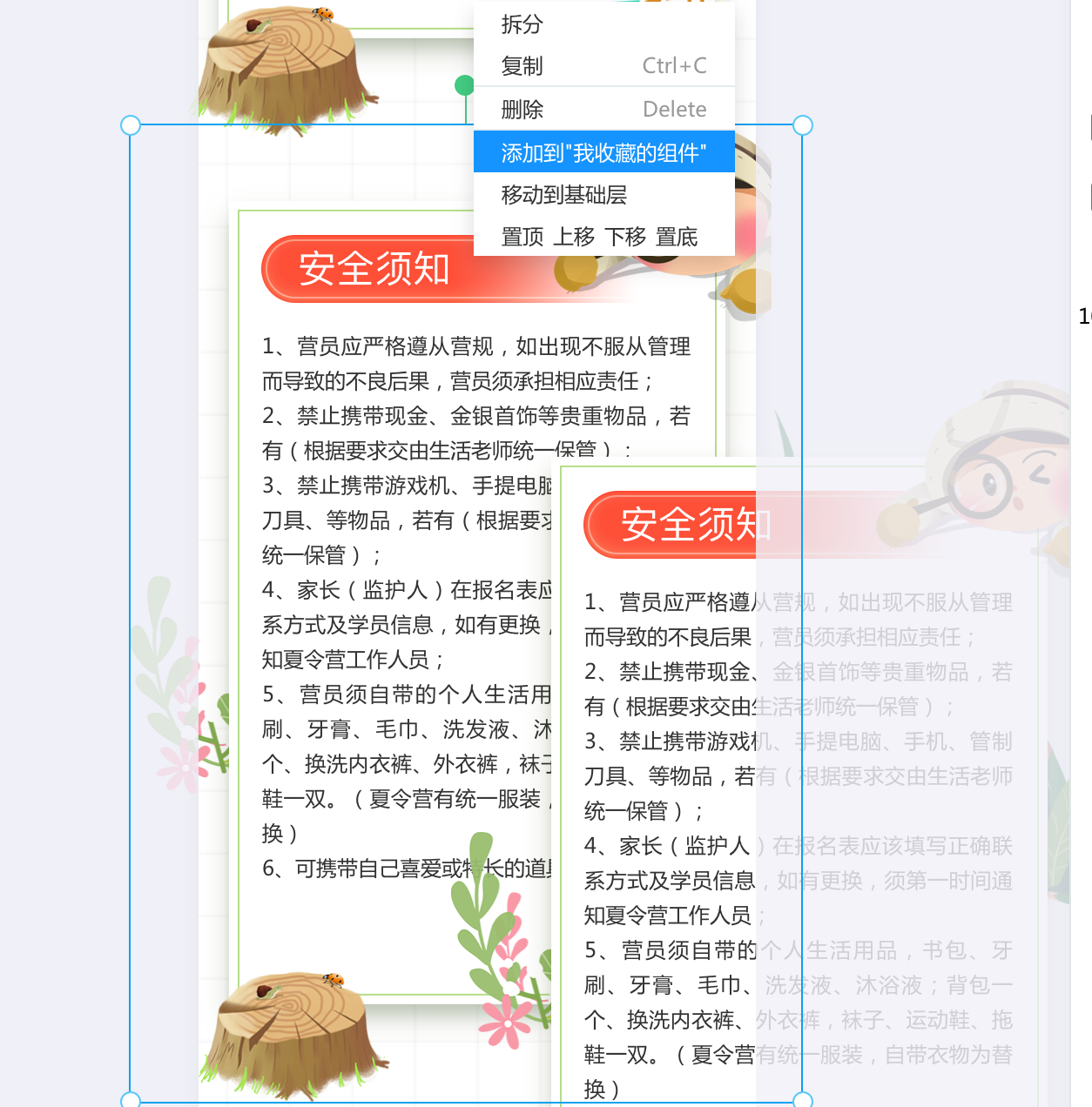 **1.上移下移** 选择要移动的元素组合,右侧会出现上移下移按钮,点击上移会移动到前一个组合前方,点击下移会移动到下一个组合下方。  **2.复制** 选择要复制的元素组合,右侧出现复制按钮,点击复制,在下方会复制出一个同样的元素组合  3.删除 选择要复制的元素组合,右侧出现删除按钮,点击删除,删除掉元素组合  4.收藏 选中某个元素,右侧出现收藏按钮,点击收藏,这个元素组合会被收藏,收藏后的素材在我的-收藏中查找  **5.叠加** 当我们需要把一个组合里的某个元素进行位置调整、复制黏贴等操作,需要使用叠加功能 选中元素组合,右侧出现叠加按钮,点击叠加后,这个组合里的每个小元素都可以移动个改变图层顺序 选中某个元素,可以拖拉拽改变位置,也可以点击右键单独对这个元素进行复制拆分、复制、黏贴等操作 6. 叠加后单个元素的修改 ①叠加后拆分:未拆分前,这个元素始终属于这个组合,点击右键拆分后,小元素将会脱离大组合    ②叠加后复制黏贴 复制整个组合,再点击右键黏贴后,会出现一个新的组合到最上层,次组合的元素也是被叠加过,元素可点击右键进行详细修改  黏贴后的效果如下:  ③叠加后的删除,可以删除整个组合,也可以单独真多某个元素进行删除  ④叠加后的添加到我的收藏组件,组件收藏后,可以在我的收藏中找到  ⑤移动到基础层,移动到基础层以后,将会出现在最底层,一般背景图片使用这个功能  ⑥置顶、上移、下移、置底:可以调整图层的顺序,置顶表示展示在最顶层,置底表示展示在最底层  7.编辑 选中元素,点击右键会出现编辑按钮,点击编辑后,可以针对这个元素进行编辑修改的操作  8. 复制 选中元素后点击右键,出现复制按钮,点击后可复制元素  9. 收藏文本素材 选中元素后点击右键,出现收藏文本素材按钮,点击后可收藏文本素材,收藏后的素材可以在我的-收藏中查看  10. 删除 选中素材后点击右键,出现删除按钮,点击后可删除素材  11. 样式 选中素材后点击右键,出现样式按钮,点击后素材的样式可以在右侧进行修改,如果是文字样式可以修改字体的字号、颜色、对齐方式、跳转链接等修改;如果是图片,可以进行图片的替换、裁剪、边框等修改和设置  12. 动画 选中素材后点击右键,出现动画按钮,点击后可动画可以在右侧进行动画的添加和修改,添加动画后可以预览动画 13. 复制动画 当我们需要把某个元素或组合的动画复制到另外一个元素或组合里时,可以使用复制动画 先选中需要复制的动画元素,点击右键,点击复制动画  再选择需要黏贴的动画元素,点击右键,点击粘贴动画,动画会跟上一个元素的动画一致了  14. 删除动画 当元素中有动画效果时,选中后点击右键会出现删除动画的按钮,点击后动画效果删除  15. 撤销:撤销上一步操作   16. 恢复:恢复上一步操作  17. 刷新预览:点击刷新预览后,可以预览作品的整体样式  18. 网格设置 网格设置可以开启网格、调整网格颜色、开启智能参考、吸附效果  19. 目录 点击右侧的目录按钮  选中需要生成目录的文本,再点击目录的设置为标题,设为标题1是一级标题,设为标题2为二级标题,设为标题3位三级标题 目录文字的颜色、对齐、可以在右侧的新文本处进行修改调整   20. 画布缩放 点击右侧的“+”“-”按钮,可以快速缩放整个画布尺寸  21. 组合属性 选中组合后,右侧编辑区会出现组合属性,在组合属性中可以调整组合的对齐方式、置顶、置底、复制、黏贴、旋转、透明度等操作