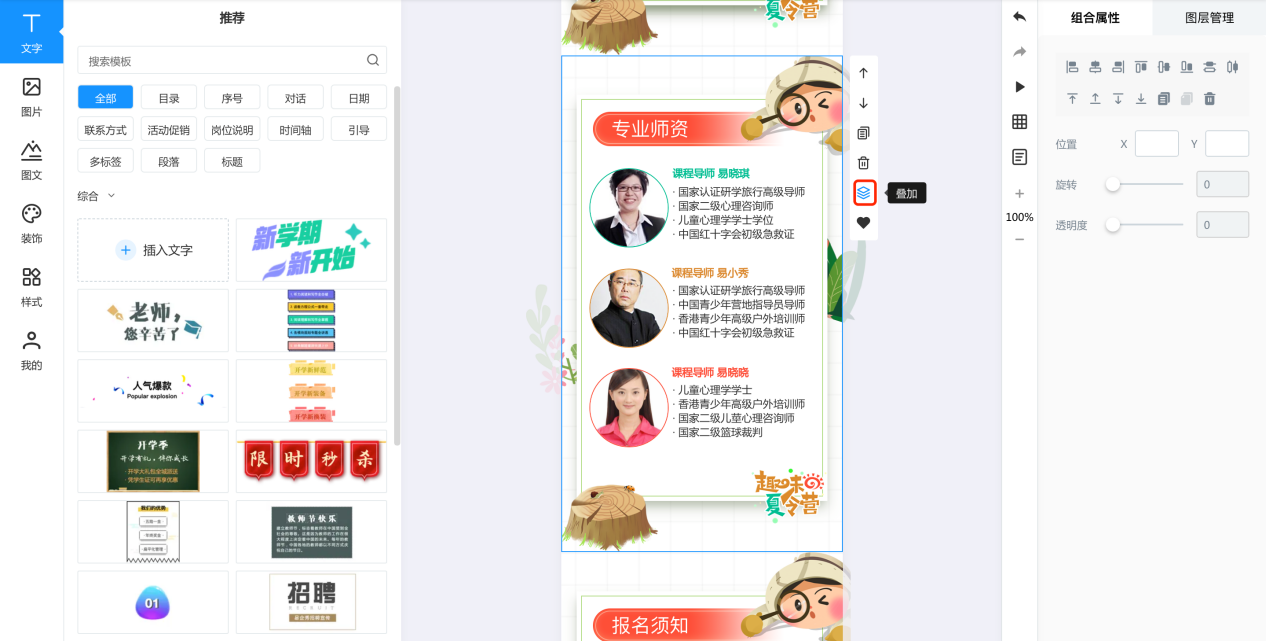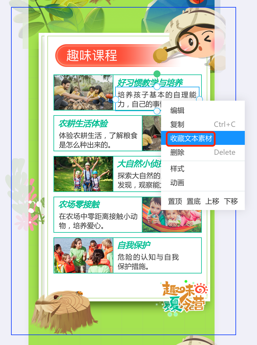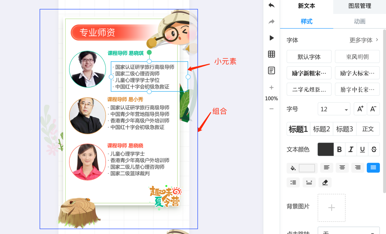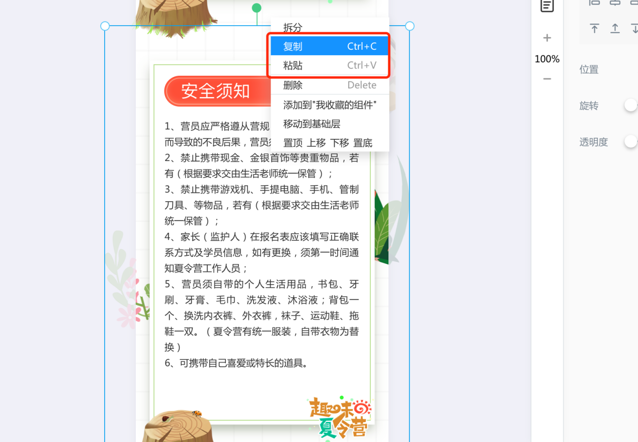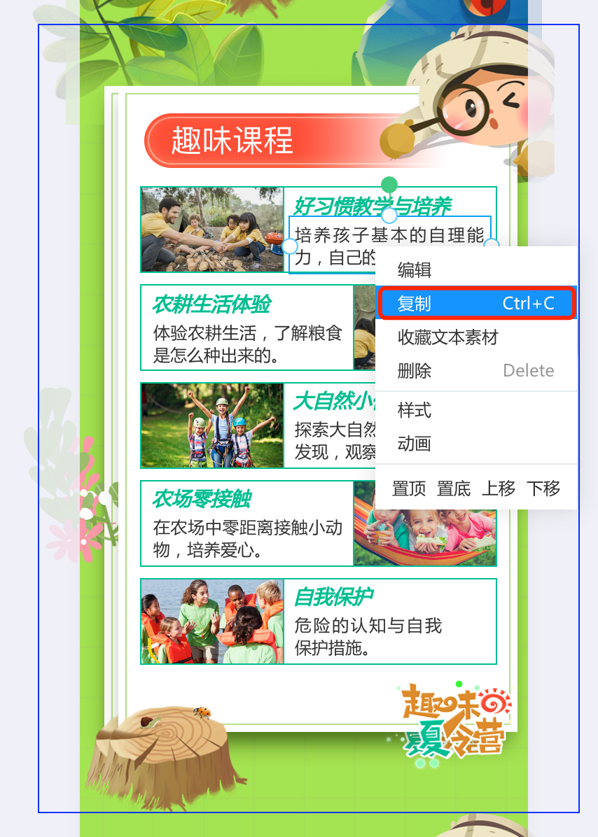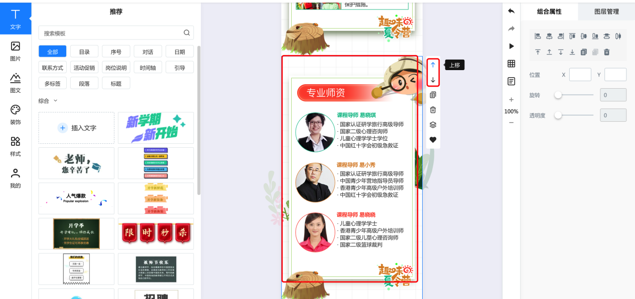 **1.上移下移** 选择要移动的元素组合,右侧会出现上移下移按钮,点击上移会移动到前一个组合前方,点击下移会移动到下一个组合下方。  **2.复制** 选择要复制的元素组合,右侧出现复制按钮,点击复制,在下方会复制出一个同样的元素组合  3.删除 选择要复制的元素组合,右侧出现删除按钮,点击删除,删除掉元素组合  4.收藏 选中某个元素,右侧出现收藏按钮,点击收藏,这个元素组合会被收藏,收藏后的素材在我的-收藏中查找  **5.叠加** 当我们需要把一个组合里的某个元素进行位置调整、复制黏贴等操作,需要使用叠加功能 选中元素组合,右侧出现叠加按钮,点击叠加后,这个组合里的每个小元素都可以移动个改变图层顺序 选中某个元素,可以拖拉拽改变位置,也可以点击右键单独对这个元素进行复制拆分、复制、黏贴等操作 6. 叠加后单个元素的修改 ①叠加后拆分:未拆分前,这个元素始终属于这个组合,点击右键拆分后,小元素将会脱离大组合    ②叠加后复制黏贴 复制整个组合,再点击右键黏贴后,会出现一个新的组合到最上层,次组合的元素也是被叠加过,元素可点击右键进行详细修改  黏贴后的效果如下:  ③叠加后的删除,可以删除整个组合,也可以单独真多某个元素进行删除  ④叠加后的添加到我的收藏组件,组件收藏后,可以在我的收藏中找到  ⑤移动到基础层,移动到基础层以后,将会出现在最底层,一般背景图片使用这个功能  ⑥置顶、上移、下移、置底:可以调整图层的顺序,置顶表示展示在最顶层,置底表示展示在最底层  7.编辑 选中元素,点击右键会出现编辑按钮,点击编辑后,可以针对这个元素进行编辑修改的操作  8. 复制 选中元素后点击右键,出现复制按钮,点击后可复制元素  9. 收藏文本素材 选中元素后点击右键,出现收藏文本素材按钮,点击后可收藏文本素材,收藏后的素材可以在我的-收藏中查看  10. 删除 选中素材后点击右键,出现删除按钮,点击后可删除素材  11. 样式 选中素材后点击右键,出现样式按钮,点击后素材的样式可以在右侧进行修改,如果是文字样式可以修改字体的字号、颜色、对齐方式、跳转链接等修改;如果是图片,可以进行图片的替换、裁剪、边框等修改和设置  12. 动画 选中素材后点击右键,出现动画按钮,点击后可动画可以在右侧进行动画的添加和修改,添加动画后可以预览动画 13. 复制动画 当我们需要把某个元素或组合的动画复制到另外一个元素或组合里时,可以使用复制动画 先选中需要复制的动画元素,点击右键,点击复制动画  再选择需要黏贴的动画元素,点击右键,点击粘贴动画,动画会跟上一个元素的动画一致了  14. 删除动画 当元素中有动画效果时,选中后点击右键会出现删除动画的按钮,点击后动画效果删除  15. 撤销:撤销上一步操作   16. 恢复:恢复上一步操作  17. 刷新预览:点击刷新预览后,可以预览作品的整体样式  18. 网格设置 网格设置可以开启网格、调整网格颜色、开启智能参考、吸附效果  19. 目录 点击右侧的目录按钮  选中需要生成目录的文本,再点击目录的设置为标题,设为标题1是一级标题,设为标题2为二级标题,设为标题3位三级标题 目录文字的颜色、对齐、可以在右侧的新文本处进行修改调整   20. 画布缩放 点击右侧的“+”“-”按钮,可以快速缩放整个画布尺寸  21. 组合属性 选中组合后,右侧编辑区会出现组合属性,在组合属性中可以调整组合的对齐方式、置顶、置底、复制、黏贴、旋转、透明度等操作