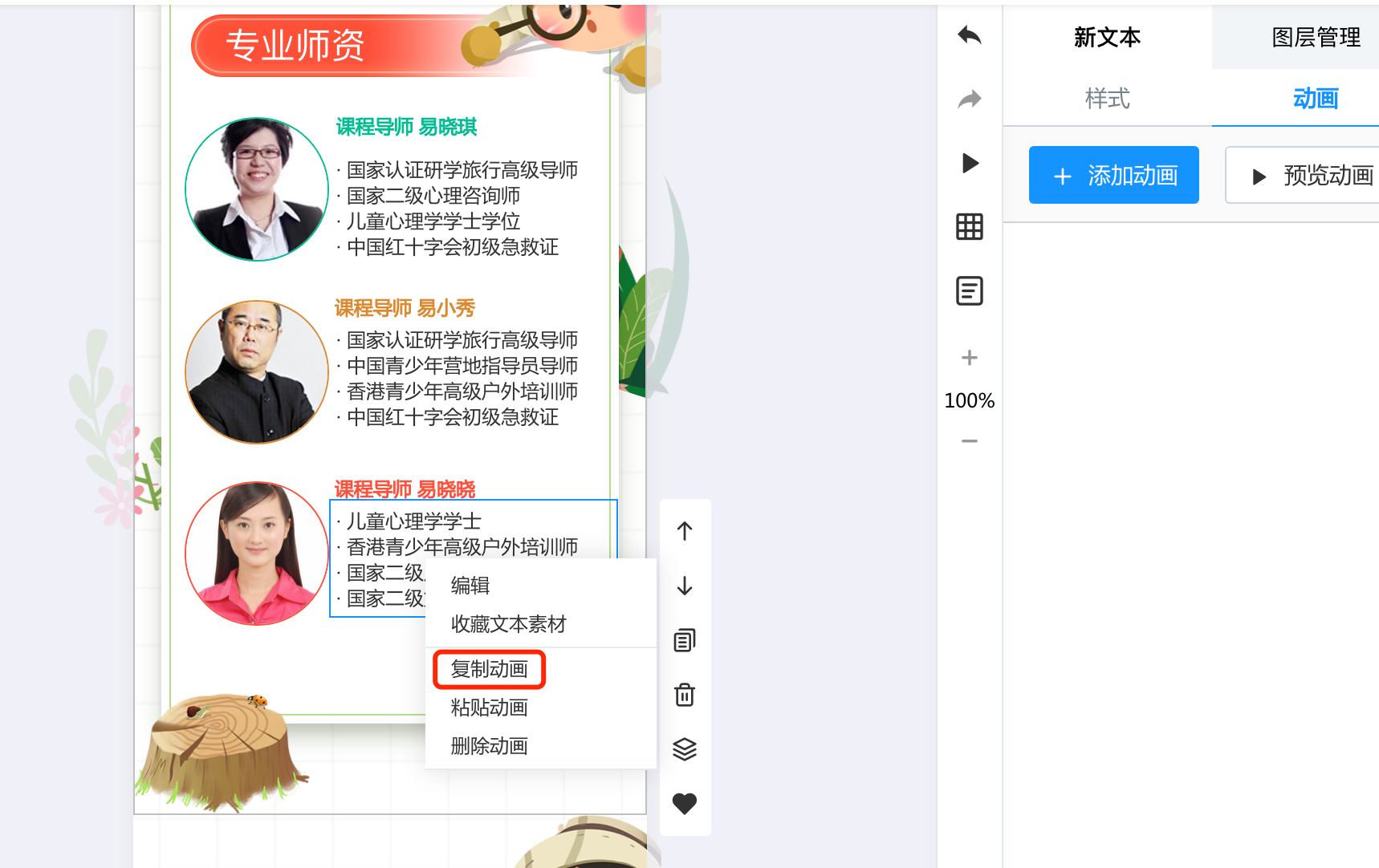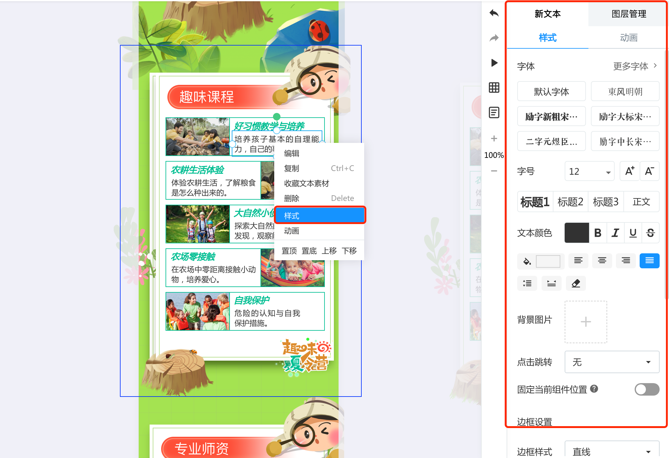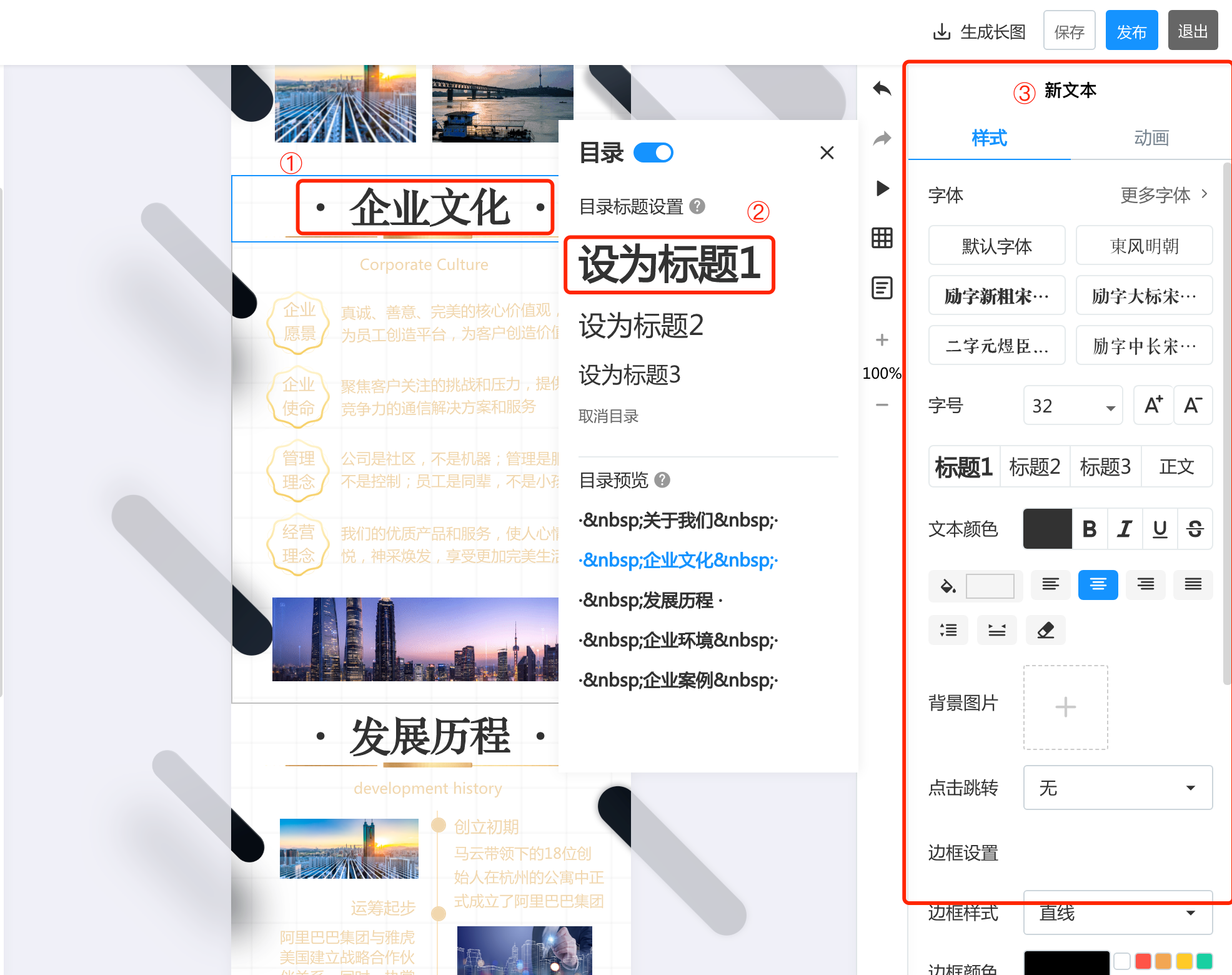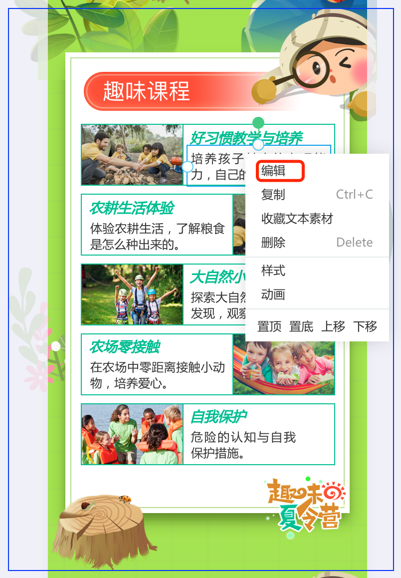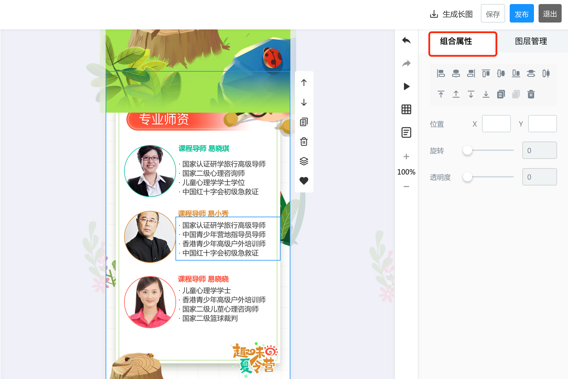 **1.上移下移** 选择要移动的元素组合,右侧会出现上移下移按钮,点击上移会移动到前一个组合前方,点击下移会移动到下一个组合下方。  **2.复制** 选择要复制的元素组合,右侧出现复制按钮,点击复制,在下方会复制出一个同样的元素组合  3.删除 选择要复制的元素组合,右侧出现删除按钮,点击删除,删除掉元素组合  4.收藏 选中某个元素,右侧出现收藏按钮,点击收藏,这个元素组合会被收藏,收藏后的素材在我的-收藏中查找  **5.叠加** 当我们需要把一个组合里的某个元素进行位置调整、复制黏贴等操作,需要使用叠加功能 选中元素组合,右侧出现叠加按钮,点击叠加后,这个组合里的每个小元素都可以移动个改变图层顺序 选中某个元素,可以拖拉拽改变位置,也可以点击右键单独对这个元素进行复制拆分、复制、黏贴等操作 6. 叠加后单个元素的修改 ①叠加后拆分:未拆分前,这个元素始终属于这个组合,点击右键拆分后,小元素将会脱离大组合    ②叠加后复制黏贴 复制整个组合,再点击右键黏贴后,会出现一个新的组合到最上层,次组合的元素也是被叠加过,元素可点击右键进行详细修改  黏贴后的效果如下:  ③叠加后的删除,可以删除整个组合,也可以单独真多某个元素进行删除  ④叠加后的添加到我的收藏组件,组件收藏后,可以在我的收藏中找到  ⑤移动到基础层,移动到基础层以后,将会出现在最底层,一般背景图片使用这个功能  ⑥置顶、上移、下移、置底:可以调整图层的顺序,置顶表示展示在最顶层,置底表示展示在最底层  7.编辑 选中元素,点击右键会出现编辑按钮,点击编辑后,可以针对这个元素进行编辑修改的操作  8. 复制 选中元素后点击右键,出现复制按钮,点击后可复制元素  9. 收藏文本素材 选中元素后点击右键,出现收藏文本素材按钮,点击后可收藏文本素材,收藏后的素材可以在我的-收藏中查看  10. 删除 选中素材后点击右键,出现删除按钮,点击后可删除素材  11. 样式 选中素材后点击右键,出现样式按钮,点击后素材的样式可以在右侧进行修改,如果是文字样式可以修改字体的字号、颜色、对齐方式、跳转链接等修改;如果是图片,可以进行图片的替换、裁剪、边框等修改和设置  12. 动画 选中素材后点击右键,出现动画按钮,点击后可动画可以在右侧进行动画的添加和修改,添加动画后可以预览动画 13. 复制动画 当我们需要把某个元素或组合的动画复制到另外一个元素或组合里时,可以使用复制动画 先选中需要复制的动画元素,点击右键,点击复制动画  再选择需要黏贴的动画元素,点击右键,点击粘贴动画,动画会跟上一个元素的动画一致了  14. 删除动画 当元素中有动画效果时,选中后点击右键会出现删除动画的按钮,点击后动画效果删除  15. 撤销:撤销上一步操作   16. 恢复:恢复上一步操作  17. 刷新预览:点击刷新预览后,可以预览作品的整体样式  18. 网格设置 网格设置可以开启网格、调整网格颜色、开启智能参考、吸附效果  19. 目录 点击右侧的目录按钮  选中需要生成目录的文本,再点击目录的设置为标题,设为标题1是一级标题,设为标题2为二级标题,设为标题3位三级标题 目录文字的颜色、对齐、可以在右侧的新文本处进行修改调整   20. 画布缩放 点击右侧的“+”“-”按钮,可以快速缩放整个画布尺寸  21. 组合属性 选中组合后,右侧编辑区会出现组合属性,在组合属性中可以调整组合的对齐方式、置顶、置底、复制、黏贴、旋转、透明度等操作