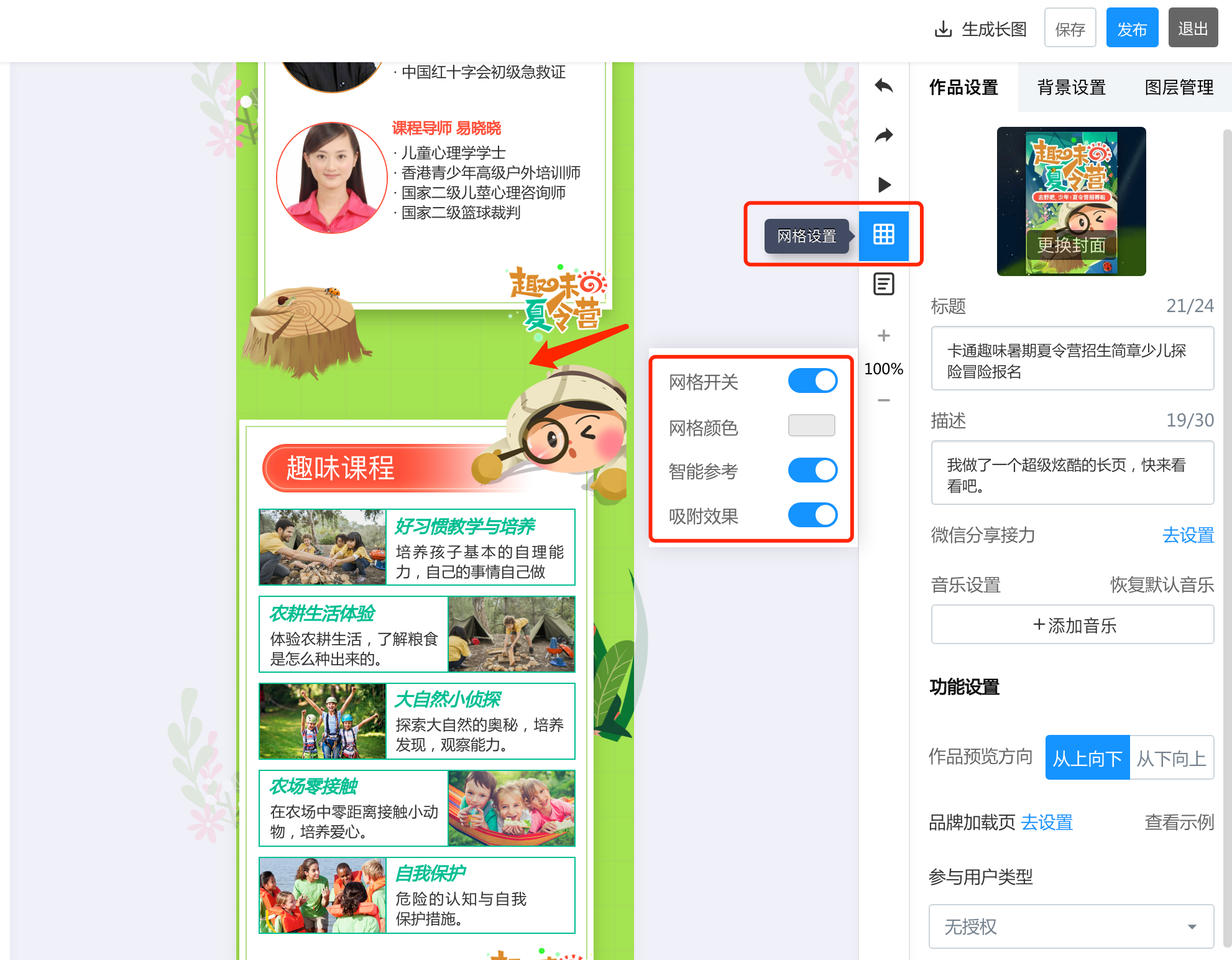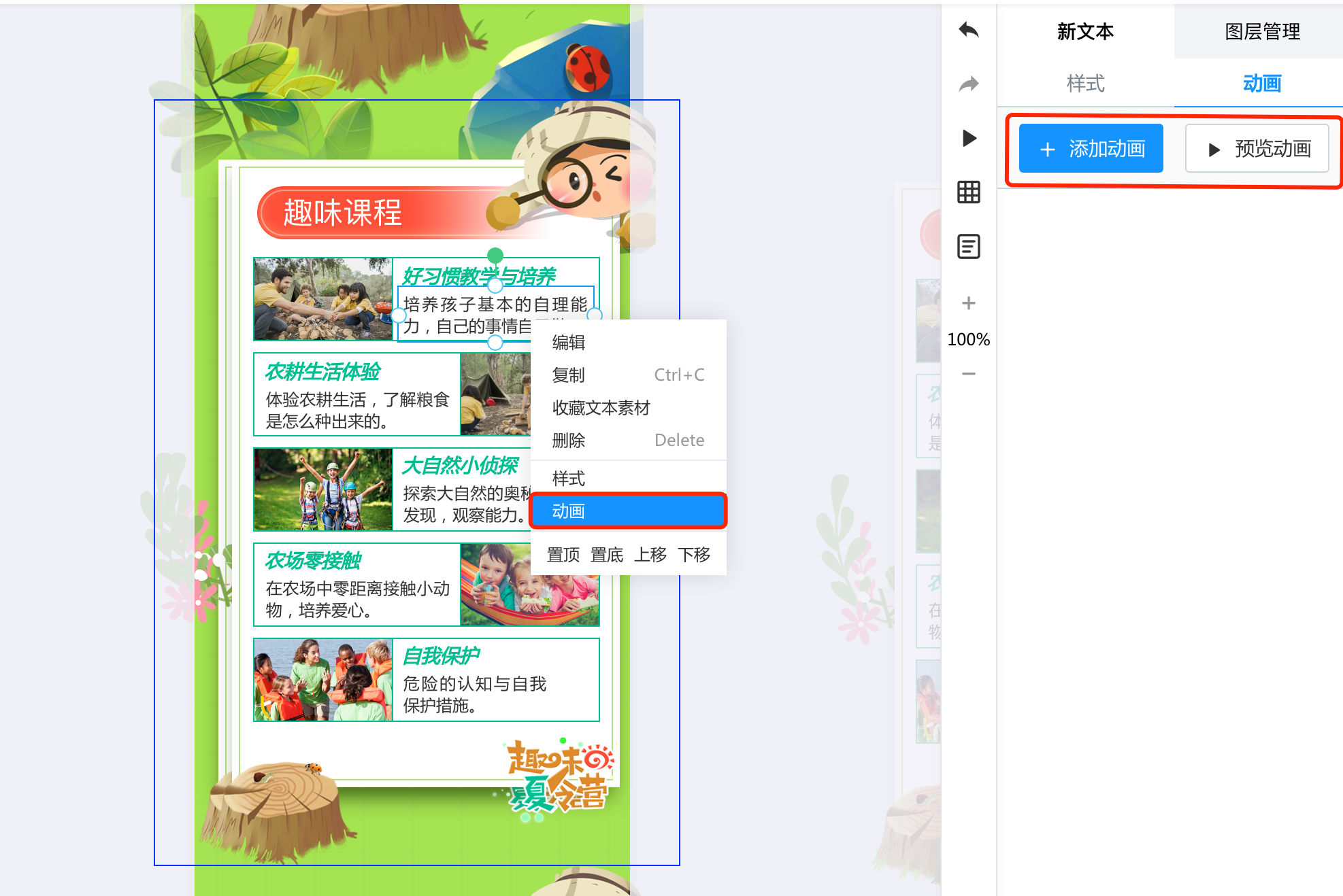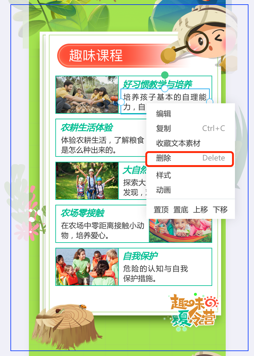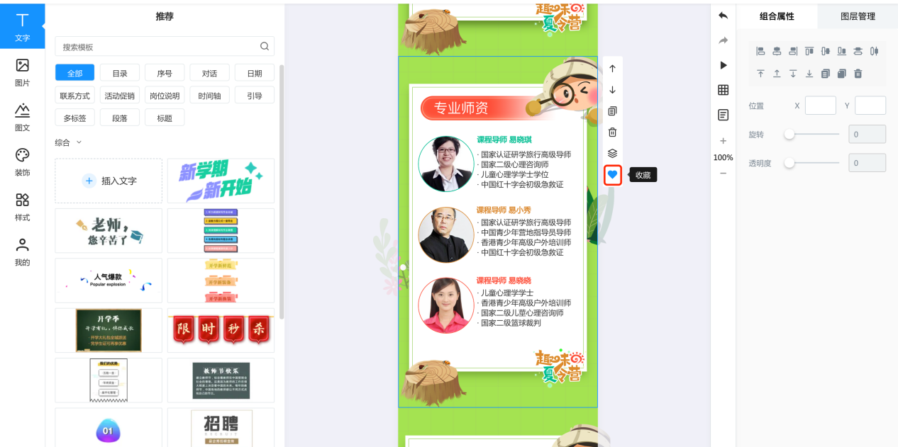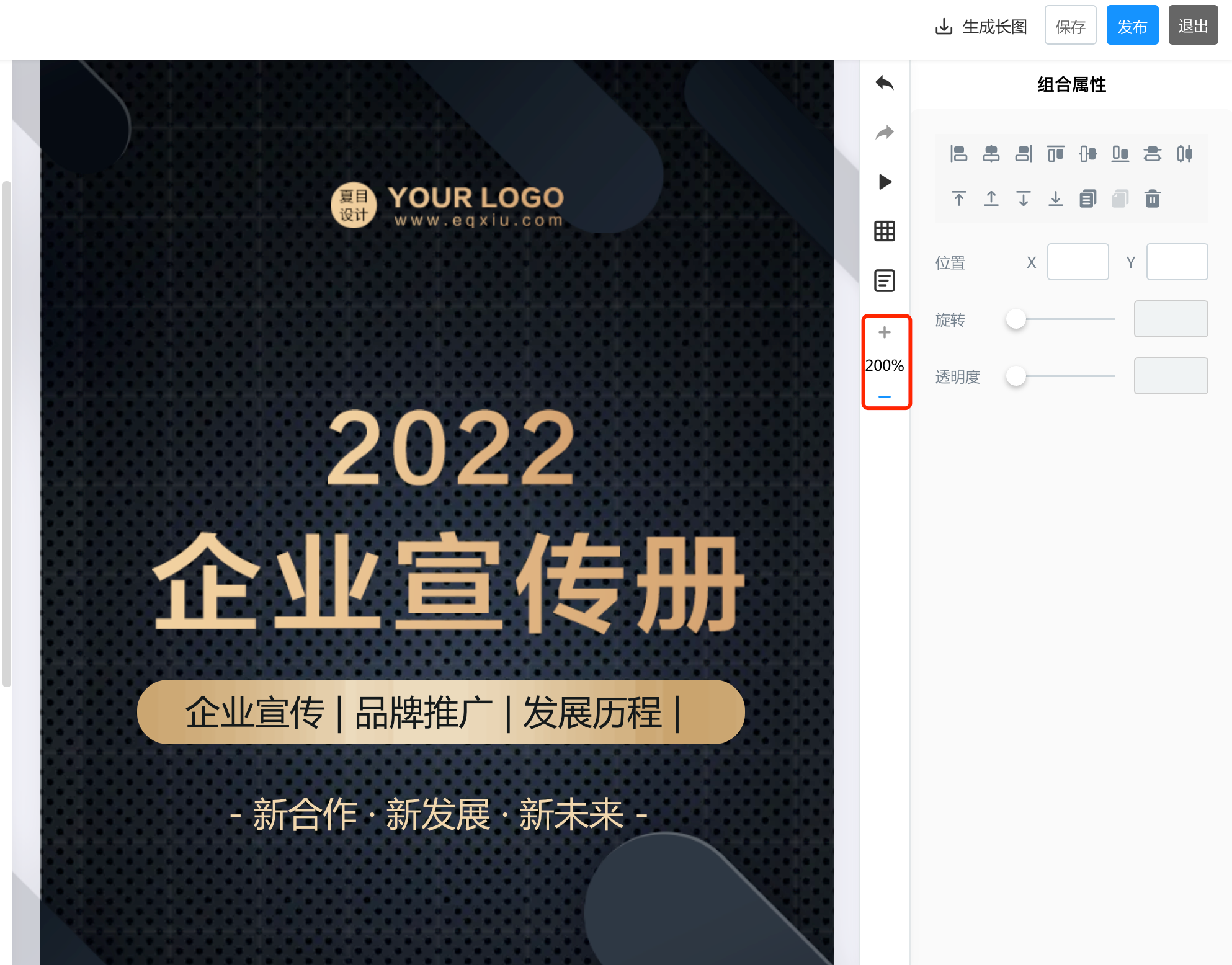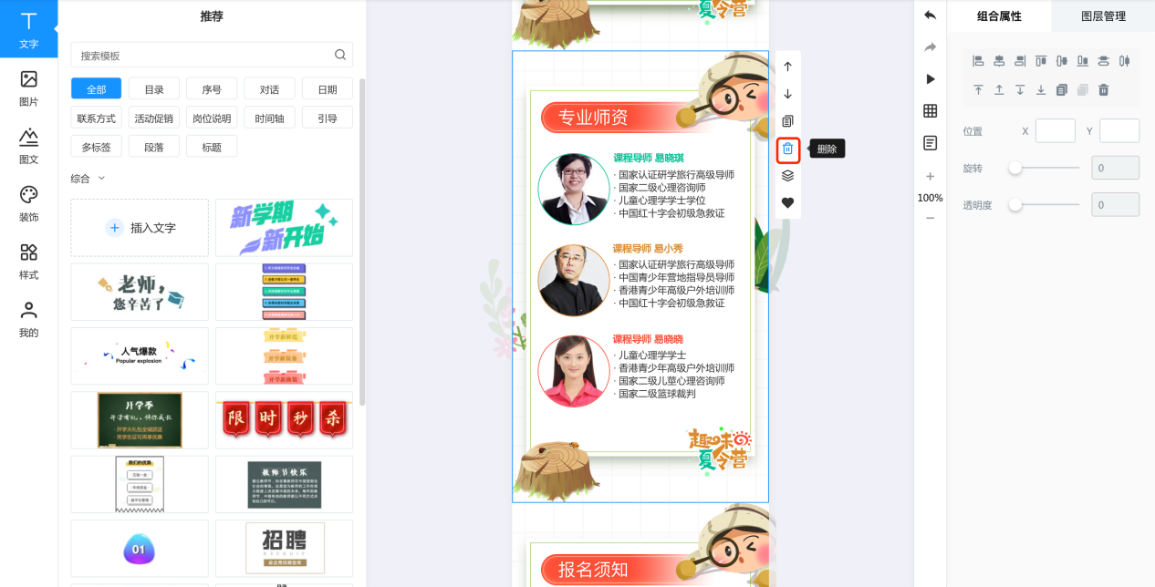 **1.上移下移** 选择要移动的元素组合,右侧会出现上移下移按钮,点击上移会移动到前一个组合前方,点击下移会移动到下一个组合下方。  **2.复制** 选择要复制的元素组合,右侧出现复制按钮,点击复制,在下方会复制出一个同样的元素组合  3.删除 选择要复制的元素组合,右侧出现删除按钮,点击删除,删除掉元素组合  4.收藏 选中某个元素,右侧出现收藏按钮,点击收藏,这个元素组合会被收藏,收藏后的素材在我的-收藏中查找  **5.叠加** 当我们需要把一个组合里的某个元素进行位置调整、复制黏贴等操作,需要使用叠加功能 选中元素组合,右侧出现叠加按钮,点击叠加后,这个组合里的每个小元素都可以移动个改变图层顺序 选中某个元素,可以拖拉拽改变位置,也可以点击右键单独对这个元素进行复制拆分、复制、黏贴等操作 6. 叠加后单个元素的修改 ①叠加后拆分:未拆分前,这个元素始终属于这个组合,点击右键拆分后,小元素将会脱离大组合    ②叠加后复制黏贴 复制整个组合,再点击右键黏贴后,会出现一个新的组合到最上层,次组合的元素也是被叠加过,元素可点击右键进行详细修改  黏贴后的效果如下:  ③叠加后的删除,可以删除整个组合,也可以单独真多某个元素进行删除  ④叠加后的添加到我的收藏组件,组件收藏后,可以在我的收藏中找到  ⑤移动到基础层,移动到基础层以后,将会出现在最底层,一般背景图片使用这个功能  ⑥置顶、上移、下移、置底:可以调整图层的顺序,置顶表示展示在最顶层,置底表示展示在最底层  7.编辑 选中元素,点击右键会出现编辑按钮,点击编辑后,可以针对这个元素进行编辑修改的操作  8. 复制 选中元素后点击右键,出现复制按钮,点击后可复制元素  9. 收藏文本素材 选中元素后点击右键,出现收藏文本素材按钮,点击后可收藏文本素材,收藏后的素材可以在我的-收藏中查看  10. 删除 选中素材后点击右键,出现删除按钮,点击后可删除素材  11. 样式 选中素材后点击右键,出现样式按钮,点击后素材的样式可以在右侧进行修改,如果是文字样式可以修改字体的字号、颜色、对齐方式、跳转链接等修改;如果是图片,可以进行图片的替换、裁剪、边框等修改和设置  12. 动画 选中素材后点击右键,出现动画按钮,点击后可动画可以在右侧进行动画的添加和修改,添加动画后可以预览动画 13. 复制动画 当我们需要把某个元素或组合的动画复制到另外一个元素或组合里时,可以使用复制动画 先选中需要复制的动画元素,点击右键,点击复制动画  再选择需要黏贴的动画元素,点击右键,点击粘贴动画,动画会跟上一个元素的动画一致了  14. 删除动画 当元素中有动画效果时,选中后点击右键会出现删除动画的按钮,点击后动画效果删除  15. 撤销:撤销上一步操作   16. 恢复:恢复上一步操作  17. 刷新预览:点击刷新预览后,可以预览作品的整体样式  18. 网格设置 网格设置可以开启网格、调整网格颜色、开启智能参考、吸附效果  19. 目录 点击右侧的目录按钮  选中需要生成目录的文本,再点击目录的设置为标题,设为标题1是一级标题,设为标题2为二级标题,设为标题3位三级标题 目录文字的颜色、对齐、可以在右侧的新文本处进行修改调整   20. 画布缩放 点击右侧的“+”“-”按钮,可以快速缩放整个画布尺寸  21. 组合属性 选中组合后,右侧编辑区会出现组合属性,在组合属性中可以调整组合的对齐方式、置顶、置底、复制、黏贴、旋转、透明度等操作