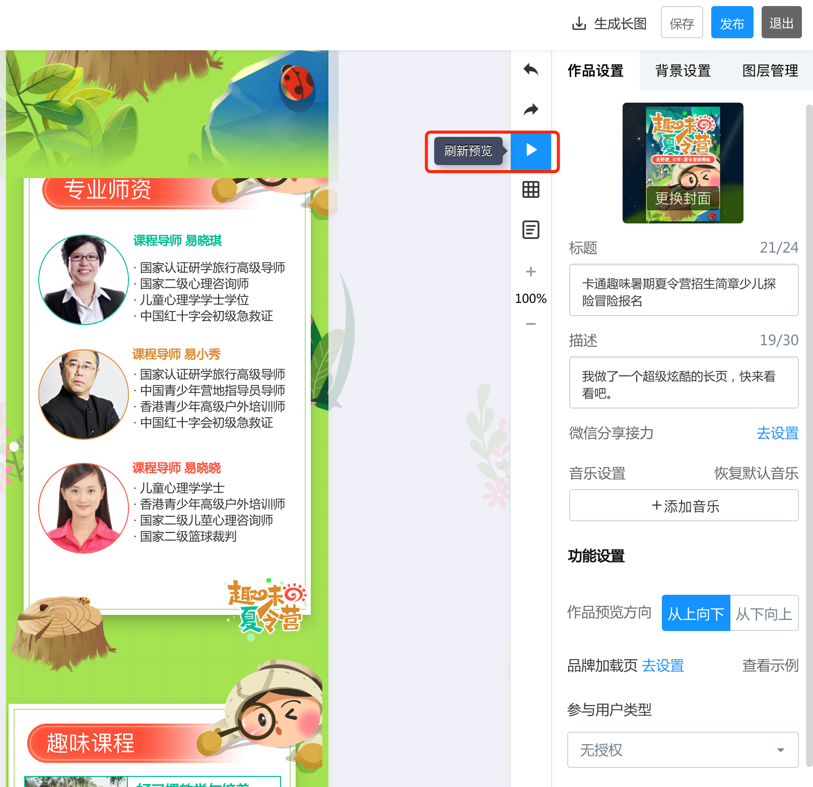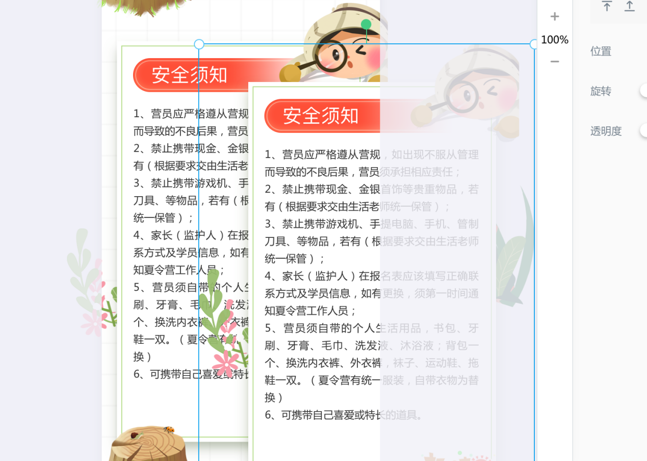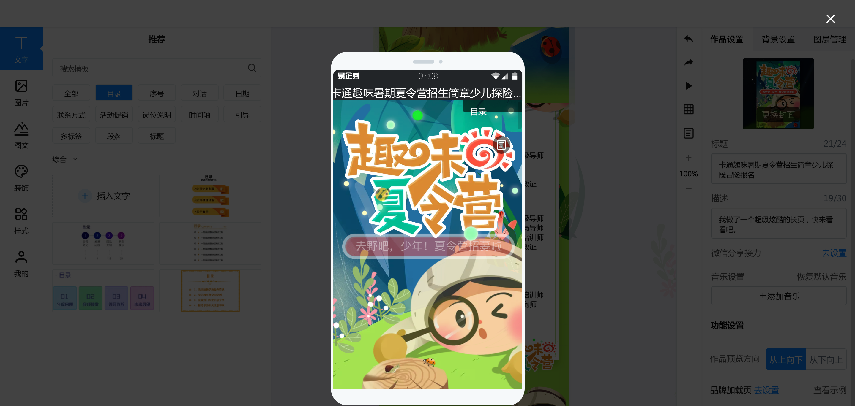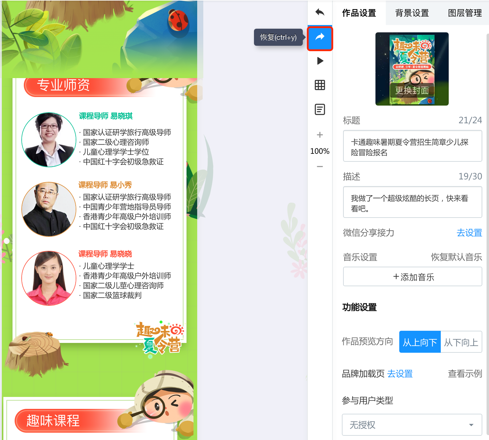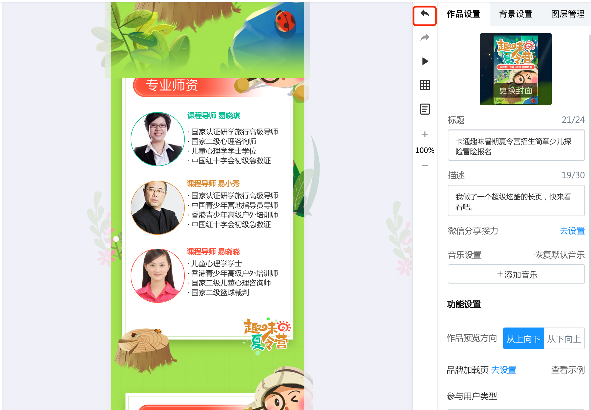 **1.上移下移** 选择要移动的元素组合,右侧会出现上移下移按钮,点击上移会移动到前一个组合前方,点击下移会移动到下一个组合下方。  **2.复制** 选择要复制的元素组合,右侧出现复制按钮,点击复制,在下方会复制出一个同样的元素组合  3.删除 选择要复制的元素组合,右侧出现删除按钮,点击删除,删除掉元素组合  4.收藏 选中某个元素,右侧出现收藏按钮,点击收藏,这个元素组合会被收藏,收藏后的素材在我的-收藏中查找  **5.叠加** 当我们需要把一个组合里的某个元素进行位置调整、复制黏贴等操作,需要使用叠加功能 选中元素组合,右侧出现叠加按钮,点击叠加后,这个组合里的每个小元素都可以移动个改变图层顺序 选中某个元素,可以拖拉拽改变位置,也可以点击右键单独对这个元素进行复制拆分、复制、黏贴等操作 6. 叠加后单个元素的修改 ①叠加后拆分:未拆分前,这个元素始终属于这个组合,点击右键拆分后,小元素将会脱离大组合    ②叠加后复制黏贴 复制整个组合,再点击右键黏贴后,会出现一个新的组合到最上层,次组合的元素也是被叠加过,元素可点击右键进行详细修改  黏贴后的效果如下:  ③叠加后的删除,可以删除整个组合,也可以单独真多某个元素进行删除  ④叠加后的添加到我的收藏组件,组件收藏后,可以在我的收藏中找到  ⑤移动到基础层,移动到基础层以后,将会出现在最底层,一般背景图片使用这个功能  ⑥置顶、上移、下移、置底:可以调整图层的顺序,置顶表示展示在最顶层,置底表示展示在最底层  7.编辑 选中元素,点击右键会出现编辑按钮,点击编辑后,可以针对这个元素进行编辑修改的操作  8. 复制 选中元素后点击右键,出现复制按钮,点击后可复制元素  9. 收藏文本素材 选中元素后点击右键,出现收藏文本素材按钮,点击后可收藏文本素材,收藏后的素材可以在我的-收藏中查看  10. 删除 选中素材后点击右键,出现删除按钮,点击后可删除素材  11. 样式 选中素材后点击右键,出现样式按钮,点击后素材的样式可以在右侧进行修改,如果是文字样式可以修改字体的字号、颜色、对齐方式、跳转链接等修改;如果是图片,可以进行图片的替换、裁剪、边框等修改和设置  12. 动画 选中素材后点击右键,出现动画按钮,点击后可动画可以在右侧进行动画的添加和修改,添加动画后可以预览动画 13. 复制动画 当我们需要把某个元素或组合的动画复制到另外一个元素或组合里时,可以使用复制动画 先选中需要复制的动画元素,点击右键,点击复制动画  再选择需要黏贴的动画元素,点击右键,点击粘贴动画,动画会跟上一个元素的动画一致了  14. 删除动画 当元素中有动画效果时,选中后点击右键会出现删除动画的按钮,点击后动画效果删除  15. 撤销:撤销上一步操作   16. 恢复:恢复上一步操作  17. 刷新预览:点击刷新预览后,可以预览作品的整体样式  18. 网格设置 网格设置可以开启网格、调整网格颜色、开启智能参考、吸附效果  19. 目录 点击右侧的目录按钮  选中需要生成目录的文本,再点击目录的设置为标题,设为标题1是一级标题,设为标题2为二级标题,设为标题3位三级标题 目录文字的颜色、对齐、可以在右侧的新文本处进行修改调整   20. 画布缩放 点击右侧的“+”“-”按钮,可以快速缩放整个画布尺寸  21. 组合属性 选中组合后,右侧编辑区会出现组合属性,在组合属性中可以调整组合的对齐方式、置顶、置底、复制、黏贴、旋转、透明度等操作