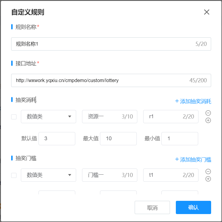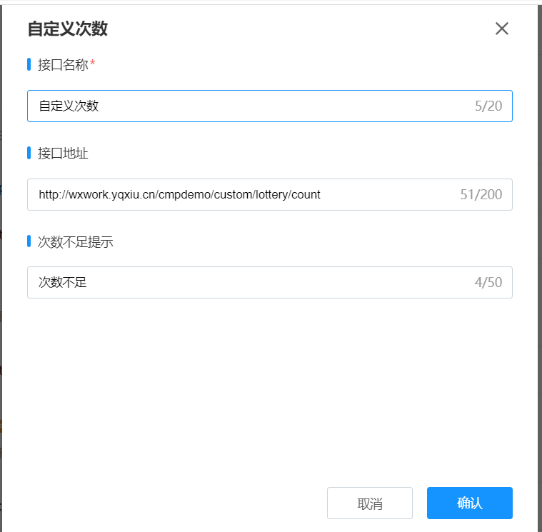 ## 系统集成管理/应用管理配置 ### 新增/更新集成配置 - 接口描述:对于系统集成管理或应用管理配置进行api配置保存接口 - 接口地址:/api/v1/base/open/app/config/save?token=TOKEN - 请求方式:POST - Content-Type: multipart/form-data - 接口入参 | 参数名 | 必须 | 参数类型 | 参数说明 | | --- | --- | --- | --- | | productId | 是 | int | 0:自用 1:平台id,在开放管理内获取 | | cfgKey | 是 | String | 集成管理业务key 1002:自主用户系统 1006:互动-自定义规则 1012:互动-自定义抽奖次数 1004: 页面集成| | cfgId | 否 | Long | 规则id 可选传参:若可以针对业务 key可以配置多条的 更新时需要传此字段(比如抽奖规则)| | value | 是 | String | json数据配置 各种类型的配置json格式不一样 具体看下面的json实际举例 | ### 查询集成配置 - 接口描述:查询集成配置 - 接口地址:/api/v1/base/param/params?token=TOKEN - 请求方式:POST - Content-Type: multipart/form-data - 接口入参 | 参数名 | 必须 | 参数类型 | 参数说明 | | --- | --- | --- | --- | | key | 是 |String |集成管理业务key 1002:自主用户系统 1006:互动-自定义规则 1012:互动-自定义抽奖次数 1004: 页面集成 1504:自定义脚本(JS)| ```json { "success": true, "code": "200", "msg": null, "obj": null, "map": null, "list": [{ "id": 5031, "key": "1006", "value": "{\"ruleName\":\"哈哈\",\"apiUrl\":\"http://www.eqxiu.com\"}", "remark": null, "relType": "PRODUCT", "relId": "1001", "sort": 2, "saveTime": "2021-08-19 12:04:49", "default": false }], "details": null } ``` ### 删除指定集成配置 - 接口描述:删除集成配置 - 接口地址:/api/v1/base/open/app/config/delete?token=TOKEN - 请求方式:POST - Content-Type: multipart/form-data - 接口入参 | 参数名 | 必须 | 参数类型 | 参数说明 | | --- | --- | --- | --- | | productId | 是 | int | 0:自用 1:平台id,在开放管理内获取 | | cfgId | 是 | Long | 规则id | 各种场景配置实例举例 ### 自主用户系统 ```json { "id":123, "sysName": "系统名称", "authorizeUrl": "http://www.xx.com/xyz", "userGetUrl": "http://www.xx.com" } ``` > id:cfgId sysName:系统名称 authorizeUrl:授权页地址 userGetUrl:用户信息获取接口地址 ### 互动-自定义抽奖规则  像上述配置 的传参如下 ```json { "ruleName": "规则名称1", "apiUrl": "http://wxwork.yqxiu.cn/cmpdemo/custom/lottery", "consume": [{ "type": 1, "name": "资源一", "paramName": "r1", "default": "3", "max": "10", "min": "1", "required": false, "checkInfo": { "name": "", "paramName": "", "default": "", "max": "", "min": "", "type": "", "required": "", "checkInfo": "" } }], "threshold": [{ "type": 1, "name": "门槛一", "paramName": "t1", "default": "2", "max": "3", "min": "1", "required": false, "checkInfo": { "name": "", "paramName": "", "default": "", "max": "", "min": "", "type": "", "required": "", "checkInfo": "", "options": "" }, "options": [{ "label": "", "value": "", "required": false, "checkInfo": { "label": "", "value": "" } }] }], "thirdLimitV2": "0" } ``` > ruleName:规则名称 apiUrl:规则地址 consume:抽奖消耗配置 threshold: ### 互动-自定义抽奖次数  像上述配置 的传参如下 ```json { "id":123 "ruleName": "自定义次数", "apiUrl": "http://wxwork.yqxiu.cn/cmpdemo/custom/lottery/count", "tip": "次数不足" } ``` > ruleName:规则名称 apiUrl:规则地址 tip:次数不够的提示语 ### 页面集成 ```json { "url": "", "exitUrl": "https://www.eqxiu.cn/creation?eventType=quit", "publishUrl": "https://www.eqxiu.cn/creation?eventType=publish" } ``` > url:登录失效时跳转的地址 publishUrl:从编辑器点击发布后,页面跳转地址 exitUrl:从编辑器点击退出后,页面跳转地址