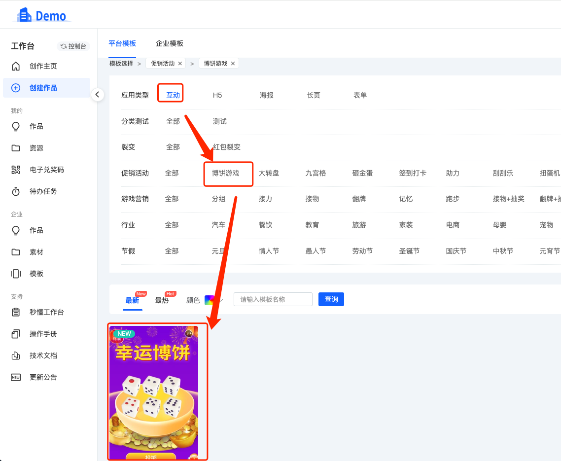 ①模板创建互动作品→②选择“博饼”分类→③进入编辑器配置→④保存发布