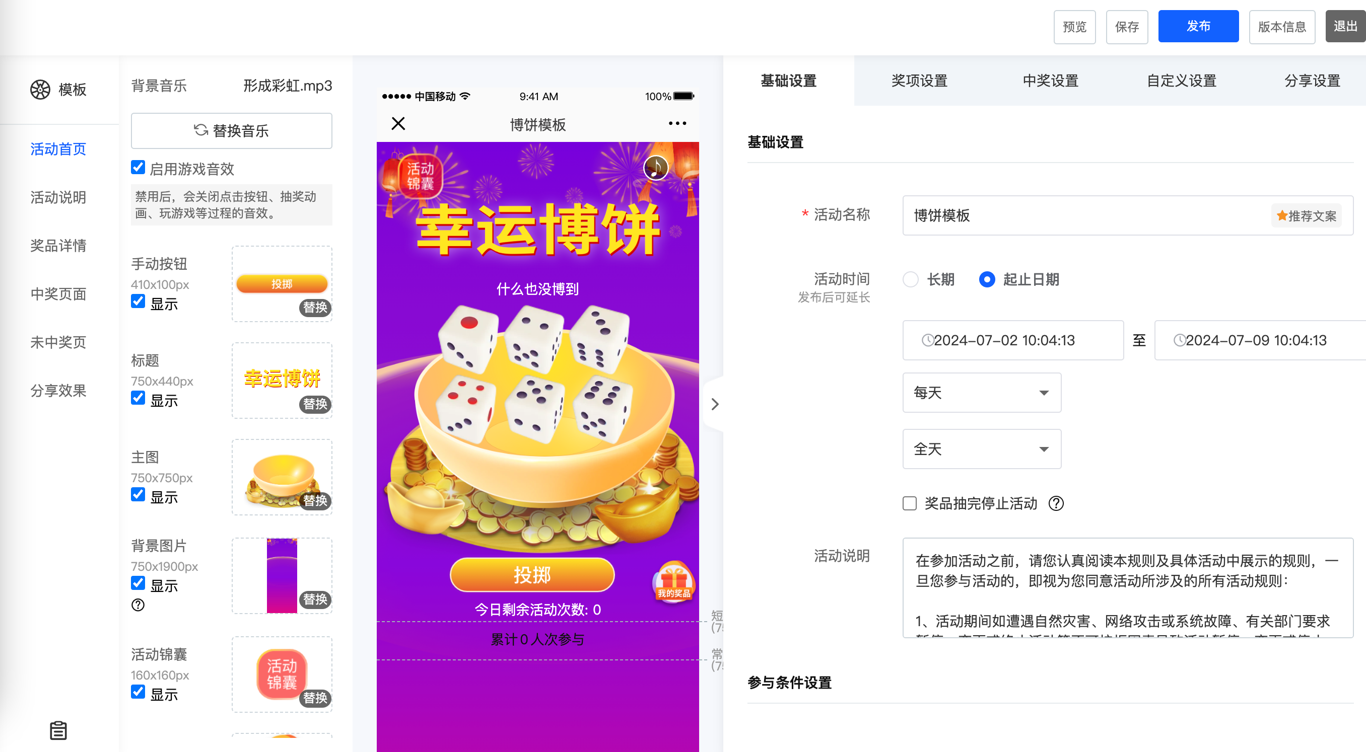 3.1 选择【博饼游戏】模板,进入编辑器,可以更换模板样式,可以设置奖项、中奖设置,增加自定义组件等;