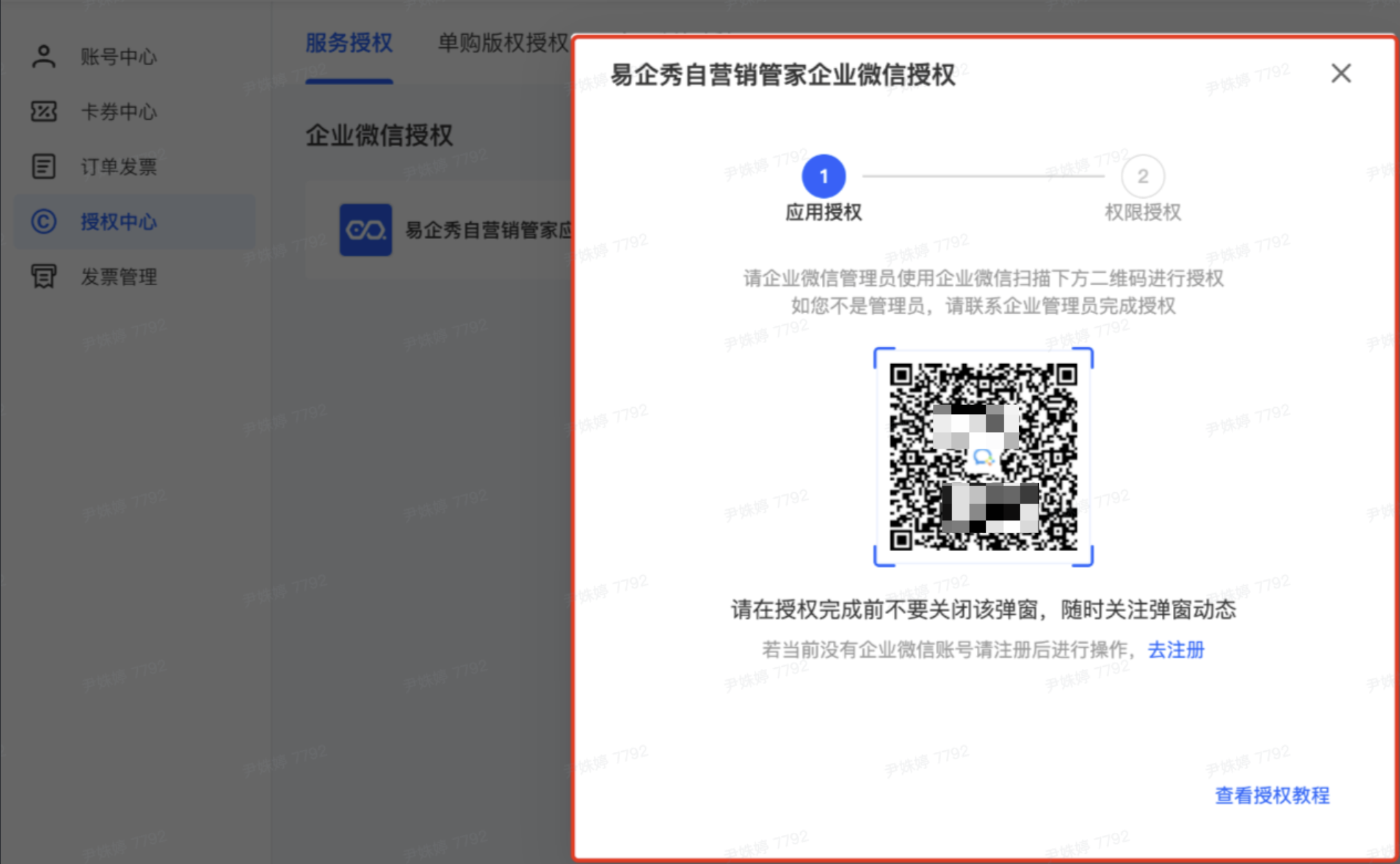 5、扫码添加专属客户经理进行易企秀后台应用授权,授权成功后即可上传【唯一企微码】或多人承接的【获客活码】可使用
