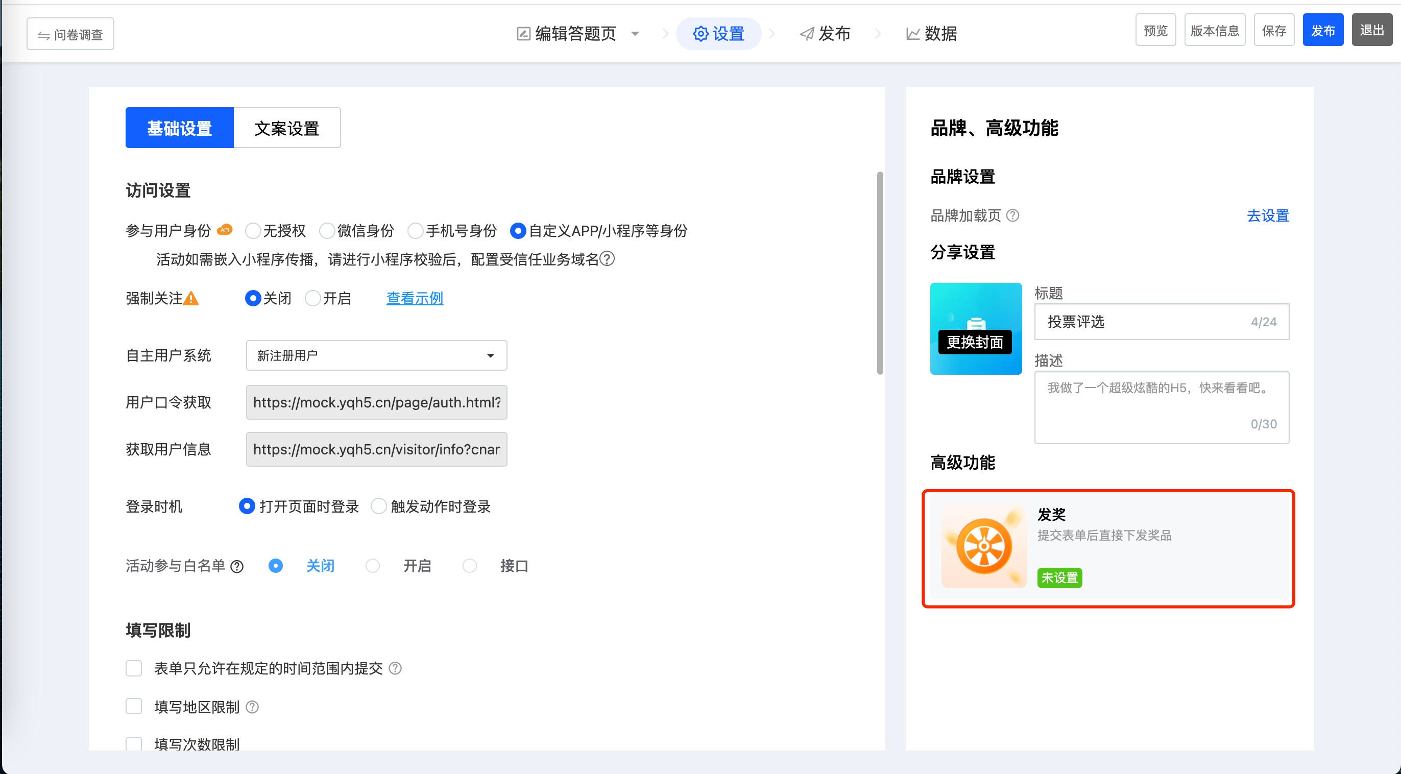 ①通过模板/空白创建打开表单编辑器→②选择问卷调查/报名登记/考试测评类型→③设置答题内容→④点击“设置”,进入设置页面→⑤发奖配置→⑥保存发布