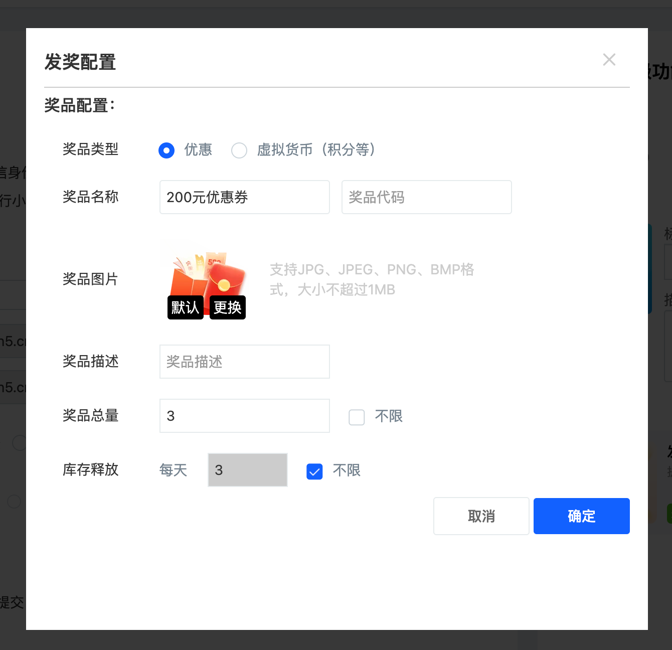 在表单提交后增加发奖配置,企业用户可以给访客自主配置提交后自动下发优惠券还是虚拟货币(积分等),简单便捷实现营销目标。