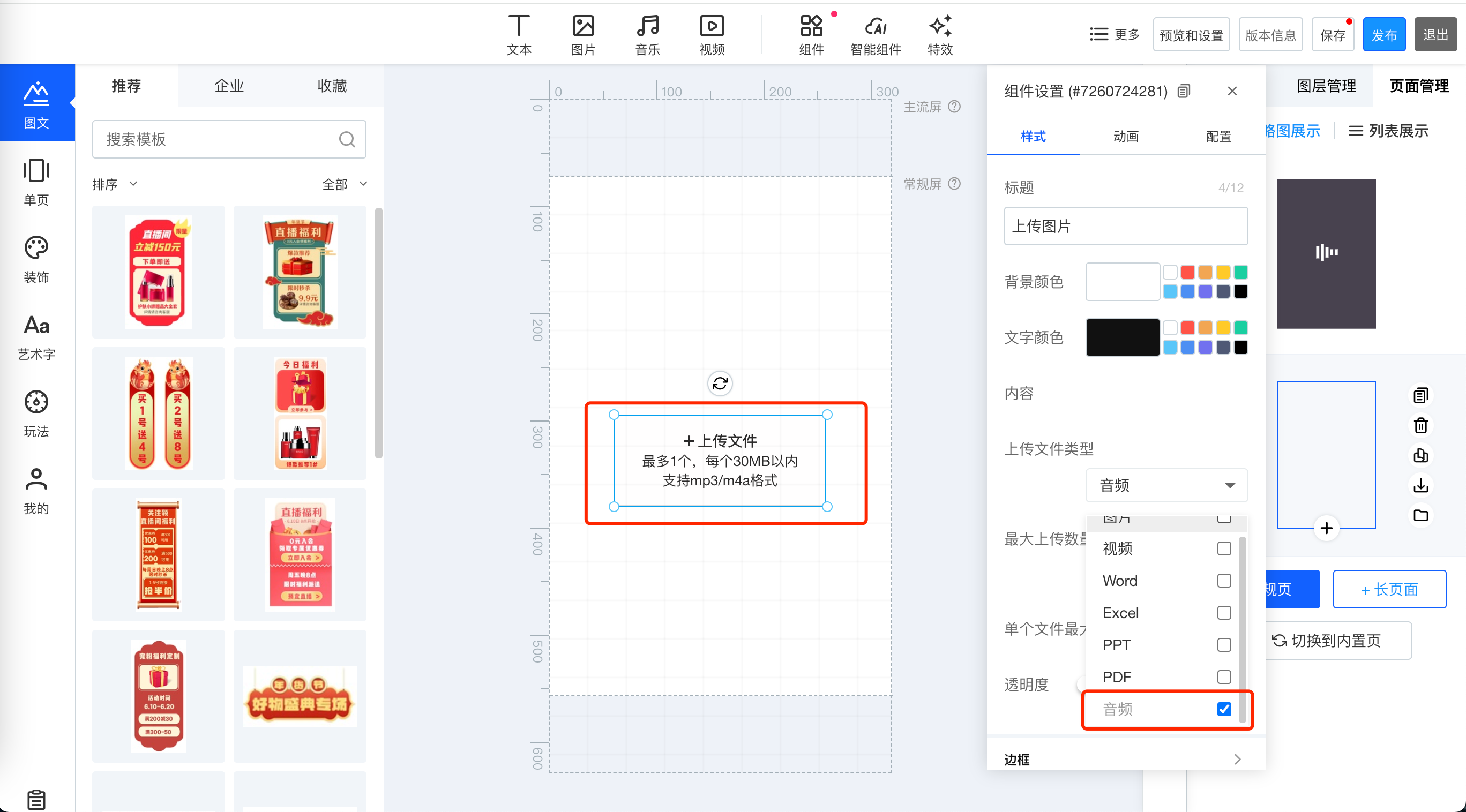 为了满足用户需求,我们在H5编辑器上传附件组件中新增了音频文件,支持上传m4a和mp3格式的音频文件。