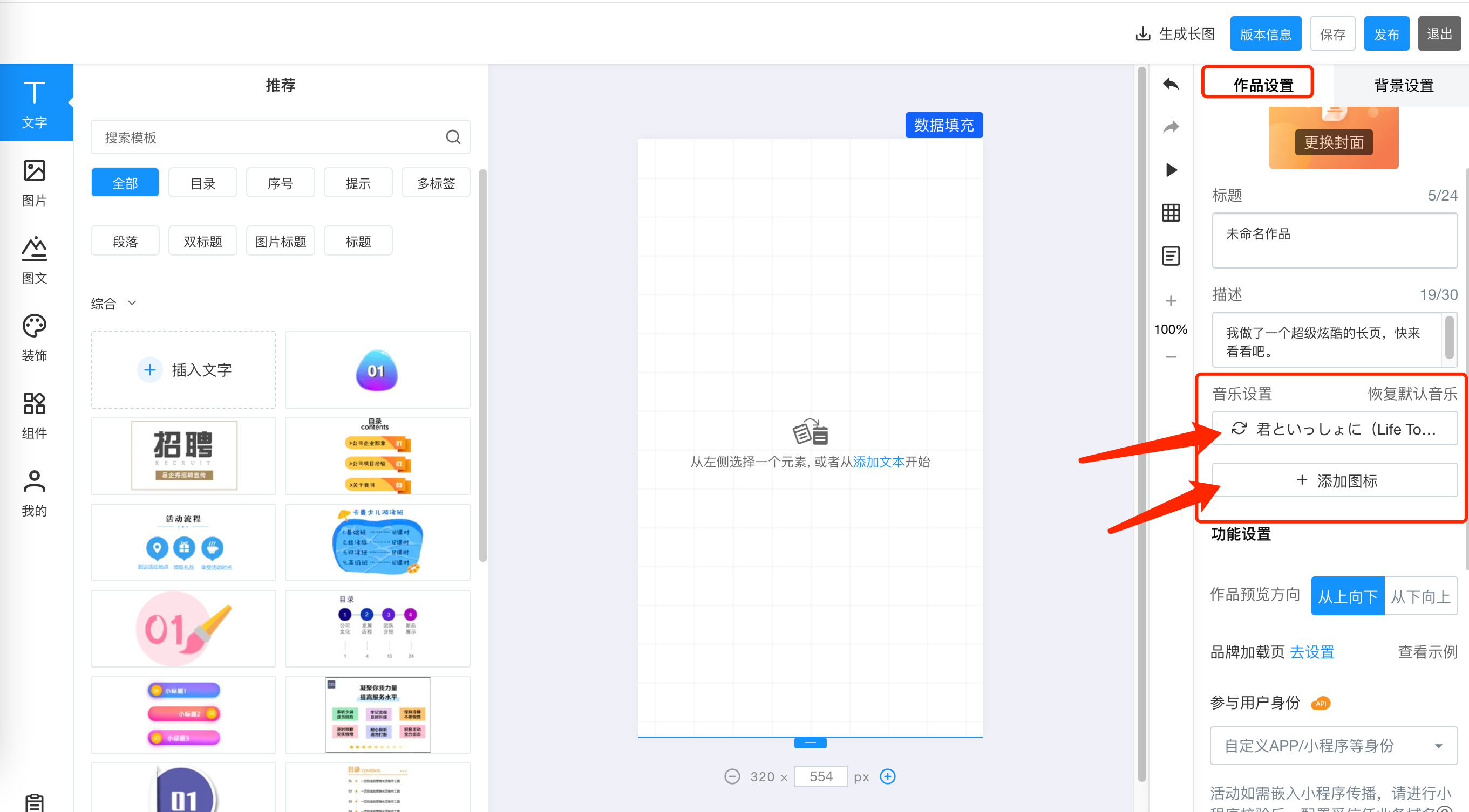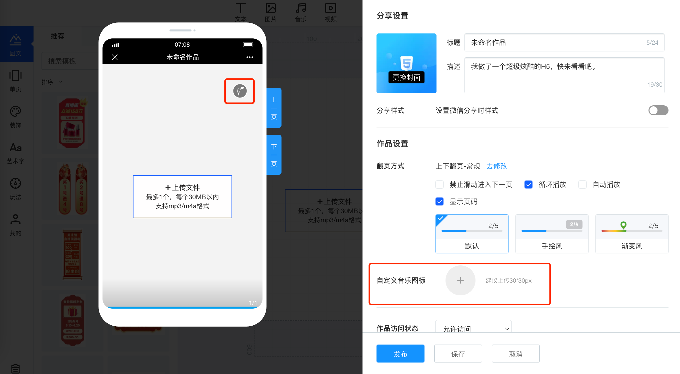①通过模板/空白创建打开各个编辑器→②找到音乐组件的设置→③对音乐图标进行位置和样式的设置→④设置作品其他内容→⑤保存发布