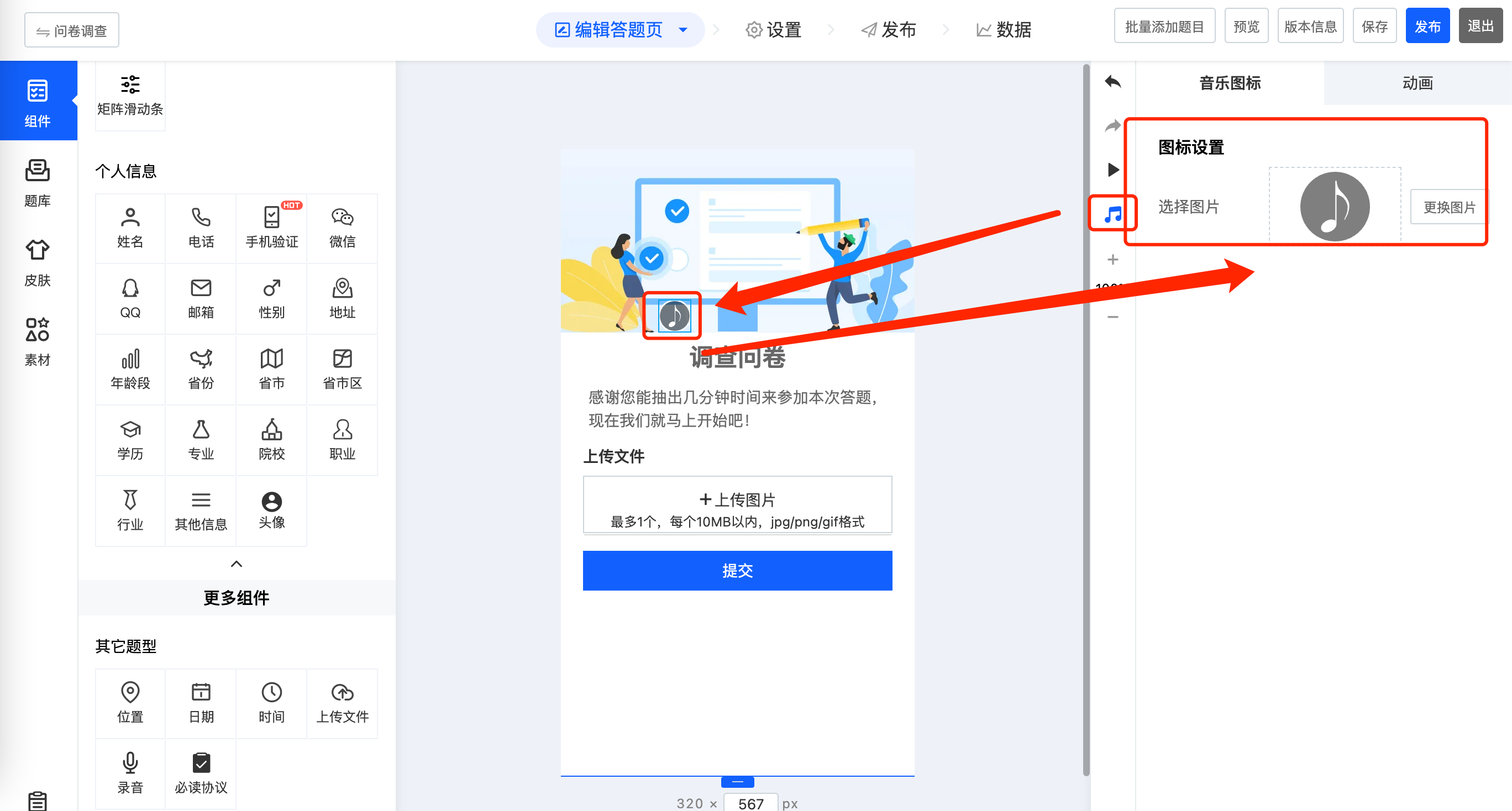 为了满足用户需求,我们在表单/互动/H5/长页编辑器中对音乐图标进行优化,支持更换样式和拖动位置,以防遮挡作品重要信息。