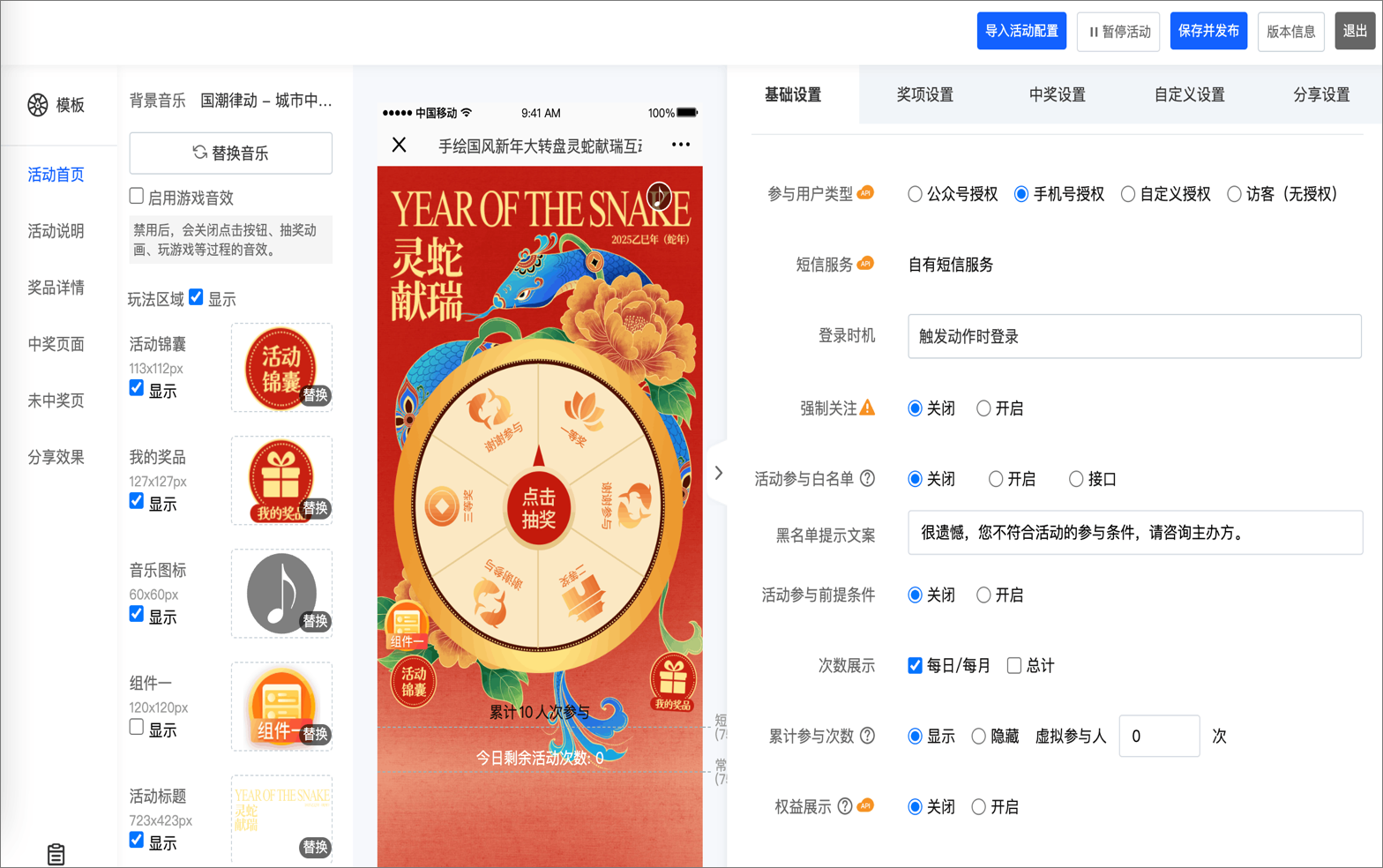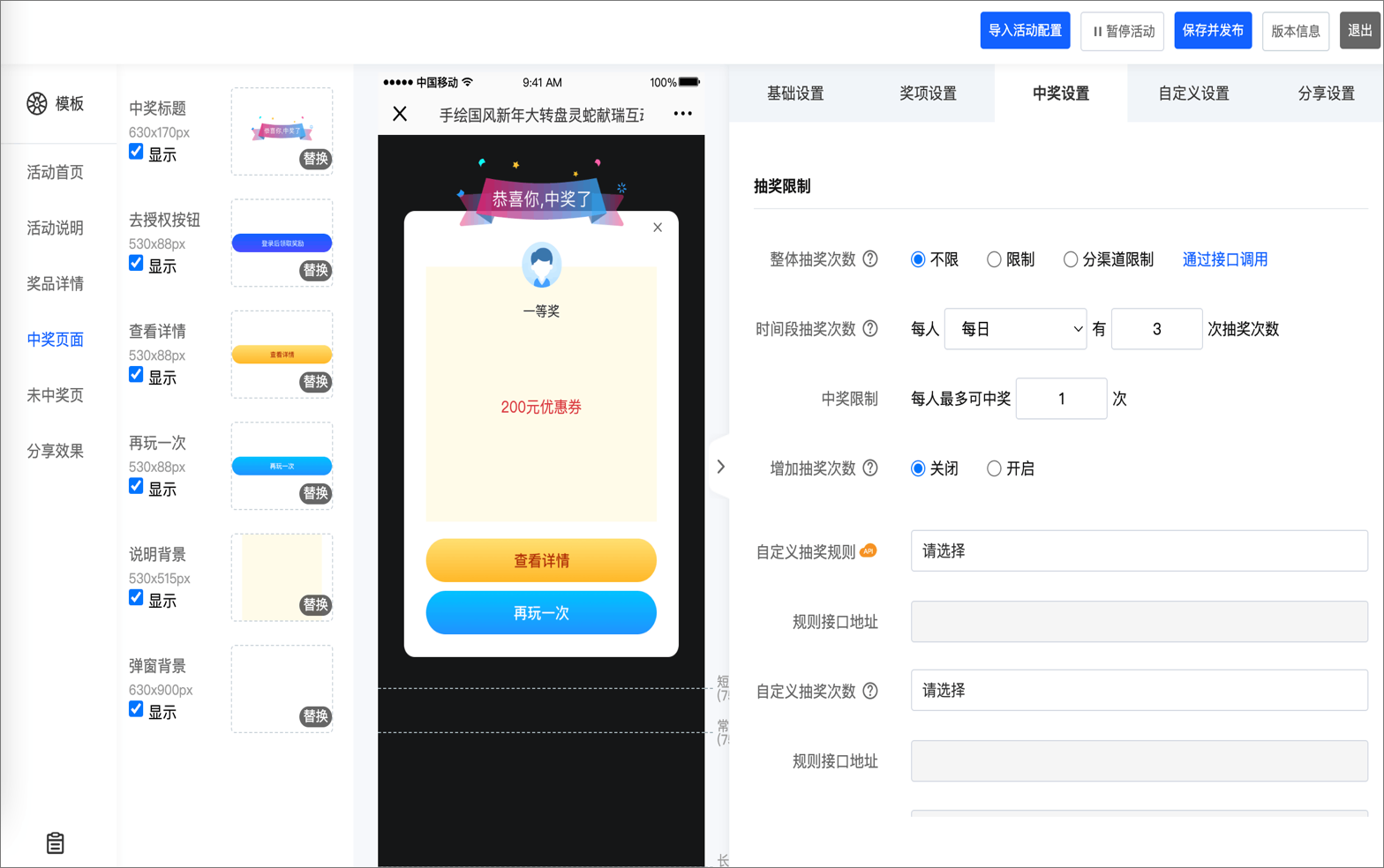 互动作品发布之后,在不暂停情况下可修改基础设置中的所有设置项;奖项设置中的兑奖设置;中奖设置中除了中奖率的所有设置项;自定义设置中的所有设置项;分享设置中的所有设置项;