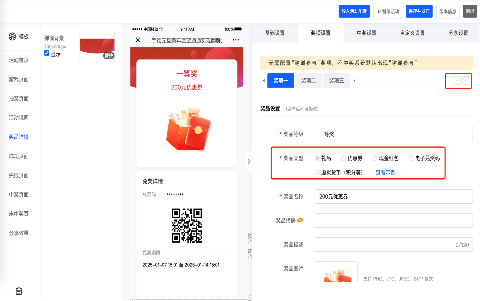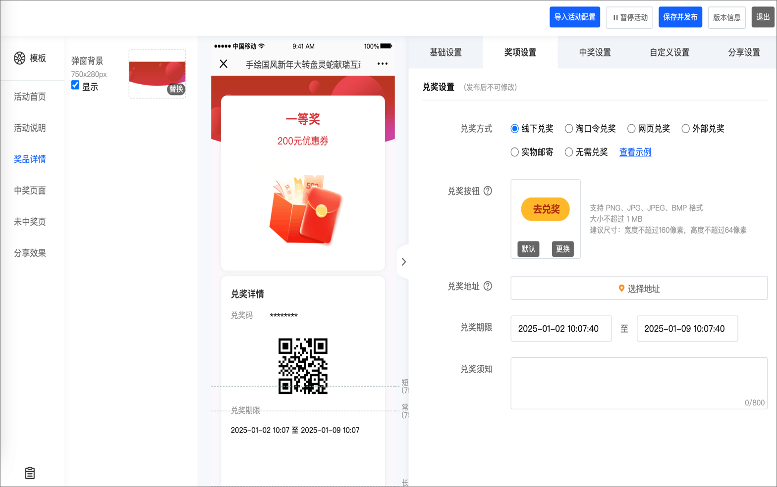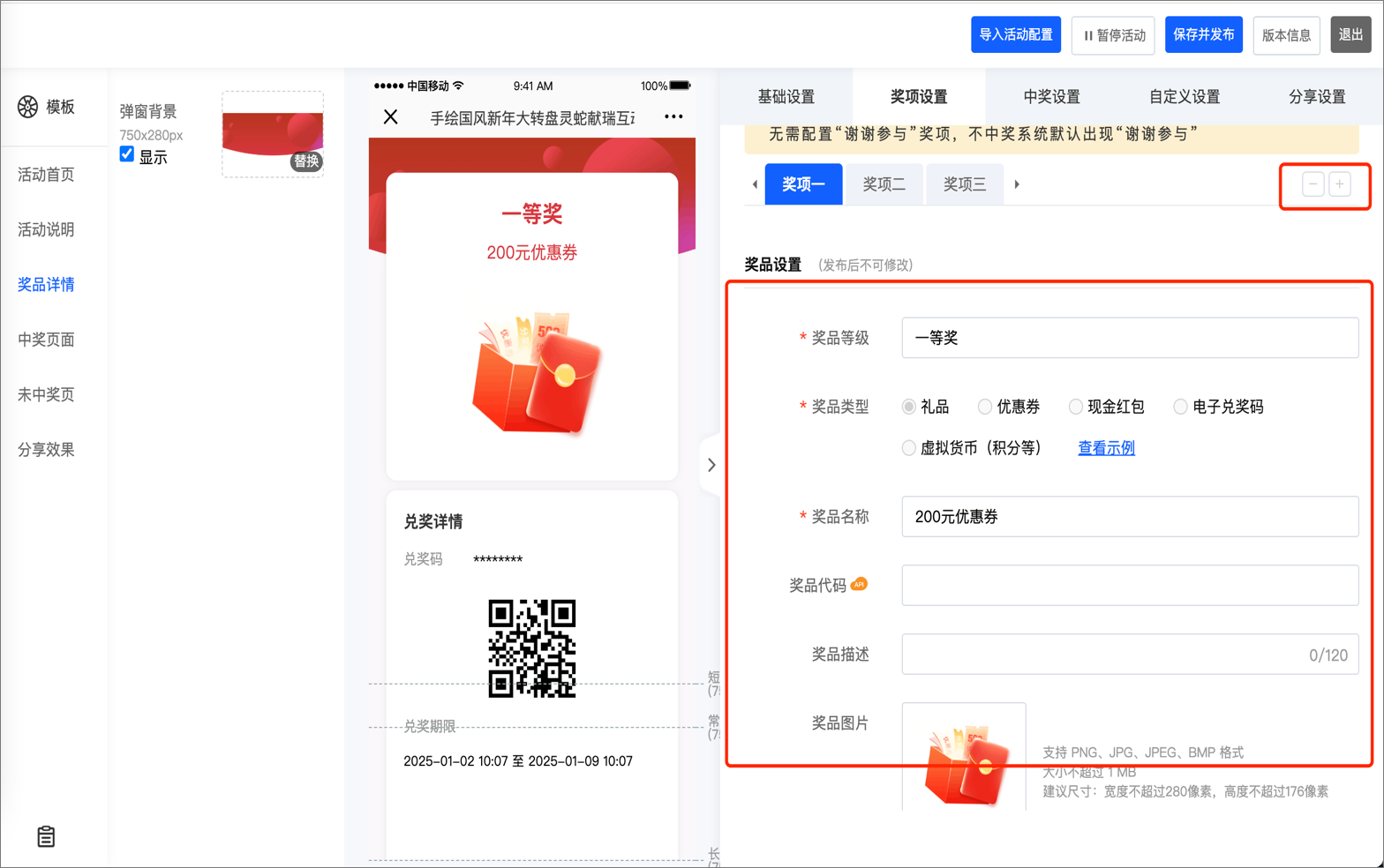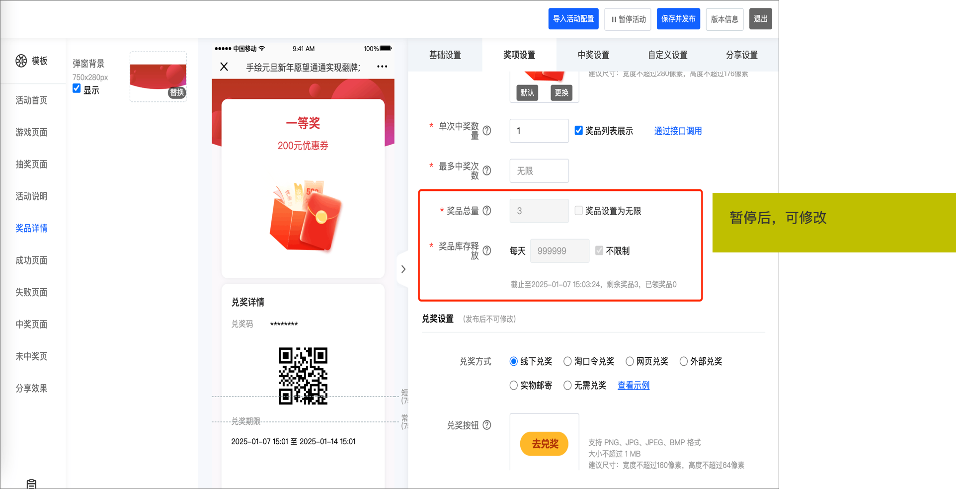 2、互动抽奖作品,不暂停的情况下,奖项设置中的兑奖设置可修改,奖项设置不可修改,且不可增加和减少;