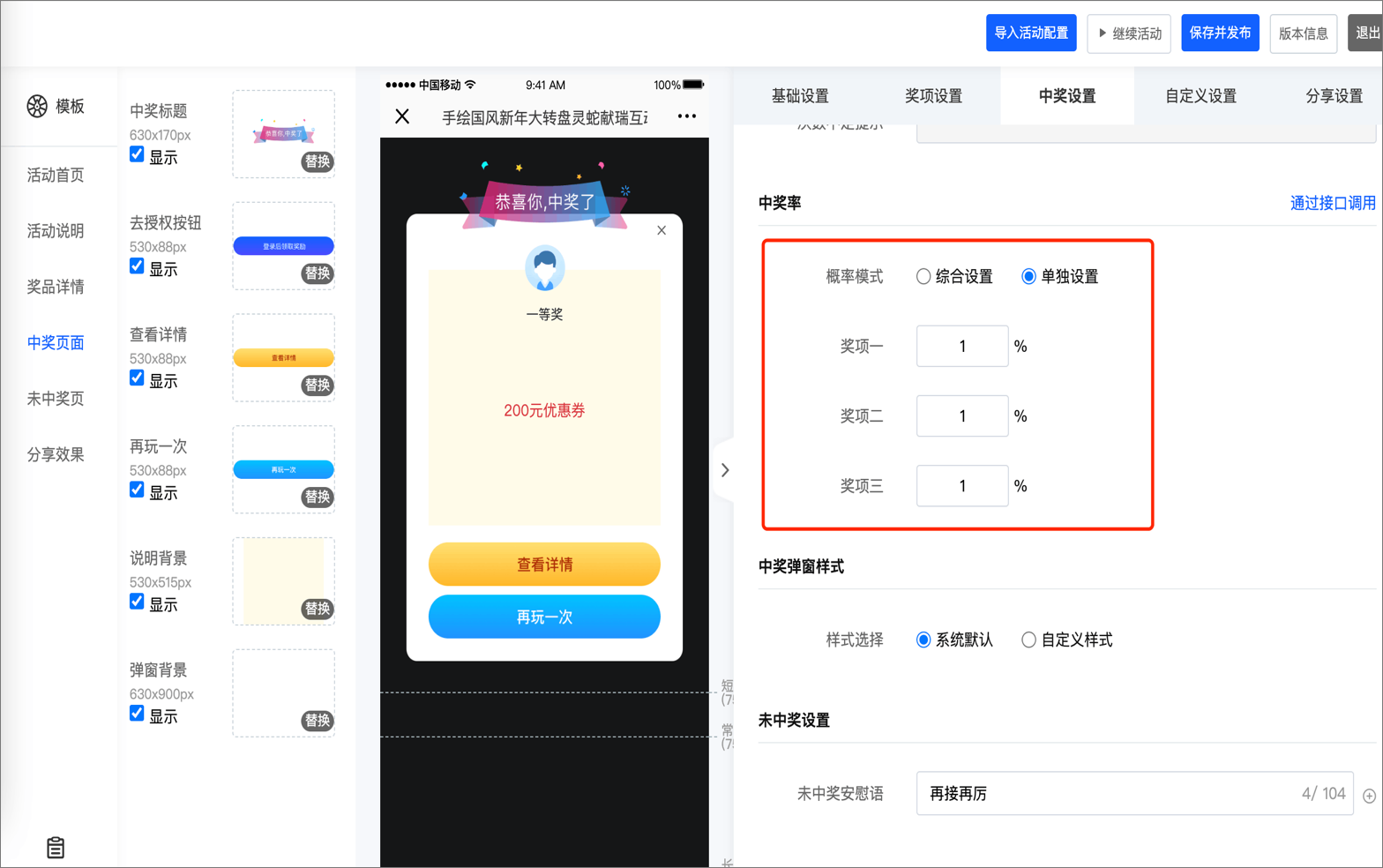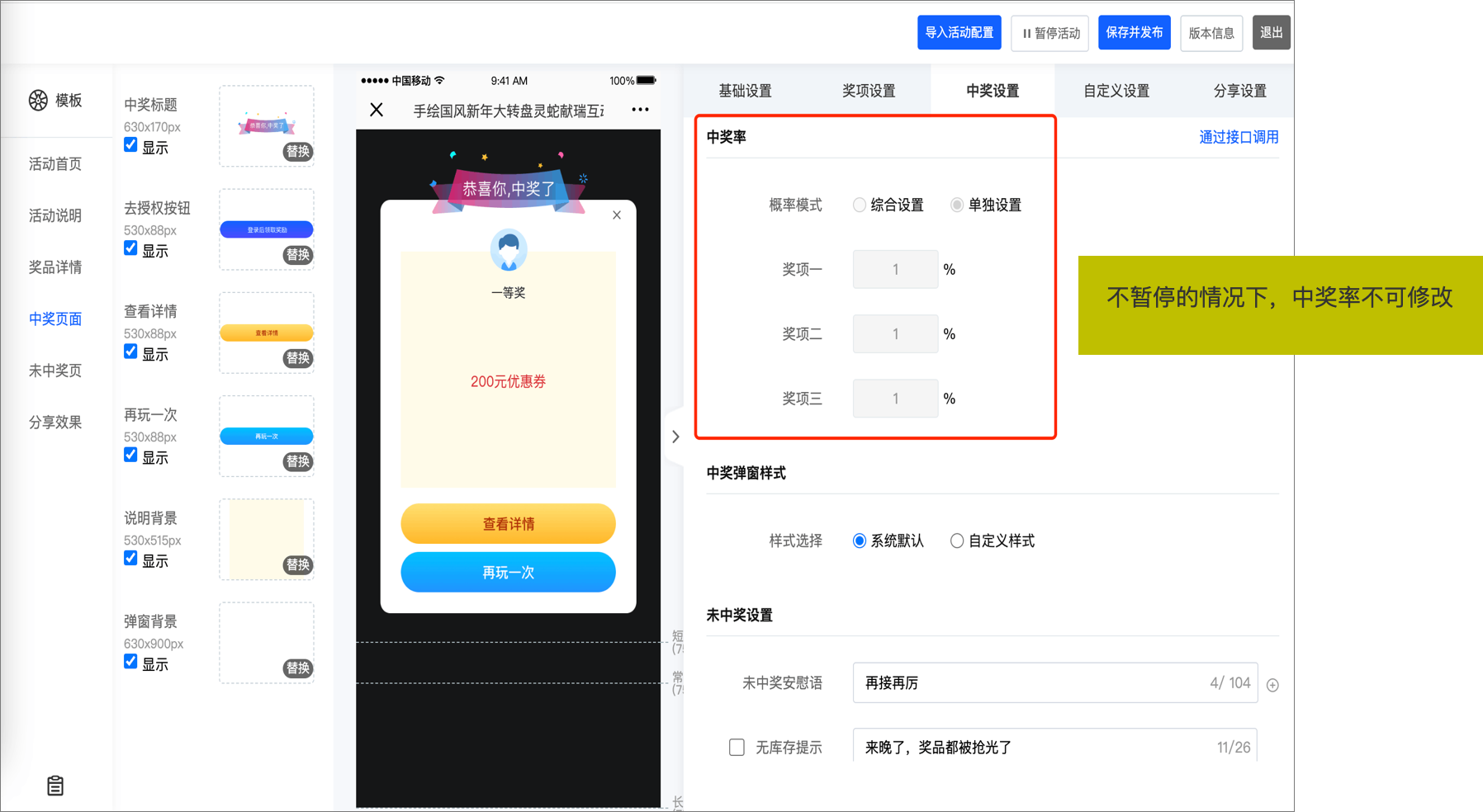 3、互动抽奖作品,不暂停的情况下,中奖设置中的除了中奖率,其他都可修改;