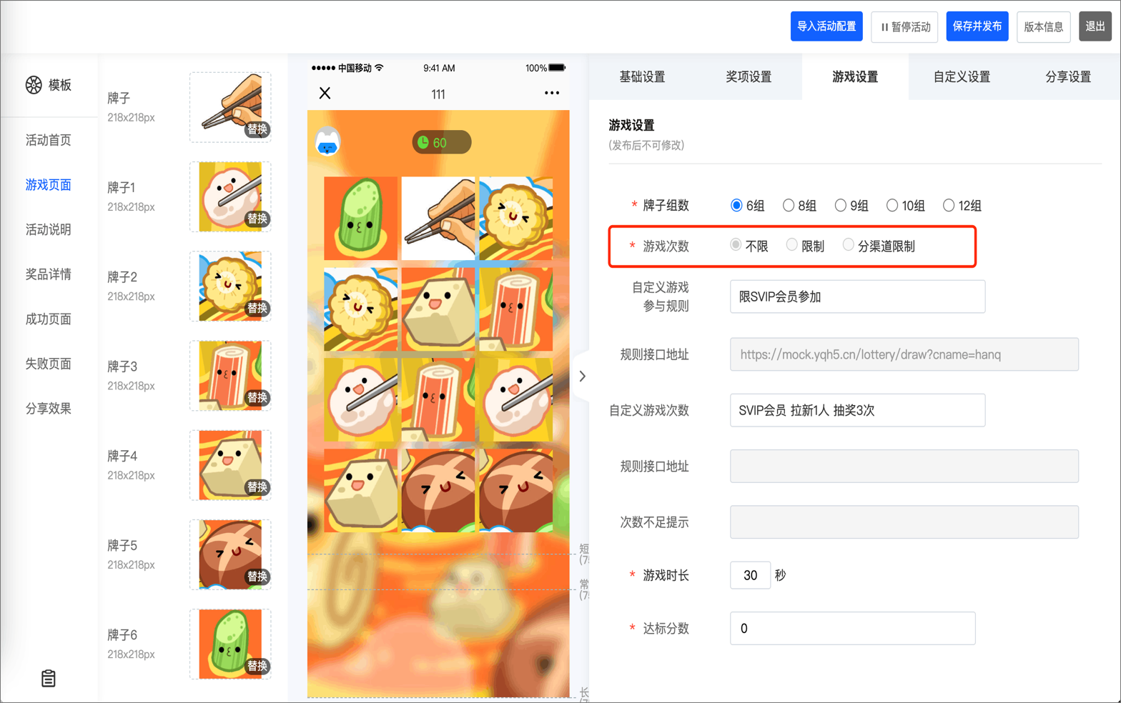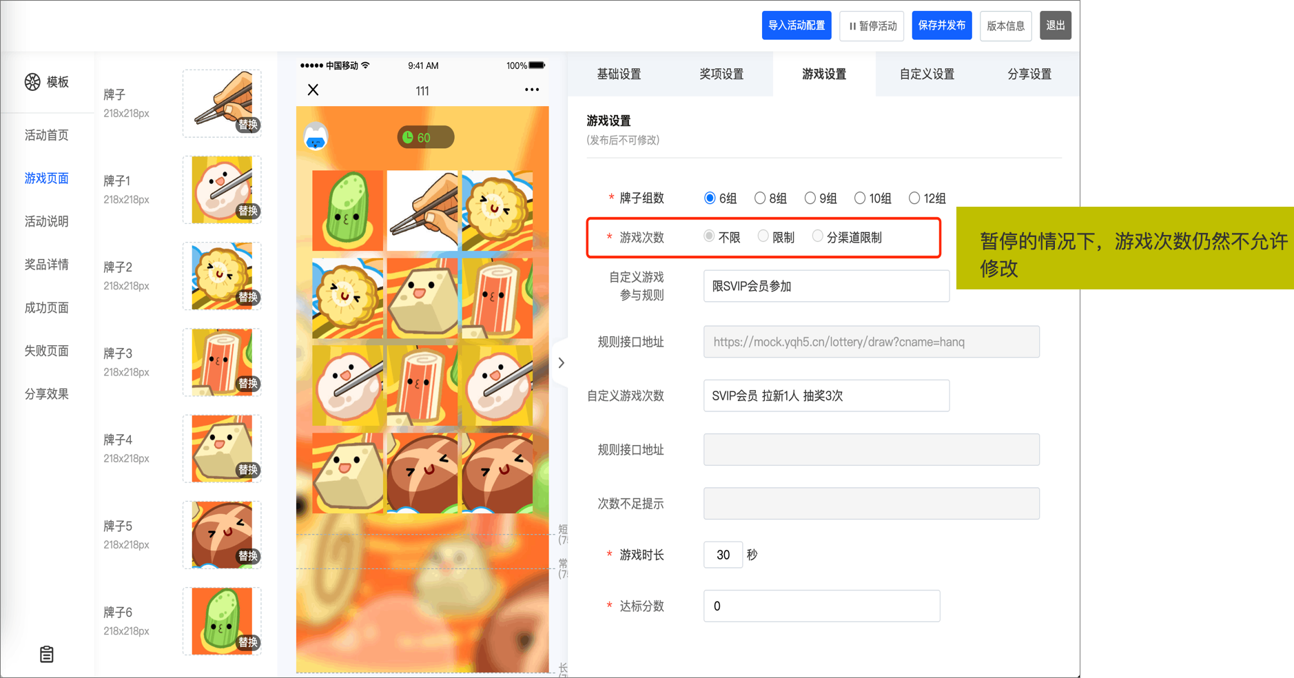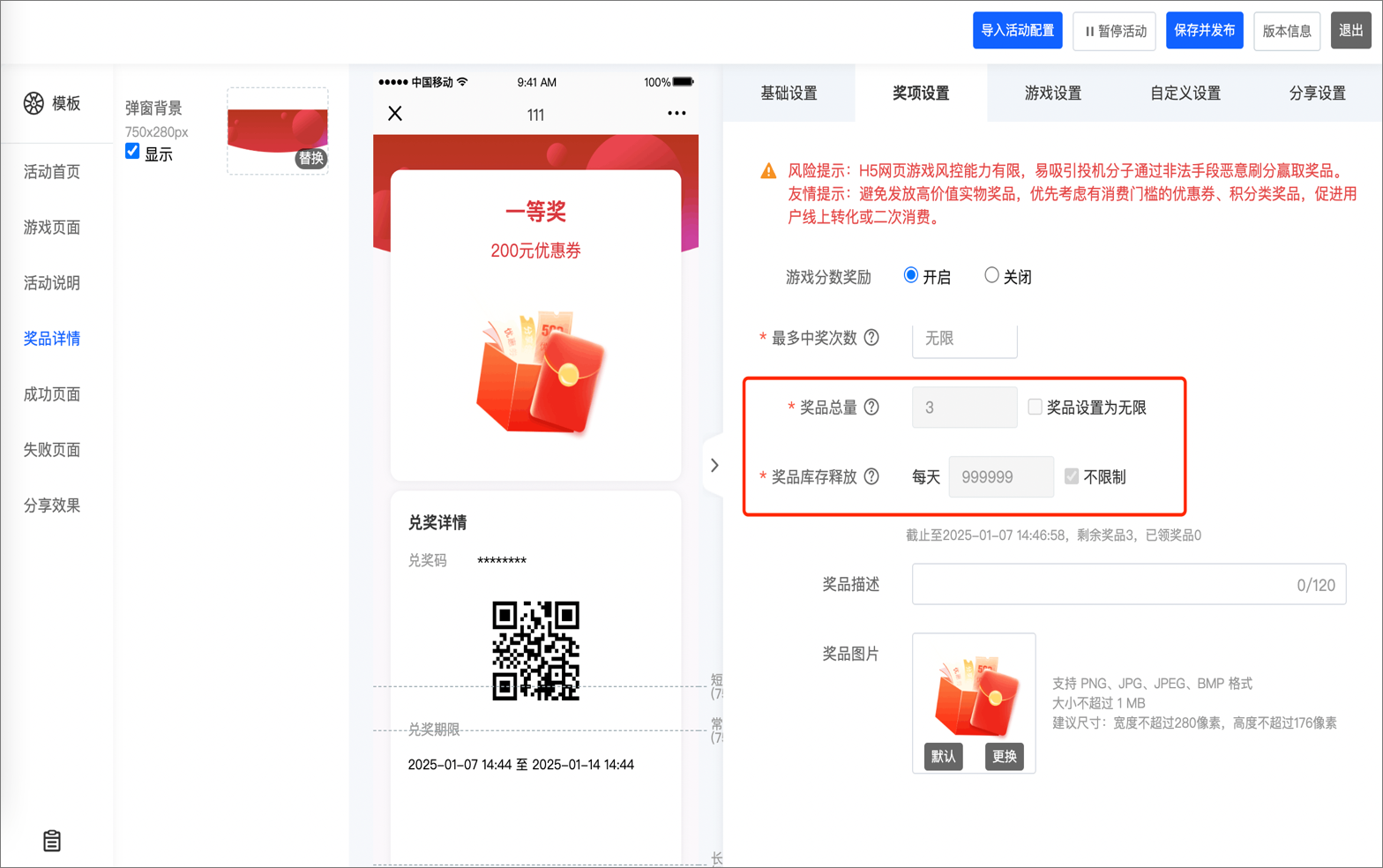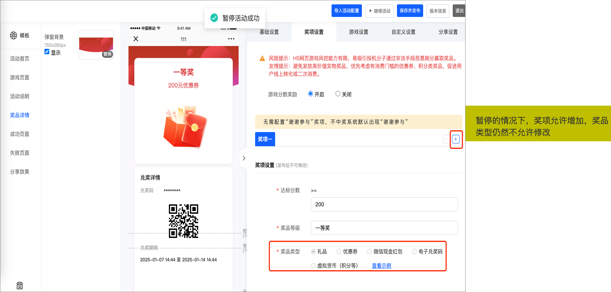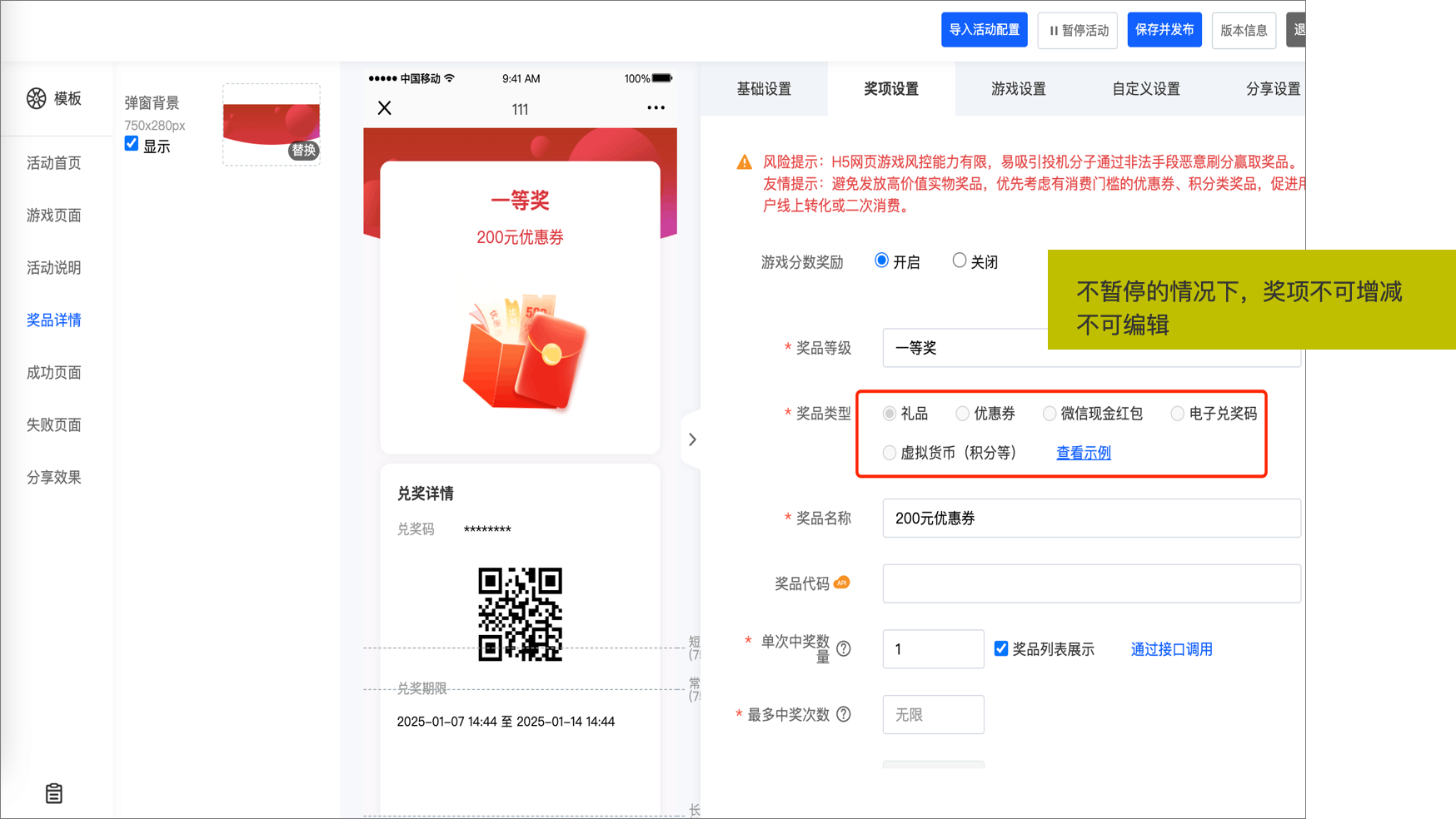 2、互动游戏作品,不暂停的情况下,奖项设置中的除了奖品类型、奖品总量、奖品库存释放,其余可修改;(参考抽奖作品的奖项设置);