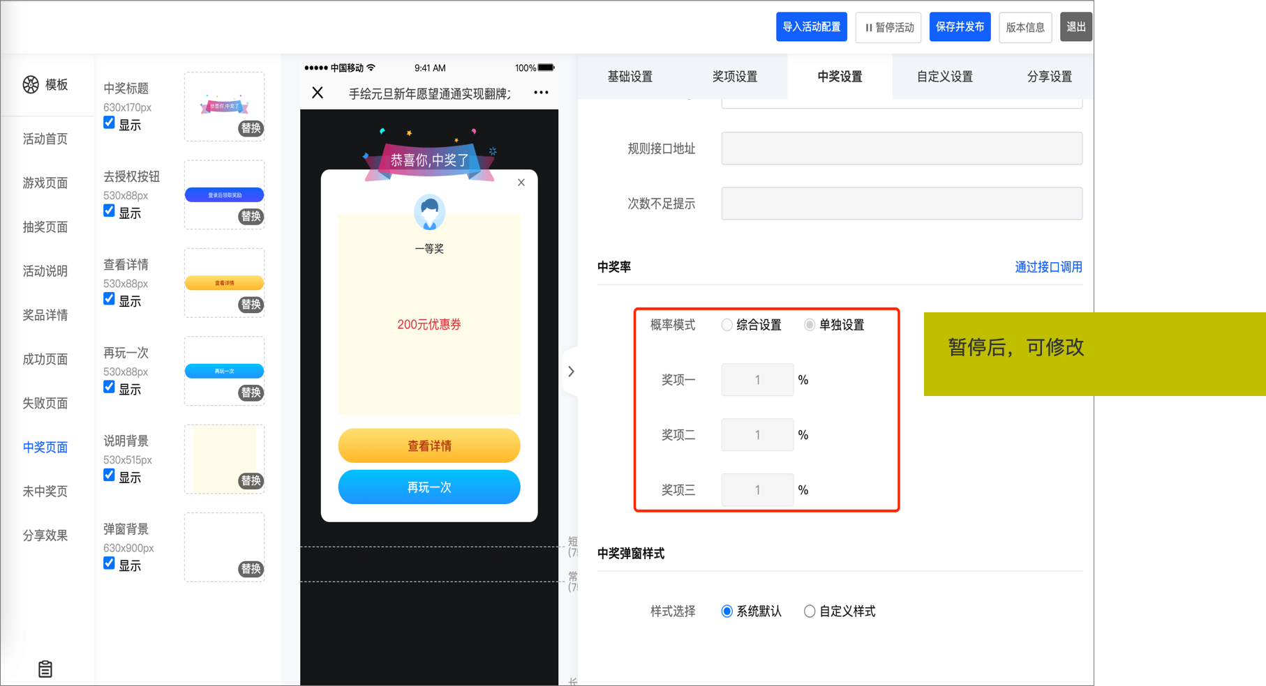 互动作品发布之后,在暂停情况下,可修改中奖设置中的中奖率‌。