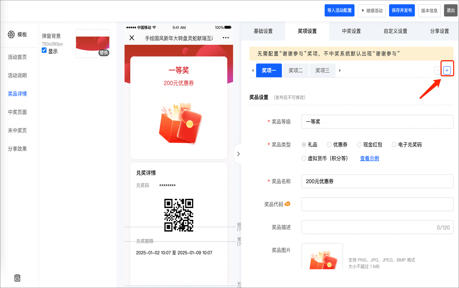 1、互动抽奖作品,暂停作品的情况下,奖项设置允许增加新奖品;