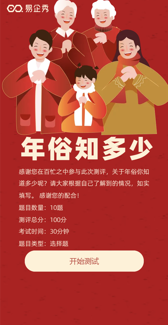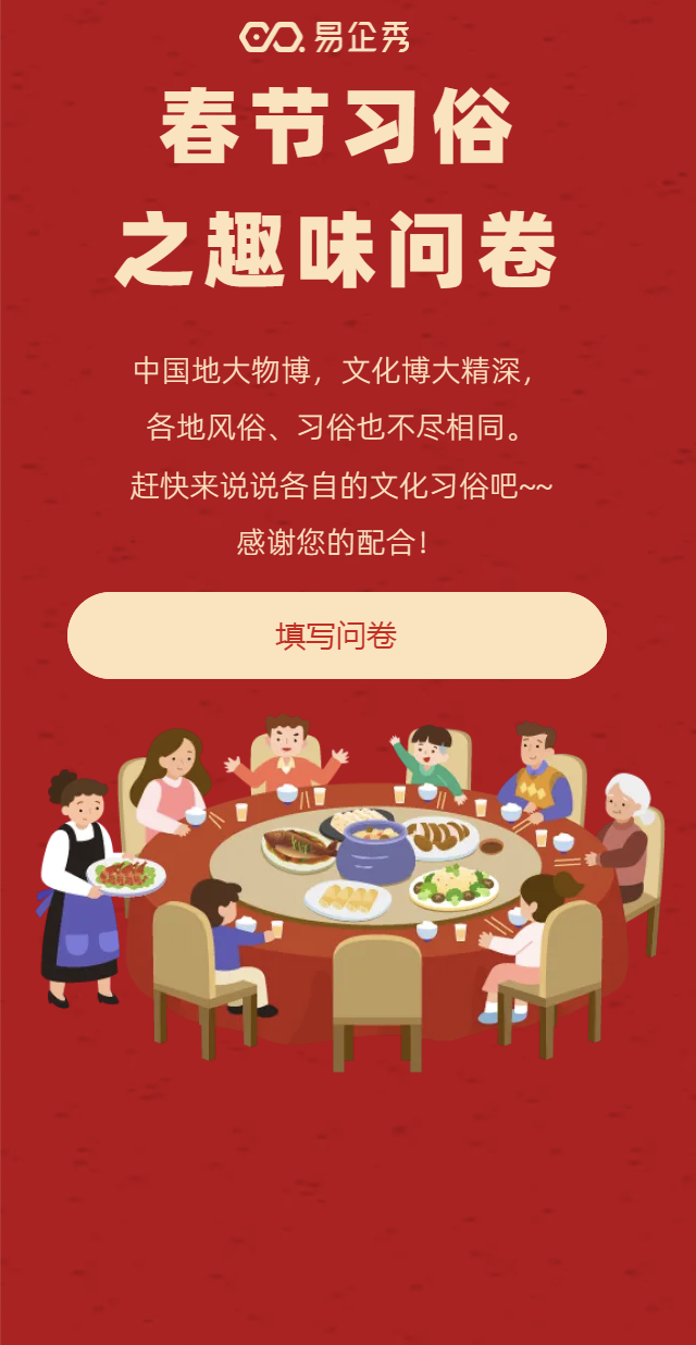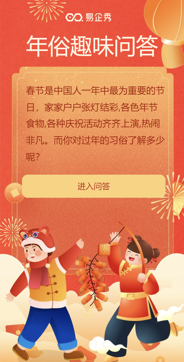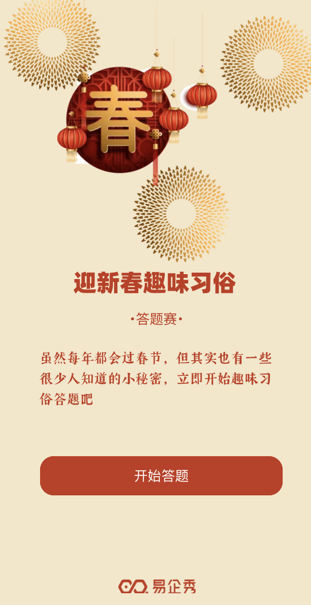 我们可以设计一系列关于春节习俗的题目,涵盖春节历史、传统活动、各地特色习俗等方面。用户可以通过易企秀H5或表单作品,在线参与竞赛。答题时间限制在一定范围内,根据答题的分数、速度进行排名。
