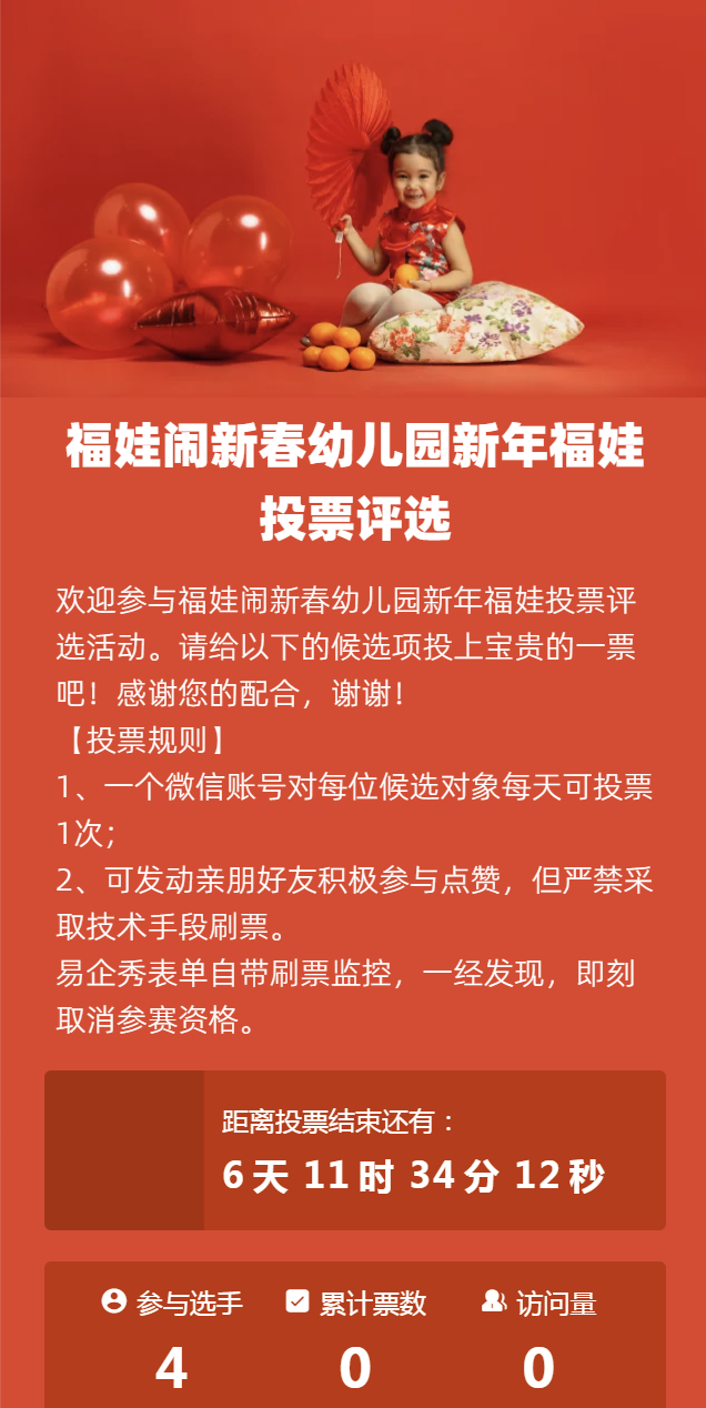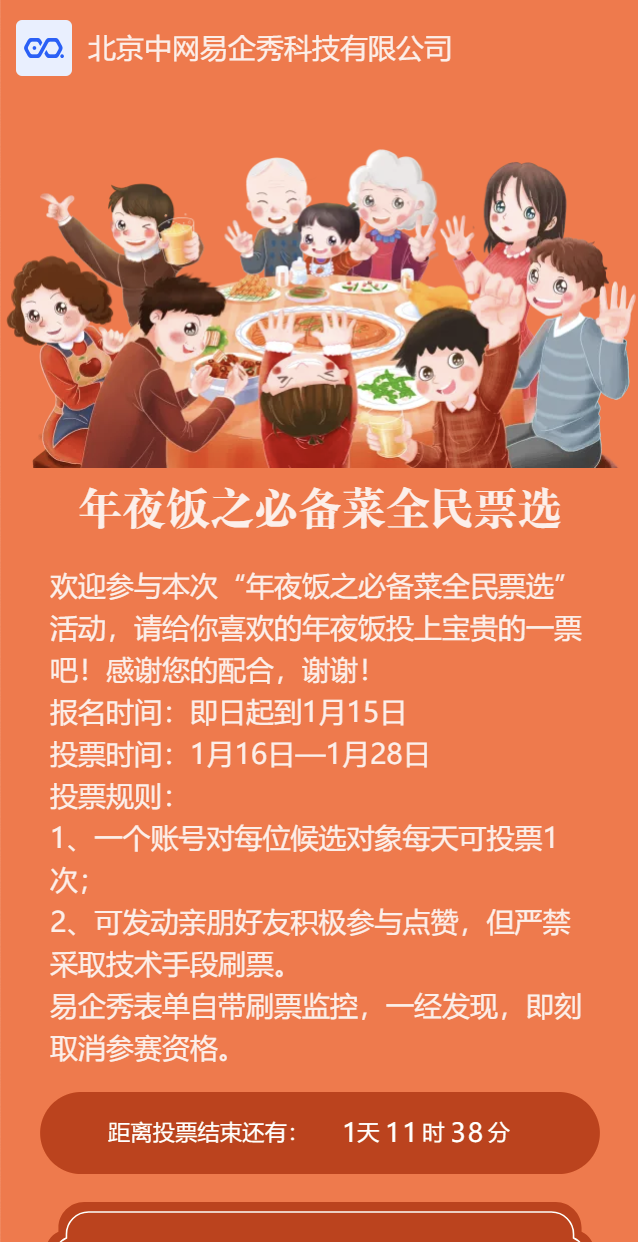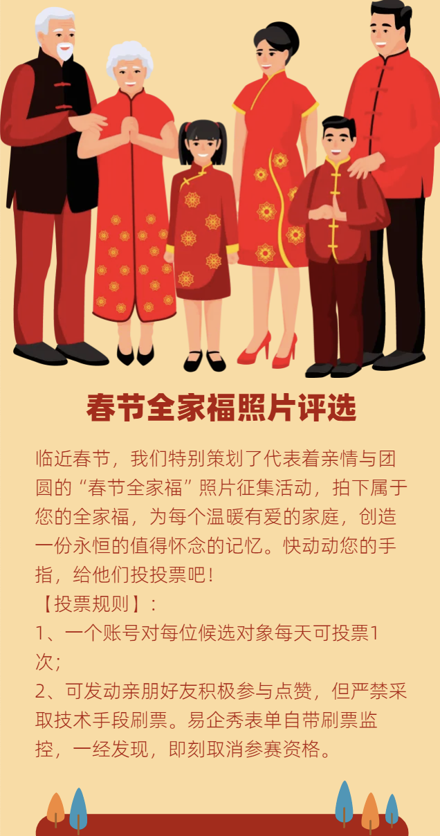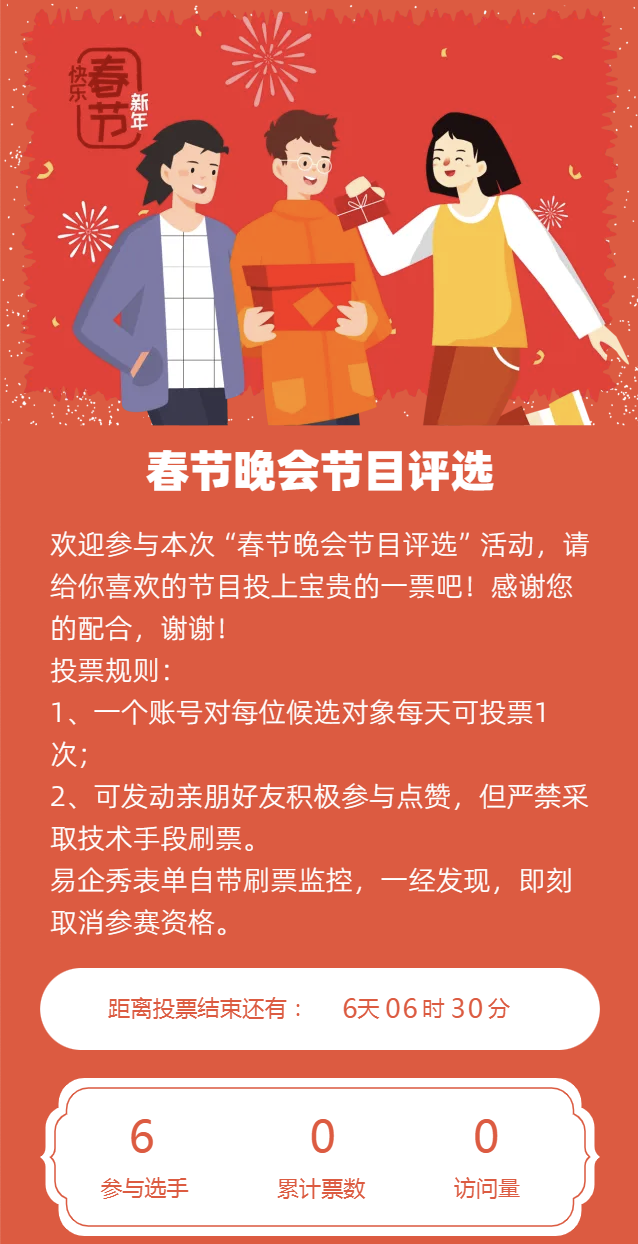 春节主题投票内容有很多,比如:晒年夜饭/晒全家福投票评选,春联评选、窗花作品评选、拜年视频投票等。