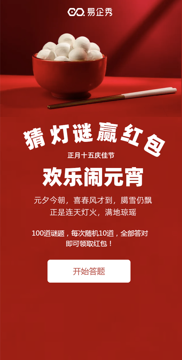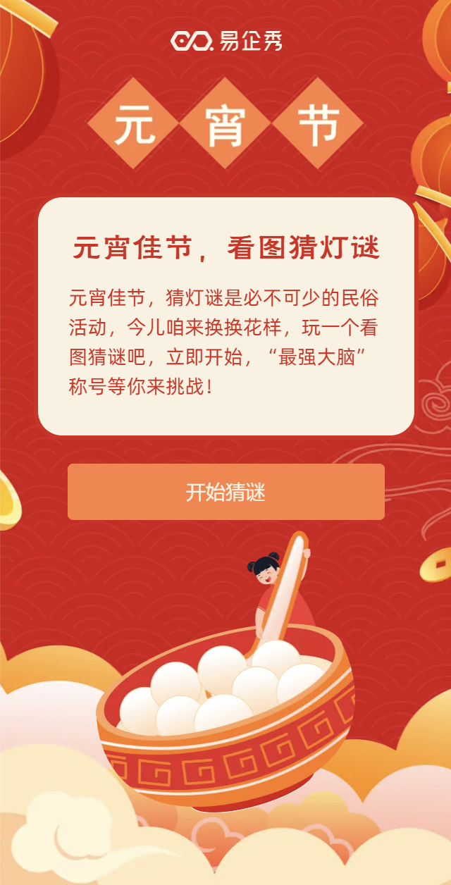 正月十五元宵佳节,是春节的尾声,也同样是一个欢乐祥和的节日,猜灯谜作为元宵节传统活动之一,能够为节日增添浓厚的欢乐氛围。在线上开展猜灯谜活动,可以打破地域限制一起共襄猜谜的乐趣。