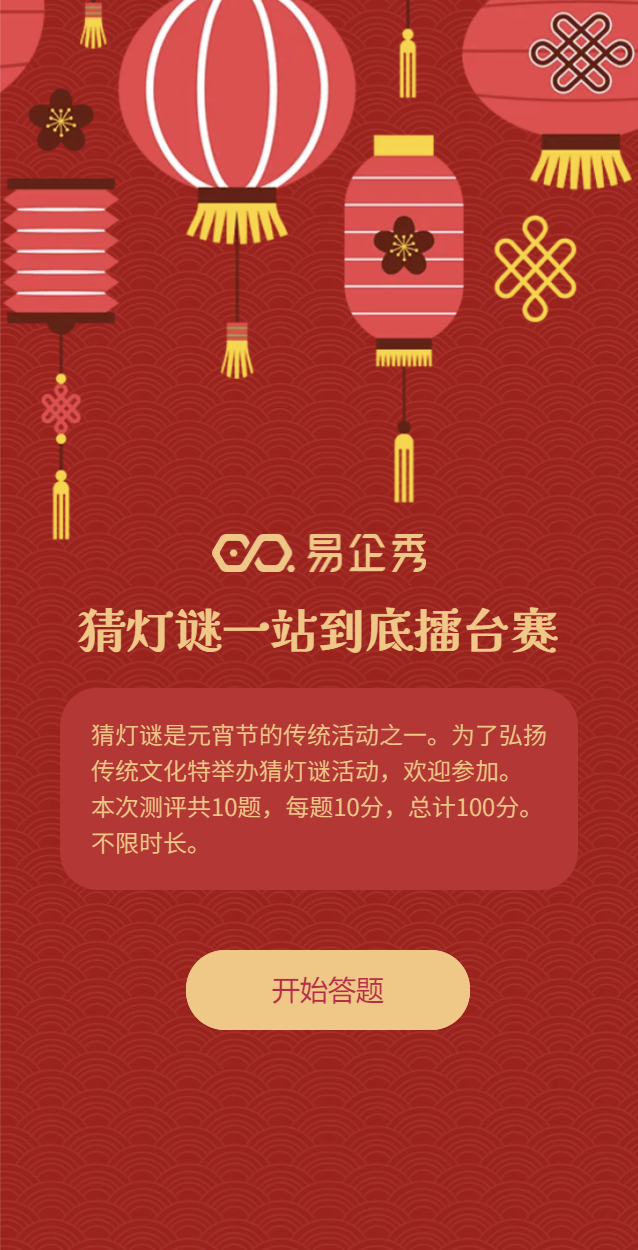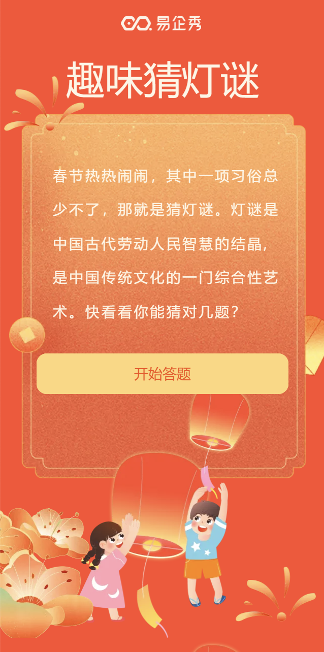 猜灯谜本质是一场答题活动,可以分为仅限公司内部人员参与,或面向外界参与不限制;还可以设计为看图猜谜、填空题猜谜、选择题猜谜的形式,实现不同的线上猜谜方式;准备好谜面、谜底,再讲答题时间限制、奖励等设置好后,活动即可开启。