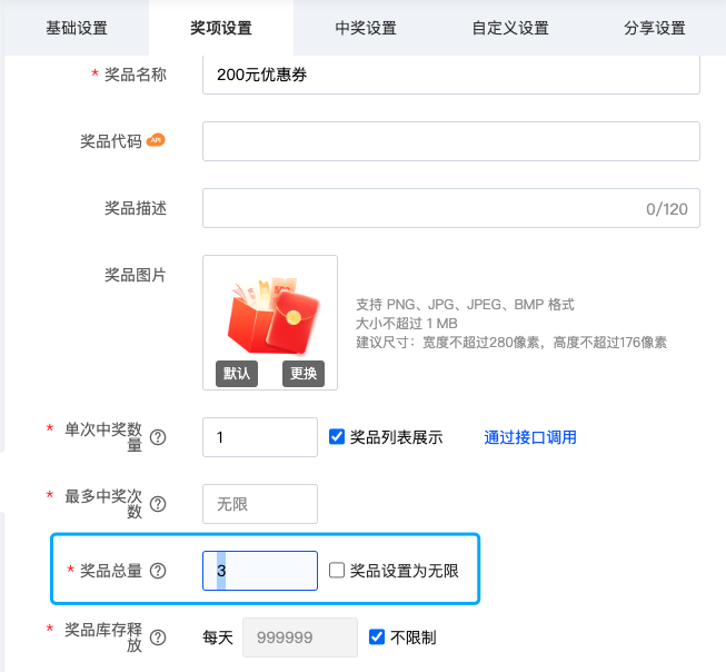 奖项设置-奖品总量:代表整场活动中,该奖项的”库存总量“,若库存不足将导致无法发出奖品;