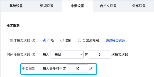 奖项设置-最多中奖次数:代表“单个”户在整场活动中,这个奖项最多的可中奖次数。