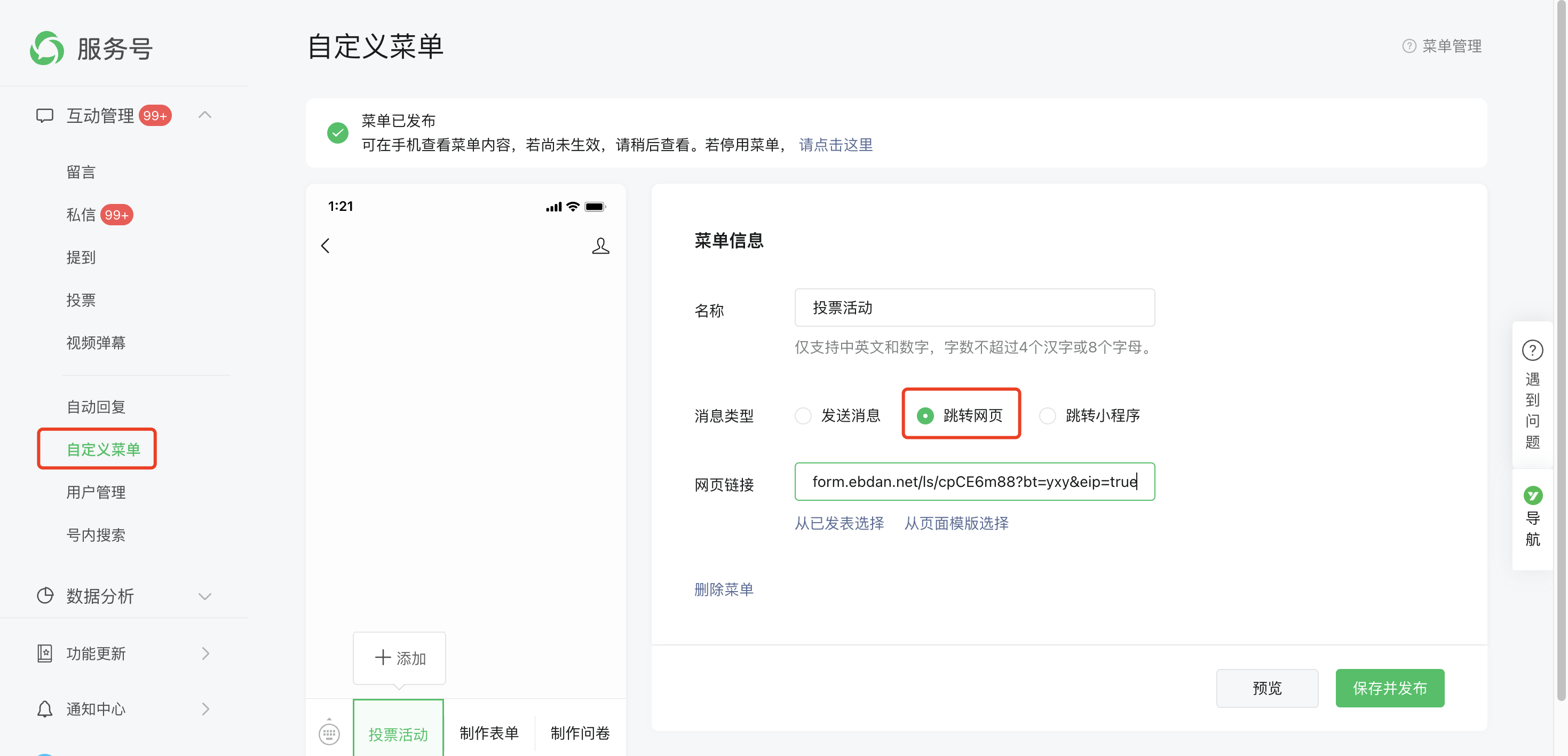 在“菜单内容”中选中“跳转网页”,并输入“页面地址”(粘贴从第一步中复制来的链接),点击“保存并发布”。