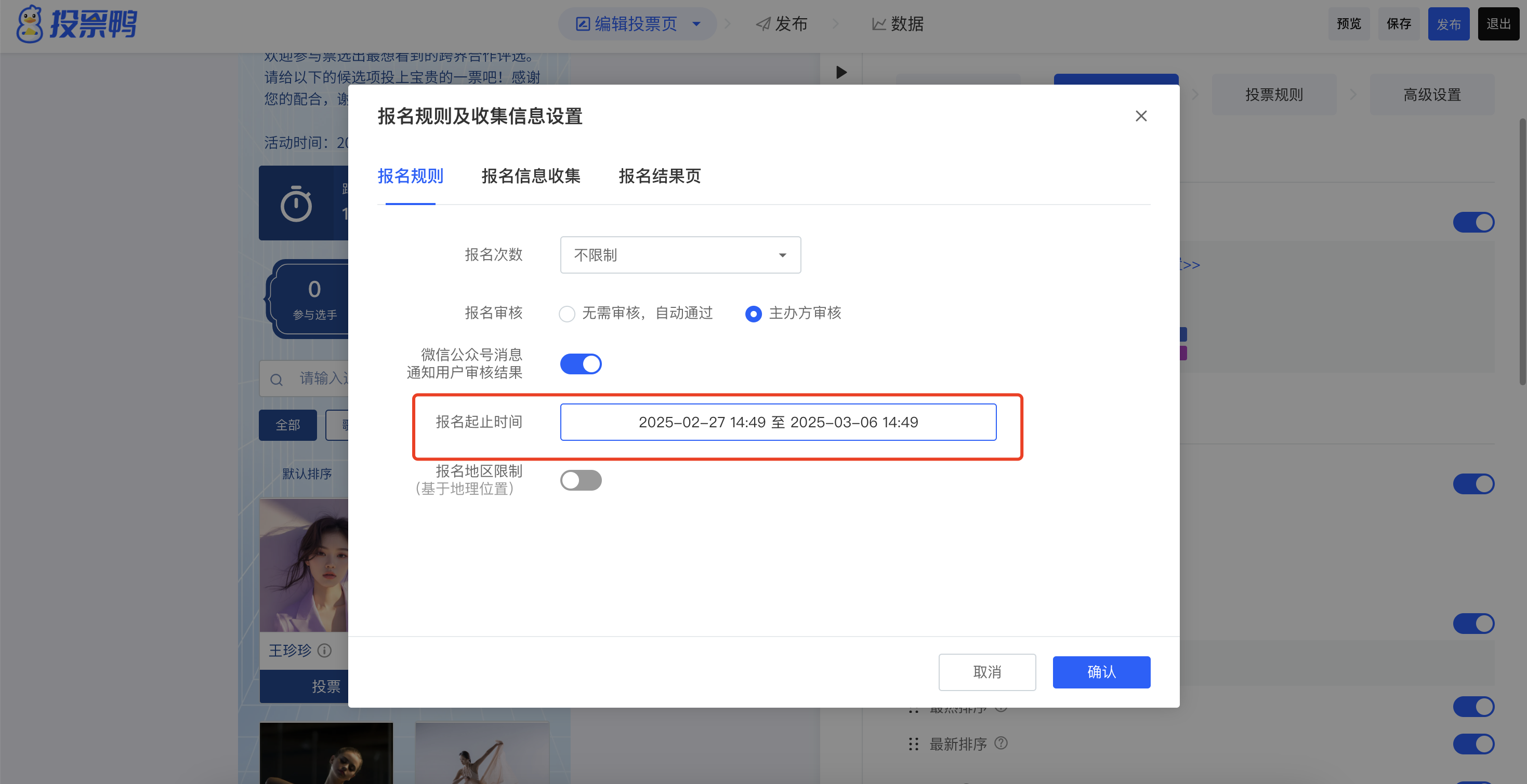 一场投票活动,我们可以分别设置报名的时间和开始投票的时间。以此实现让大家先进行报名,报名截止后,再进行投票的活动形式。