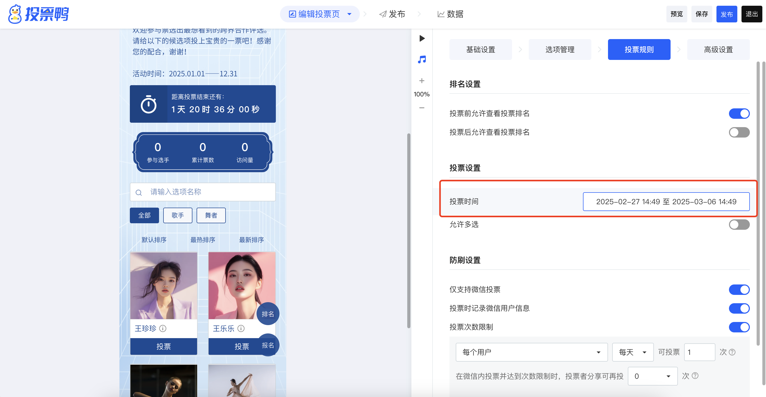 【投票时间】设置的地方,在编辑器--投票规则--投票设置--投票时间中。