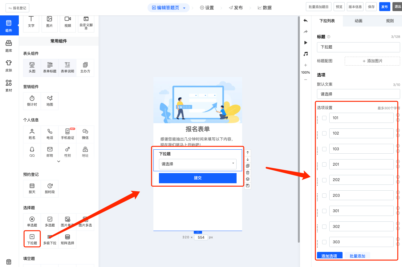①通过模板/空白创建打开表单编辑器→②选择问卷调查/报名登记/考试测评类型→③添加下拉题→④保存发布→⑤访客打开作品→⑥可通过搜索框搜索下拉选择框中的选项