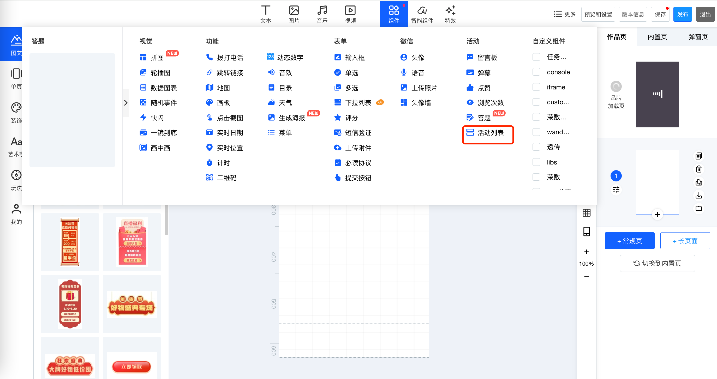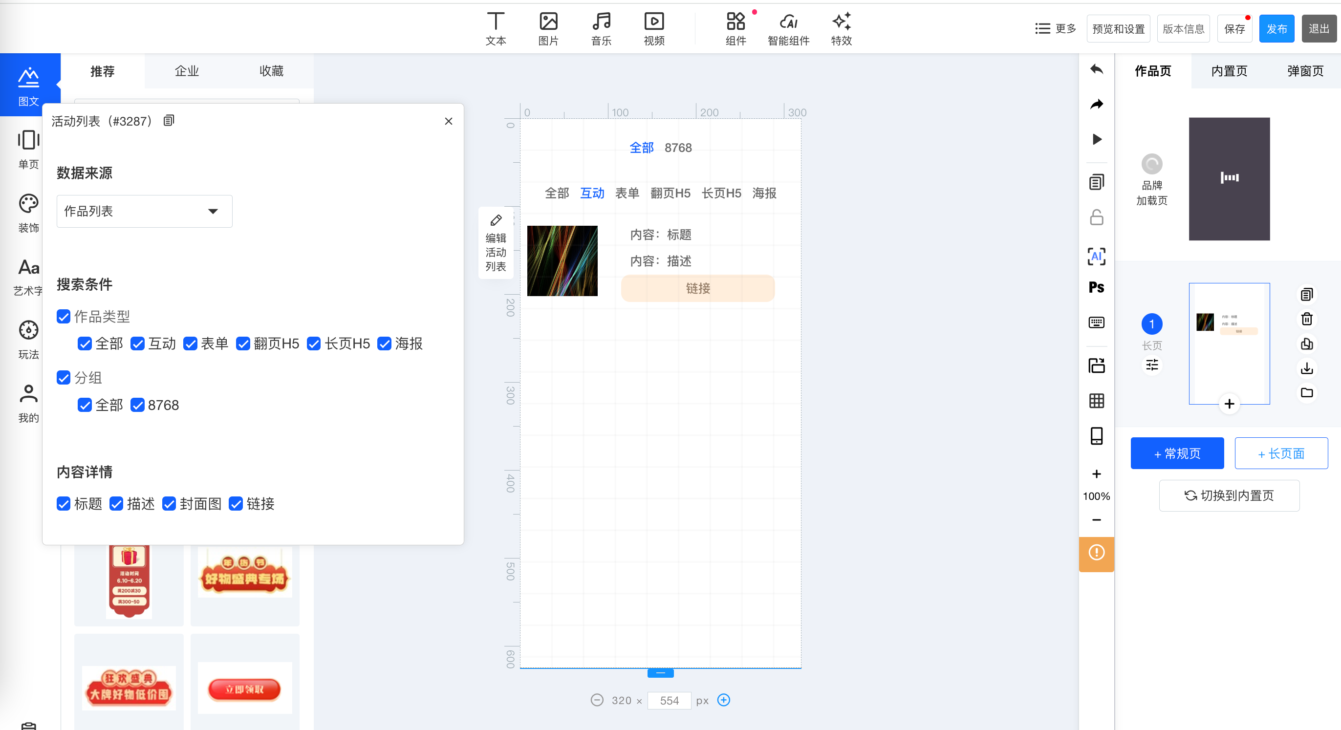 1.作品活动列表,方便嵌入其他客户端查看发布的作品;2.商品列表,方便展示客户商品库中的商品列表;3.稿件列表,融媒体客户稿件展示等等;