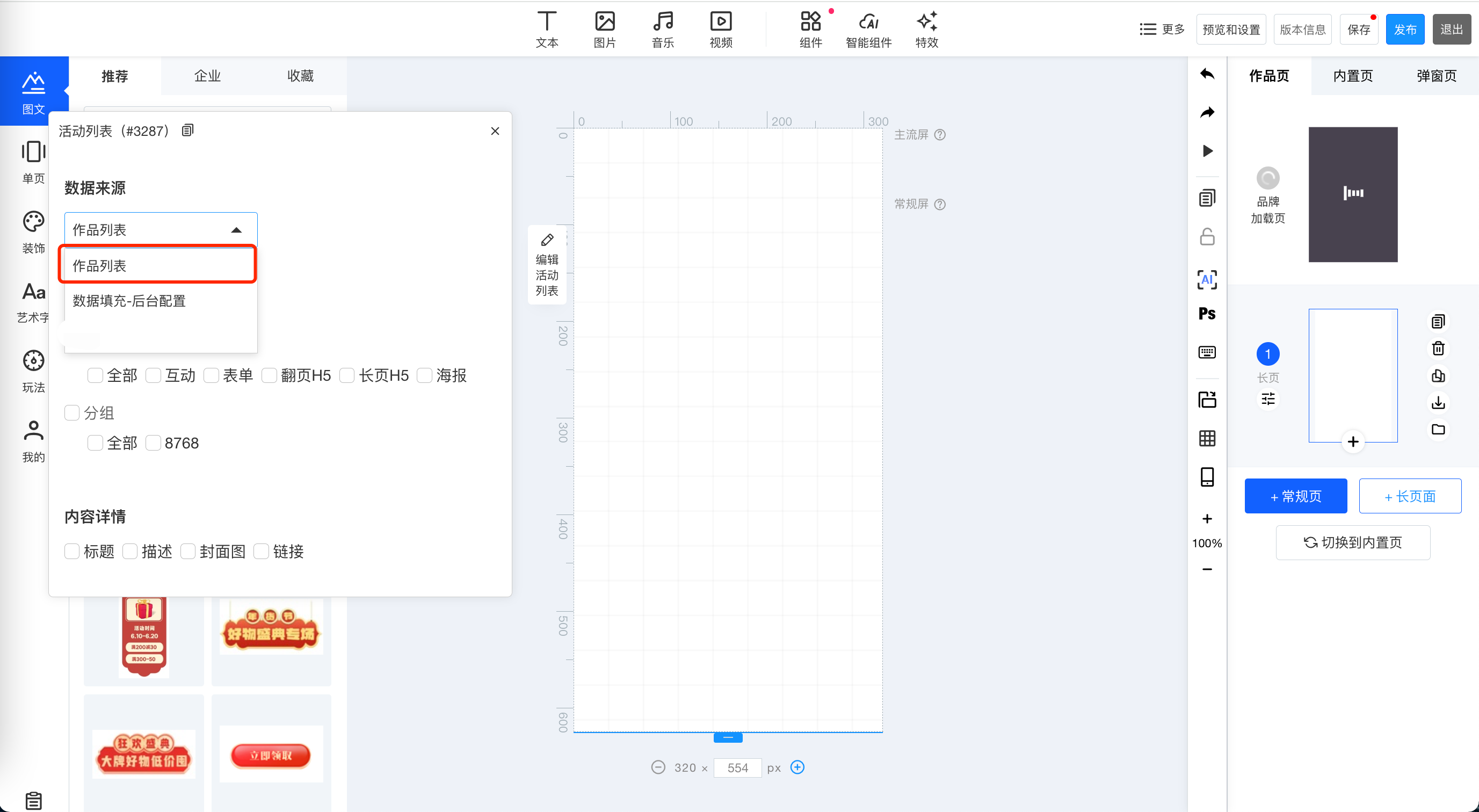系统默认设置了一个系统作品列表的接口,如果是展示本企业的企业作品列表,则无需在集成管理中进行配置,直接在编辑器中选择使用即可;